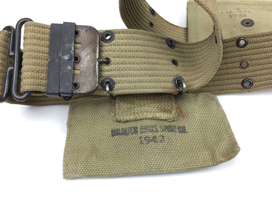 6/5/19 – This is an original WW2 U.S. Utility Belt, M1 Carbine dual magazine pouch and first aid pouch. These were issued to soldiers during WW2. The canvas belt is in excellent condition with an exterior “U.S.” ink stamp. The interior of the belt is maker stamped B.M. CO. Each pouch is ink stamped US and 1942 with maker stamps. The belt is completely in tact with no issues, rust, or pitting. All stitching, rivets, buckles and snaps are complete and functional.