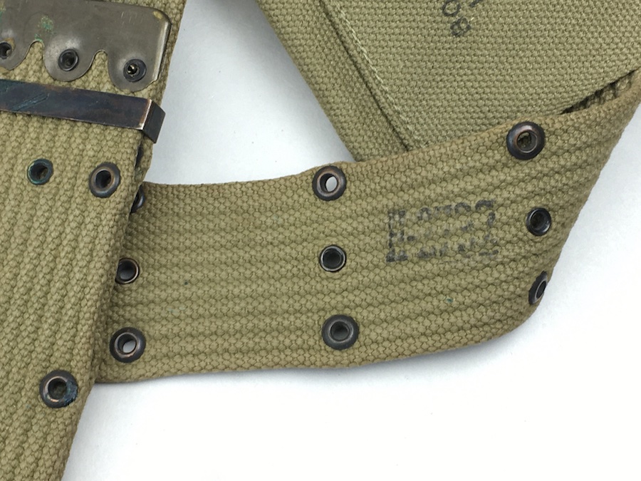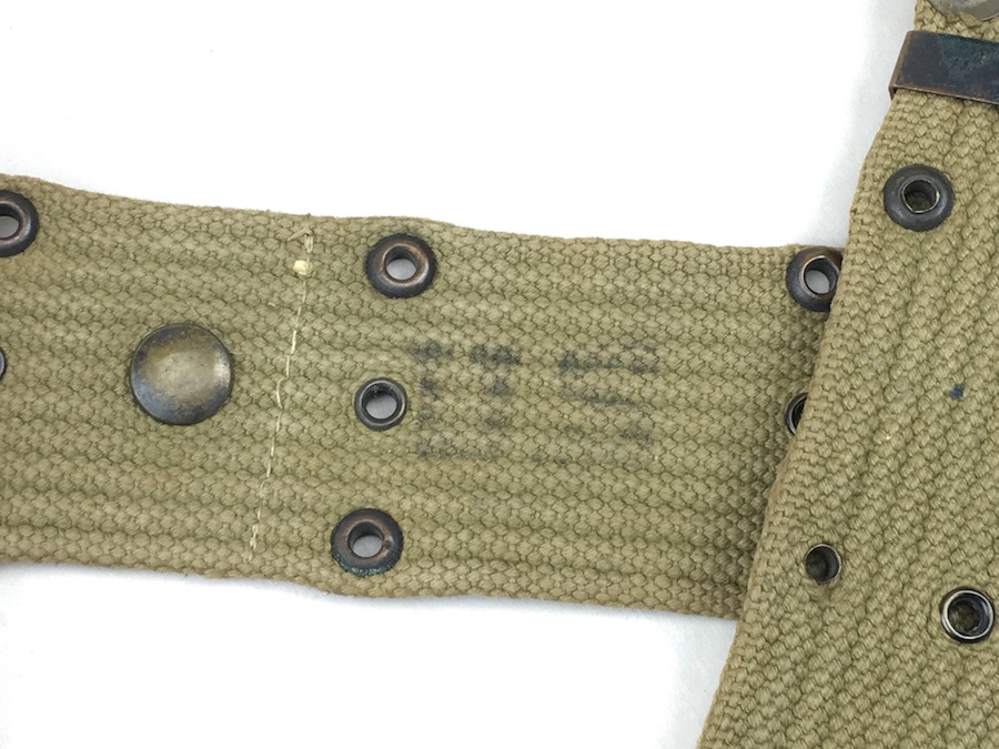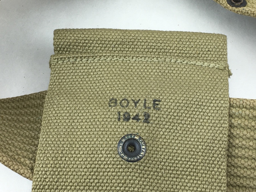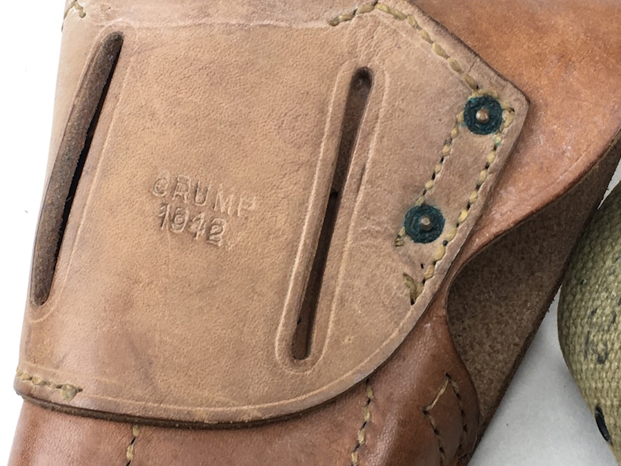 11/21/19 – Excellent, and original USGI utility belt, 1911 dual magazine pouch and a “CRUMP” 1911 holster. Holster is maker and date stamped on the back. Looks like this was a factory double stamp. Very clean holster with secure stitching and rivets. Pouch is ink stamped and dated. Belt is also ink stamped but somewhat faded. Everything is functional and all original.