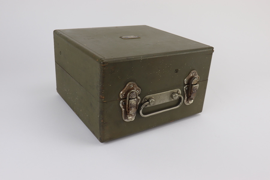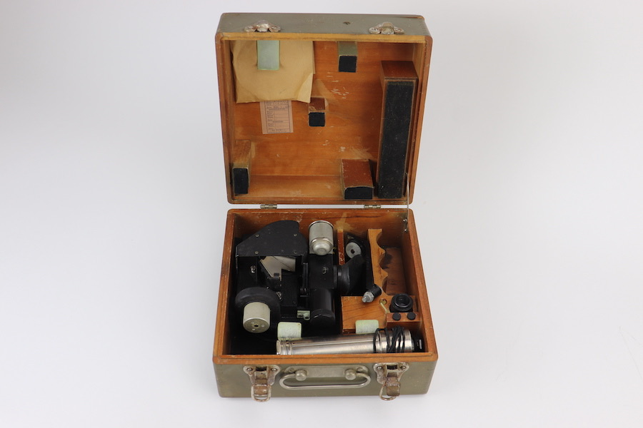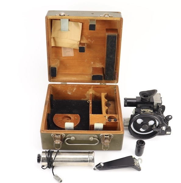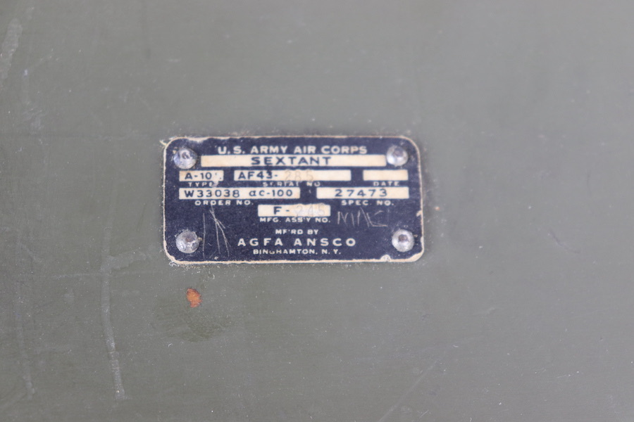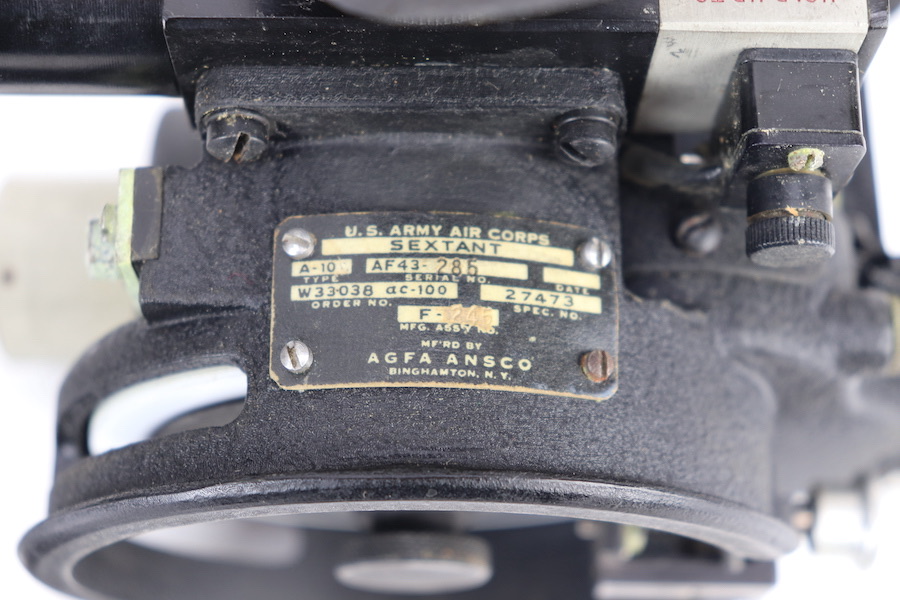 12/12/23 – Original and great condition. American WWII sextant model A10 manufactured by ANSCO, dated 1945. The sextant is inside the original wooden carrying case. Both the case and sextant are a taged ‘U.S. Army Air Corps’ that gives information such as sextant type and serial number. The A10 sextant was one of the most widely used sextants in the Army Air Forces and remained in use through the 1950s. Complete except for instructions. Functionality is un-known.