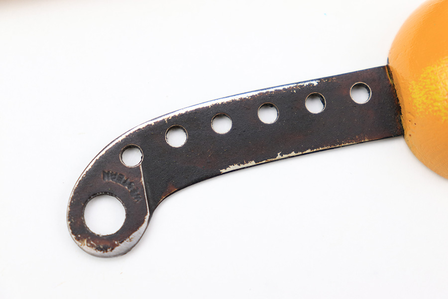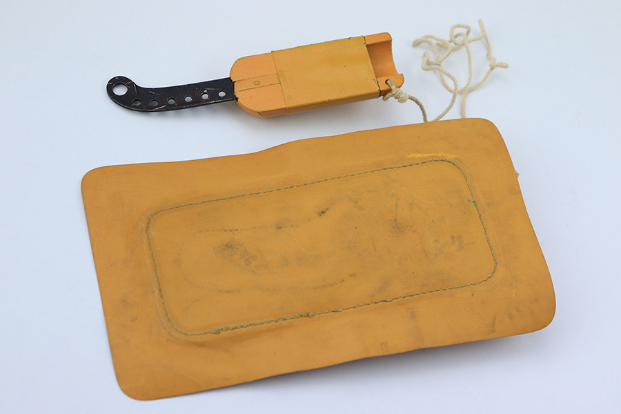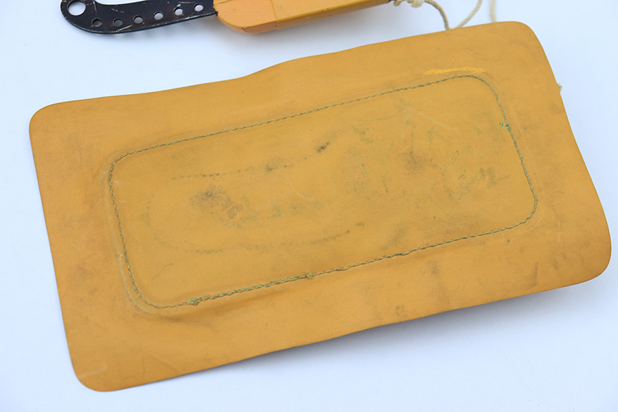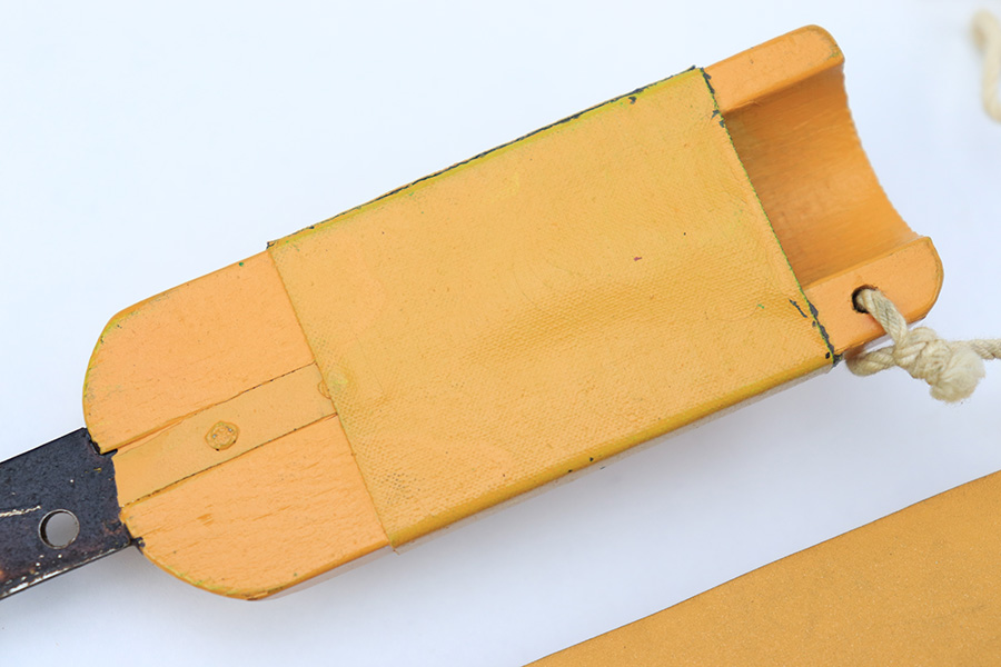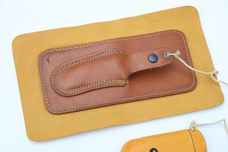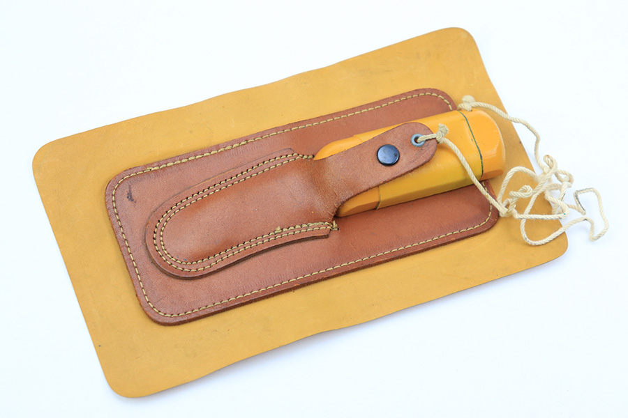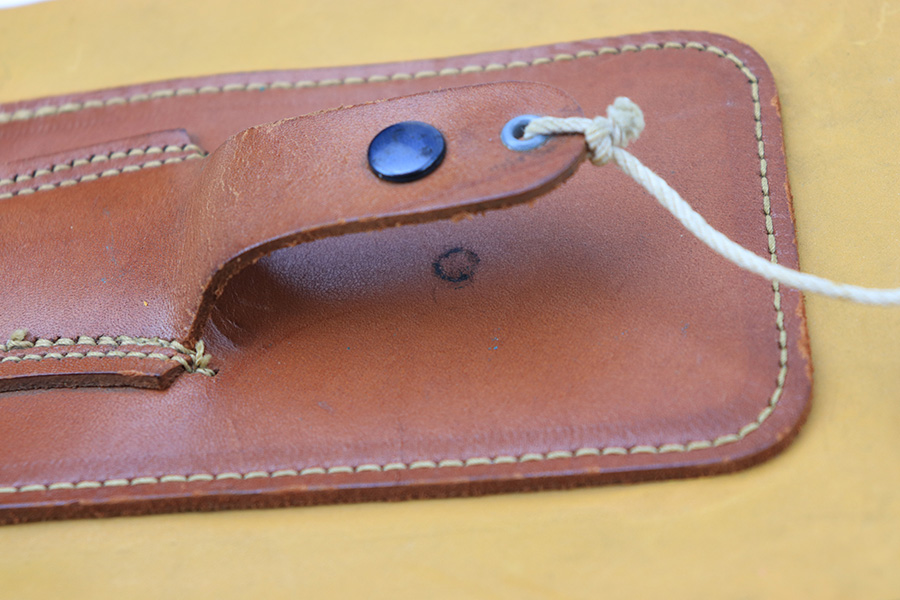 7/7/22 – This is an original WW2 era USAF floating “raft knife” or survival tool. The blade is maker marked by Western as shown. This is a complete example (which is becoming harder to find) with the original floatation plastic “paper”, leather sheath, wood handle, and utility blade.