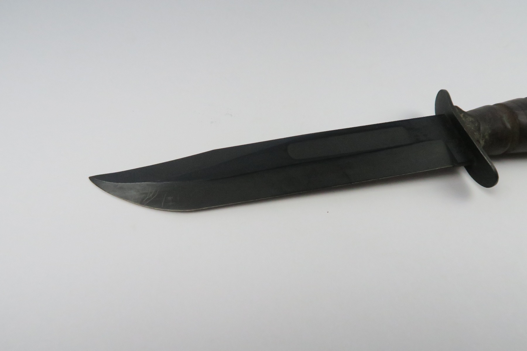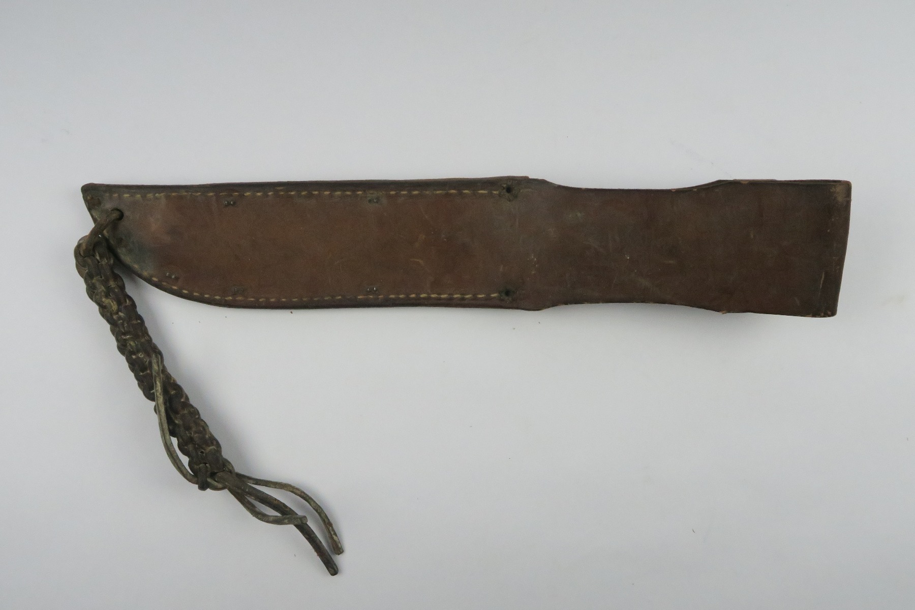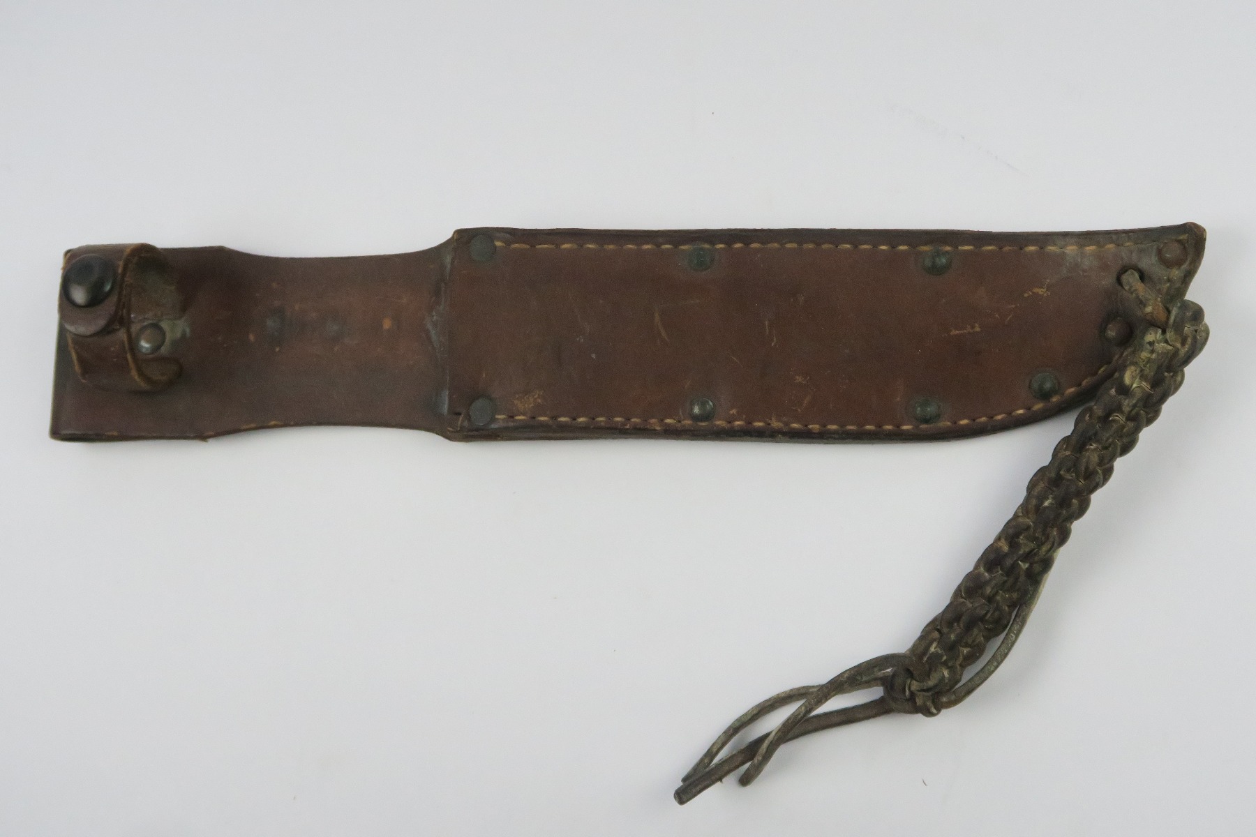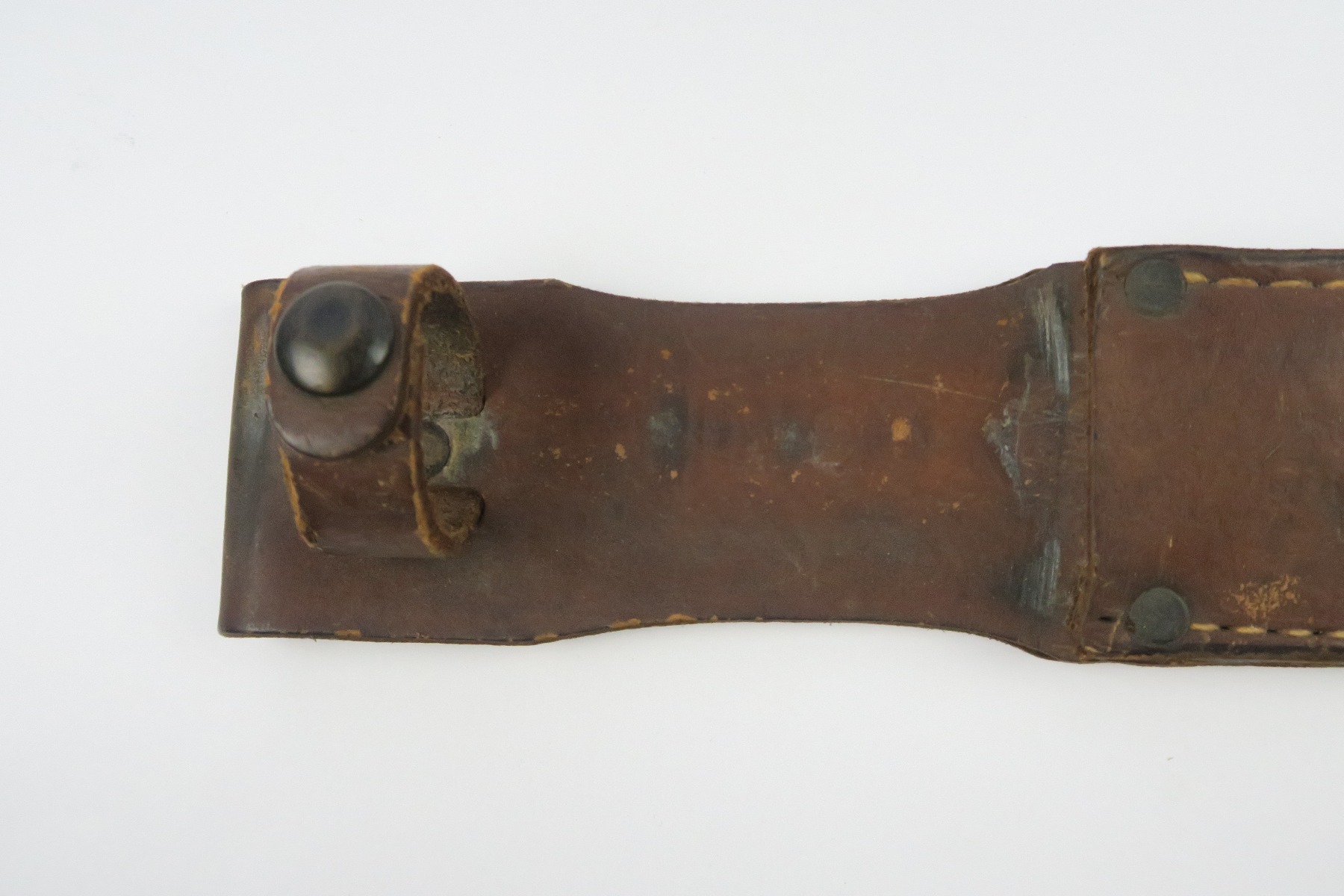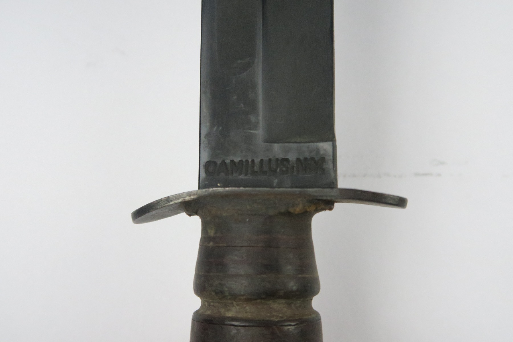1/24/18 – This is an original WW2 US Marine Corps combat knife. The blade is stamped USMC and “Camillus NY”, which is the earlier variation used in the first year of production. This was later changed to hilt stamps in 1944. The blued blade is in excellent condition with no rust, pitting, or signs of sharpening. The leather handle is original and in tact. The original leather scabbard is also in great condition with only minor aging and use wear. Guaranteed original and authentic.
