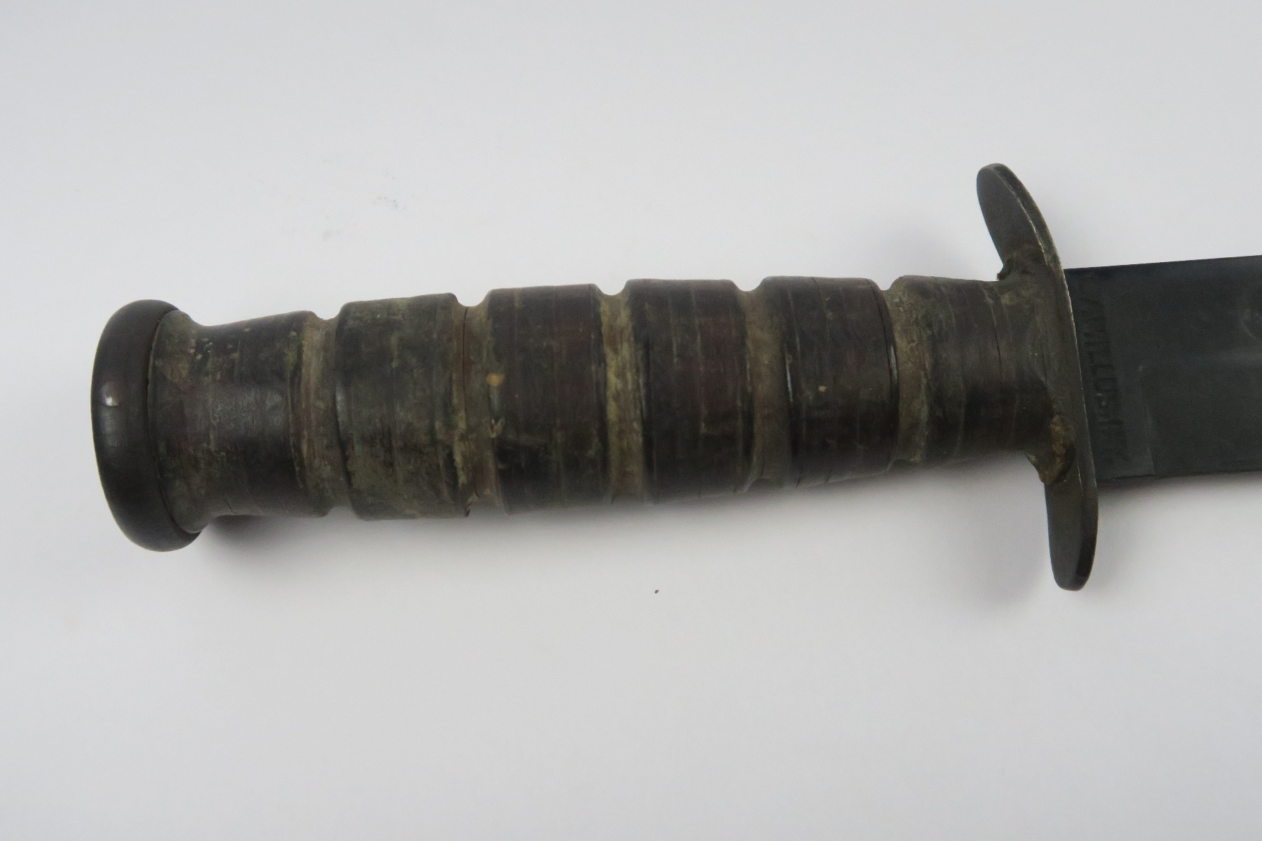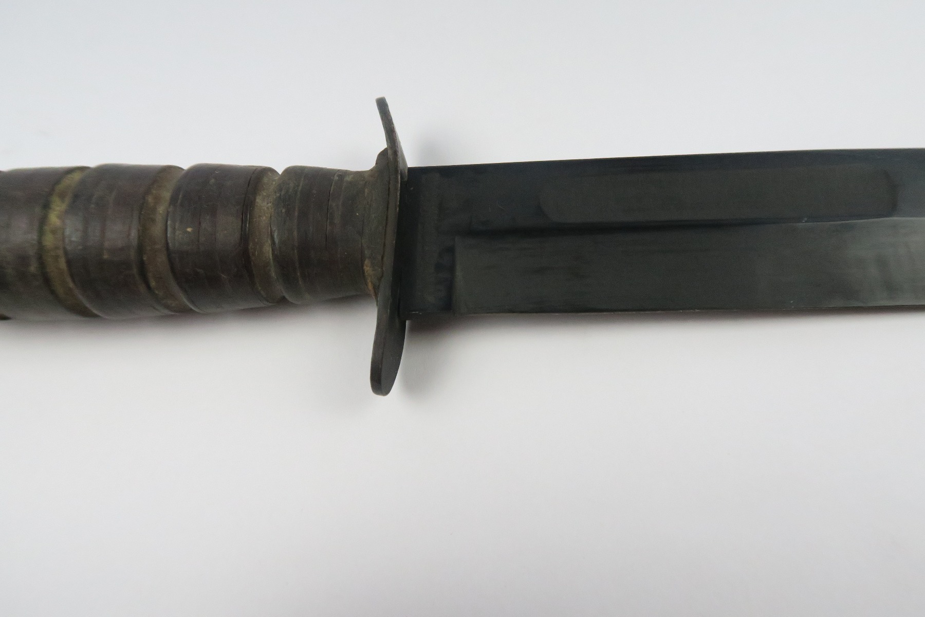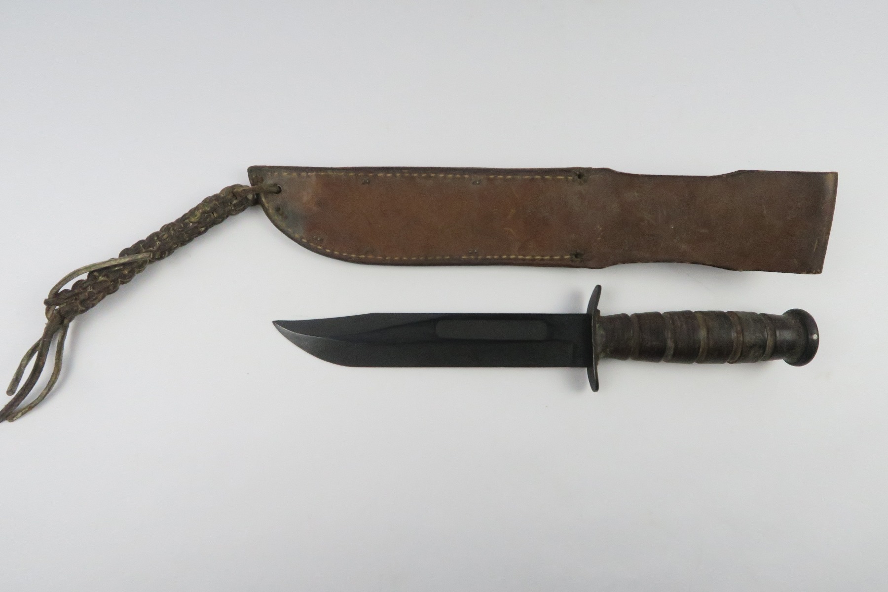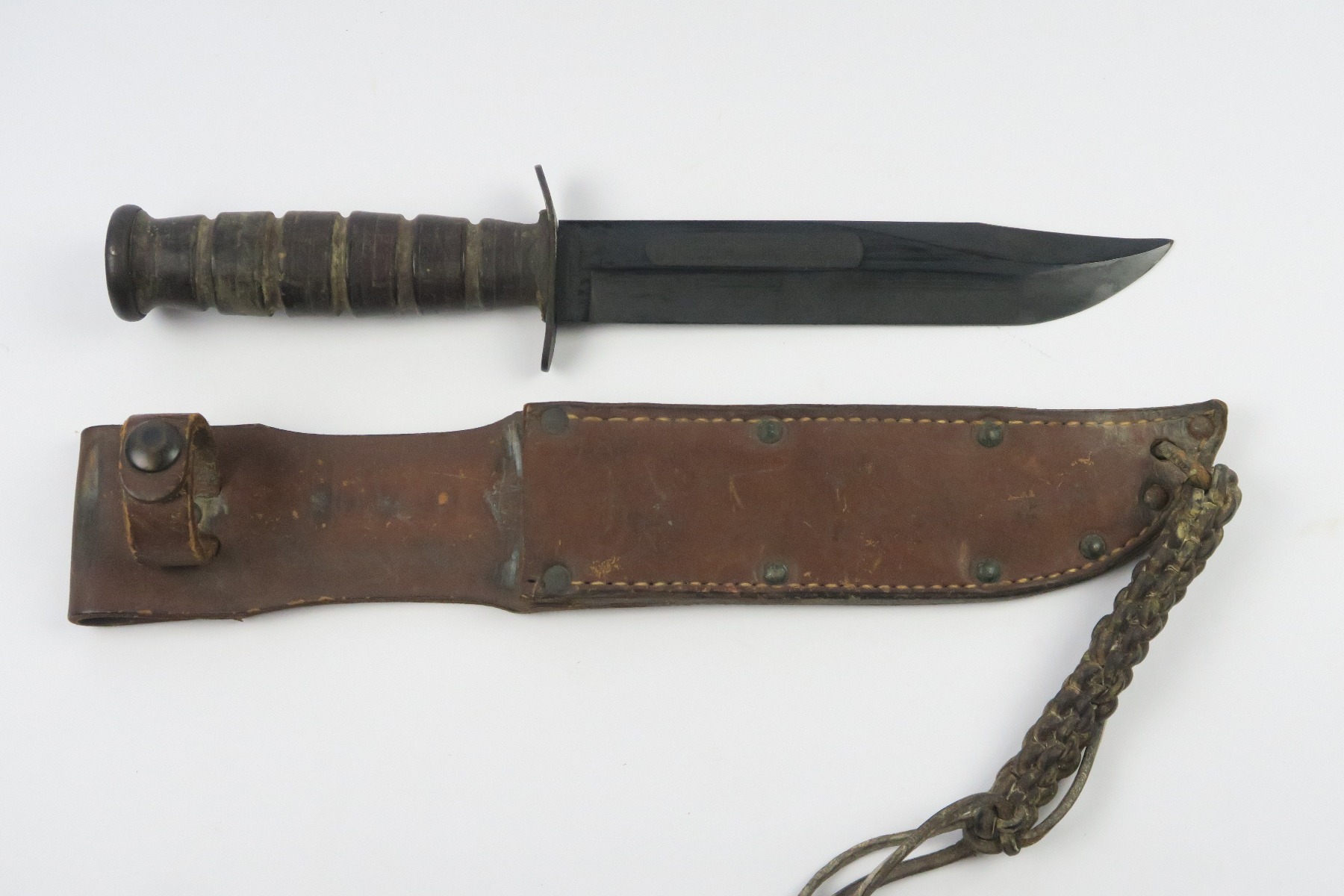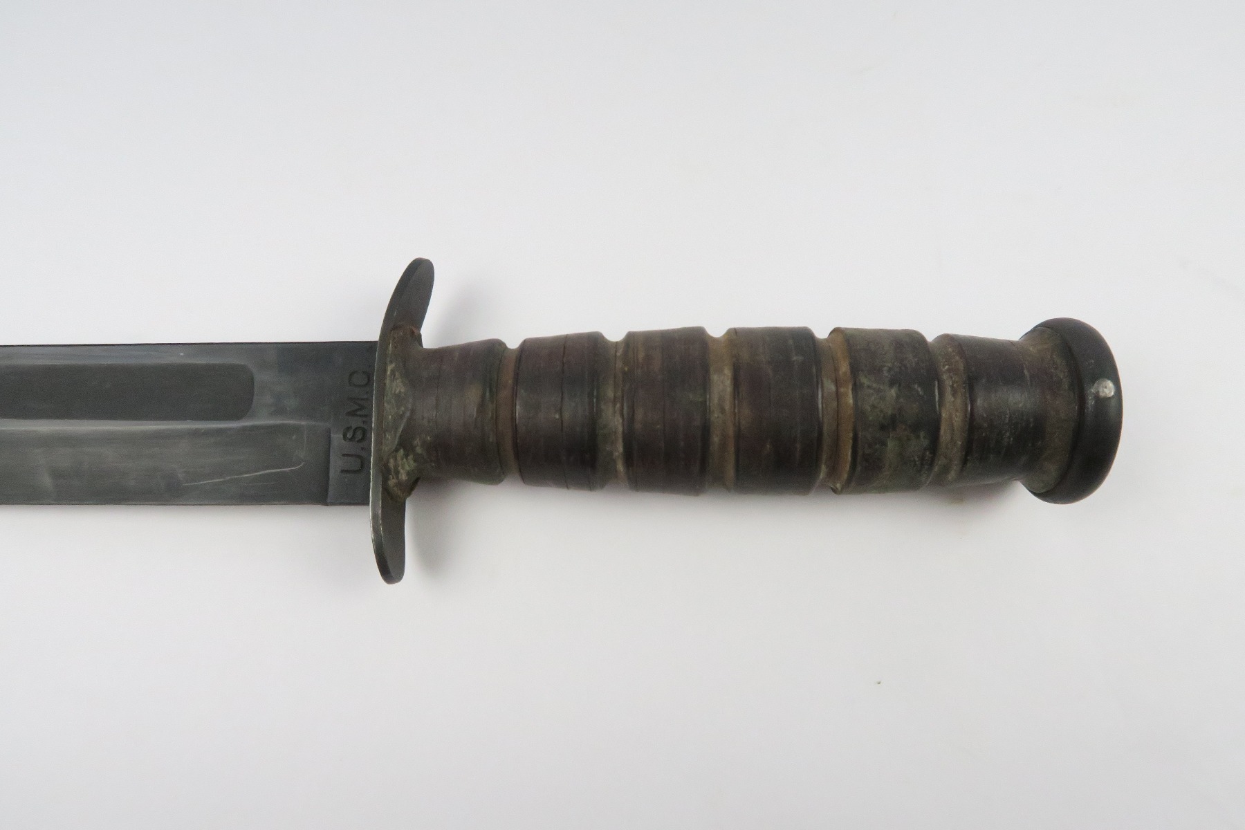 1/24/18 – This is an original WW2 US Marine Corps combat knife. The blade is stamped USMC and “Camillus NY”, which is the earlier variation used in the first year of production. This was later changed to hilt stamps in 1944. The blued blade is in excellent condition with no rust, pitting, or signs of sharpening. The leather handle is original and in tact. The original leather scabbard is also in great condition with only minor aging and use wear. Guaranteed original and authentic.