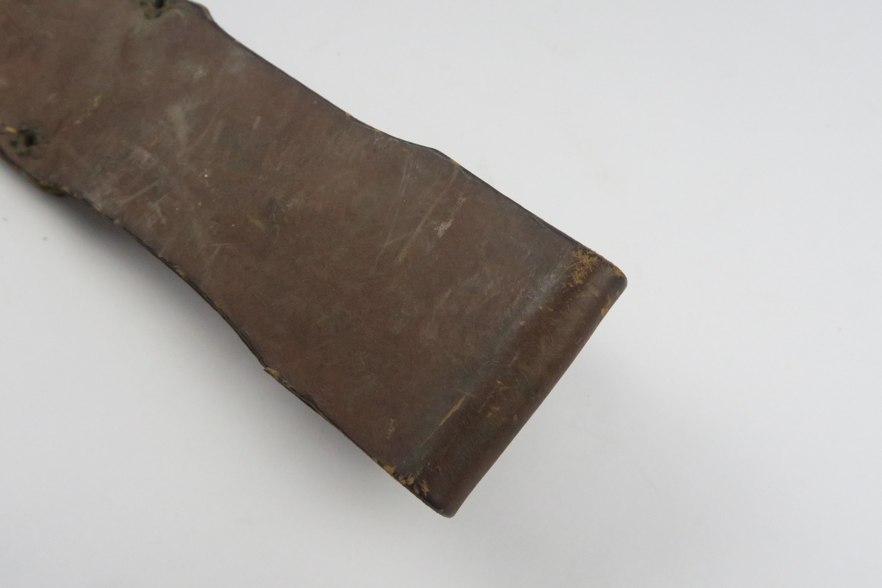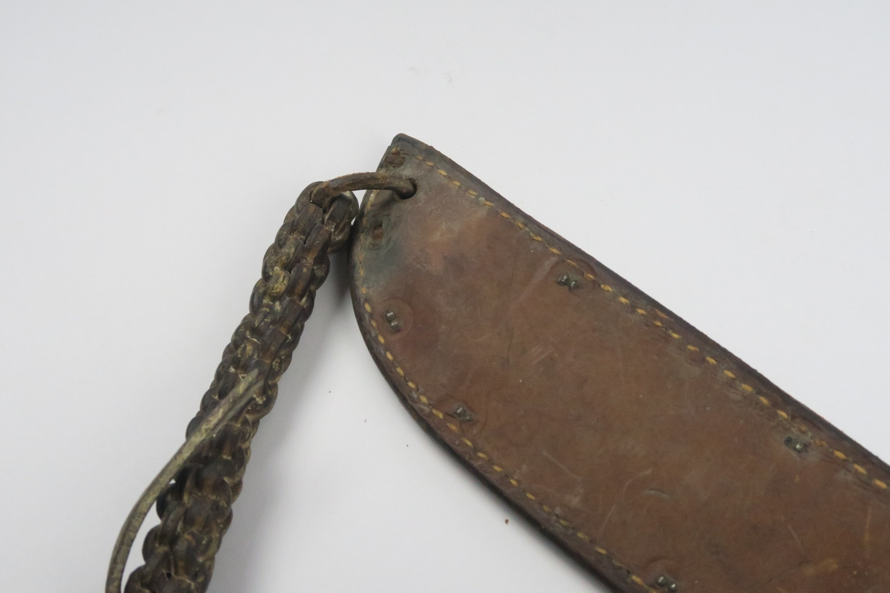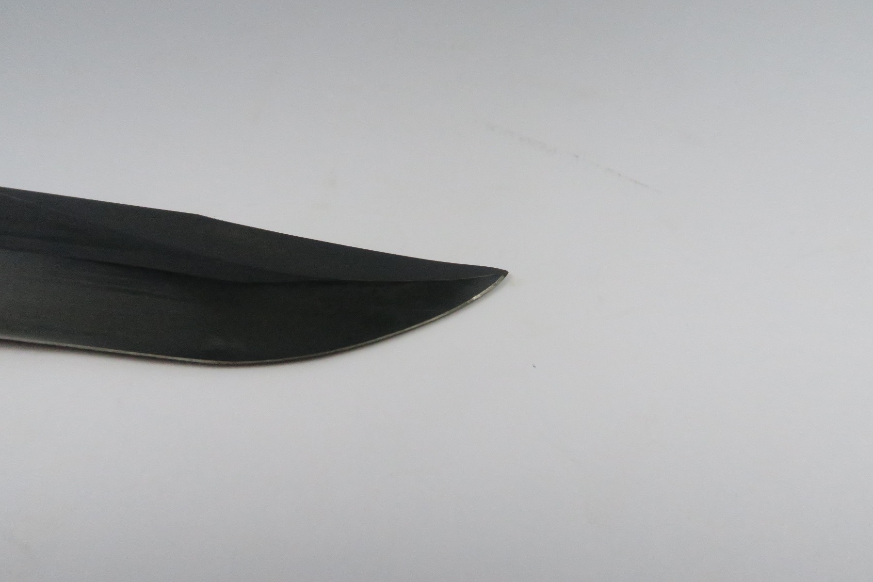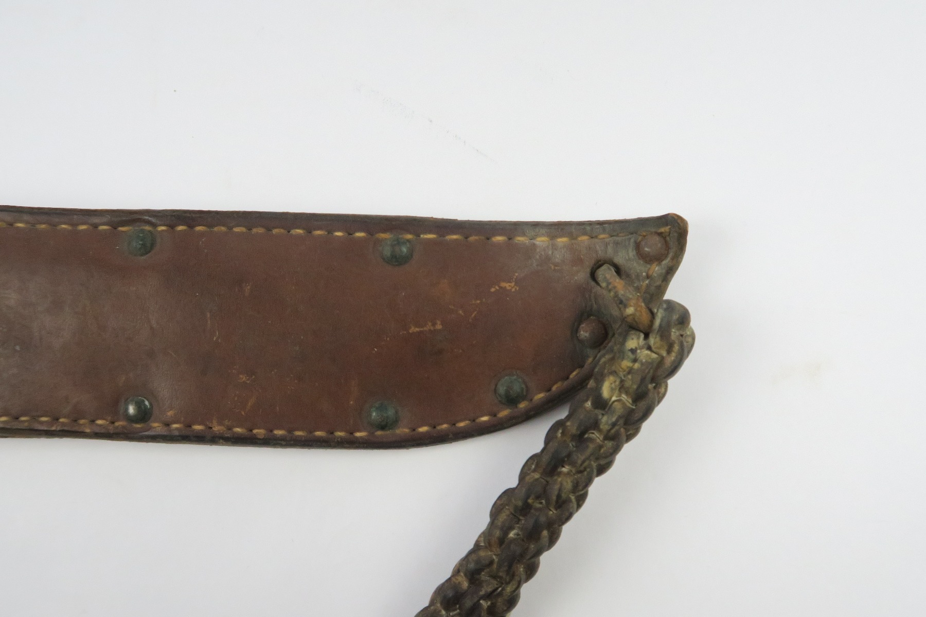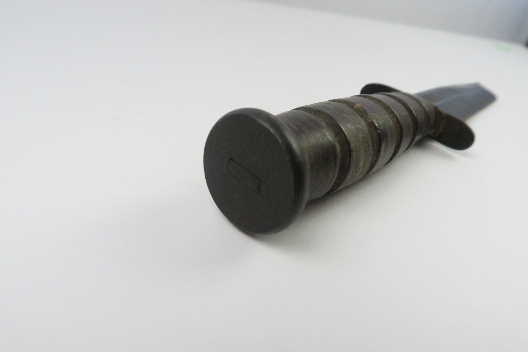 1/24/18 – This is an original WW2 US Marine Corps combat knife. The blade is stamped USMC and “Camillus NY”, which is the earlier variation used in the first year of production. This was later changed to hilt stamps in 1944. The blued blade is in excellent condition with no rust, pitting, or signs of sharpening. The leather handle is original and in tact. The original leather scabbard is also in great condition with only minor aging and use wear. Guaranteed original and authentic.