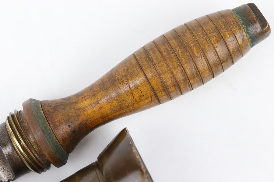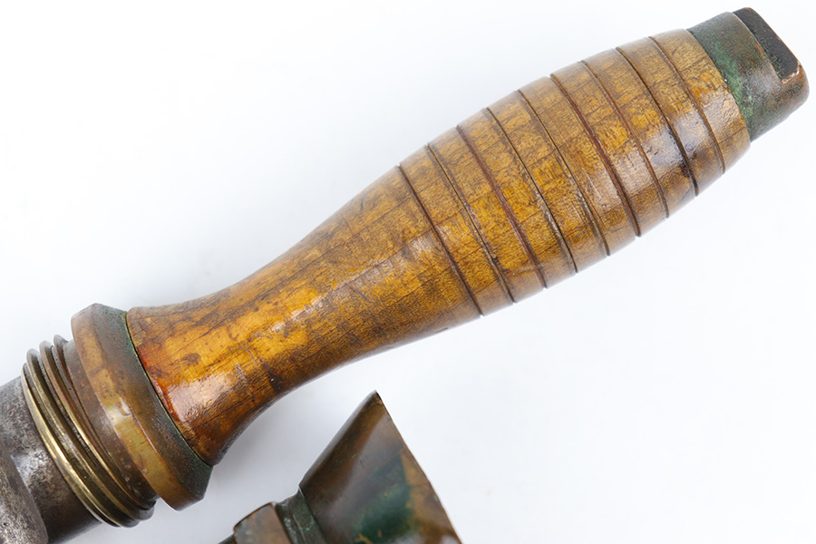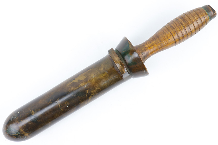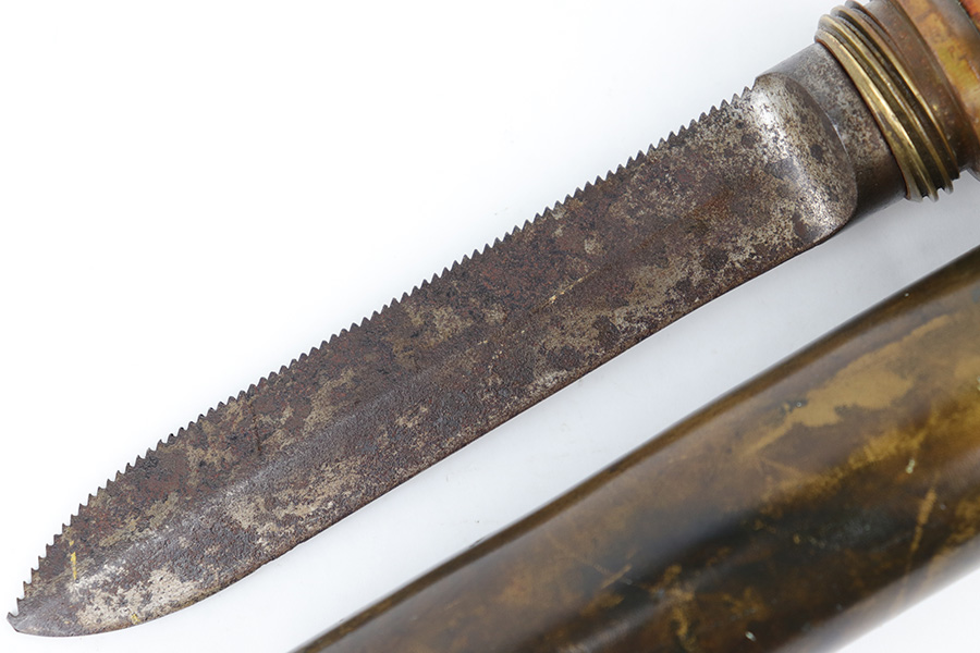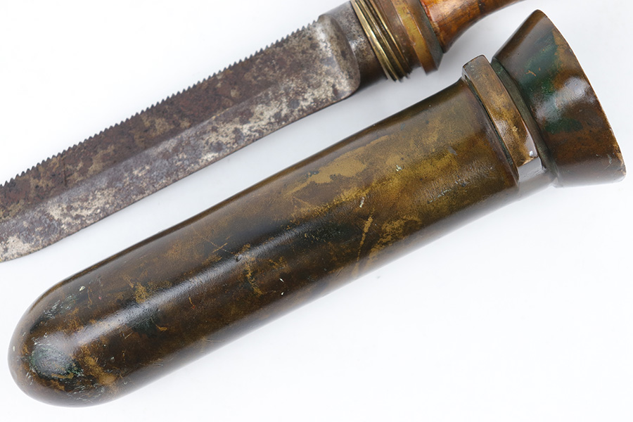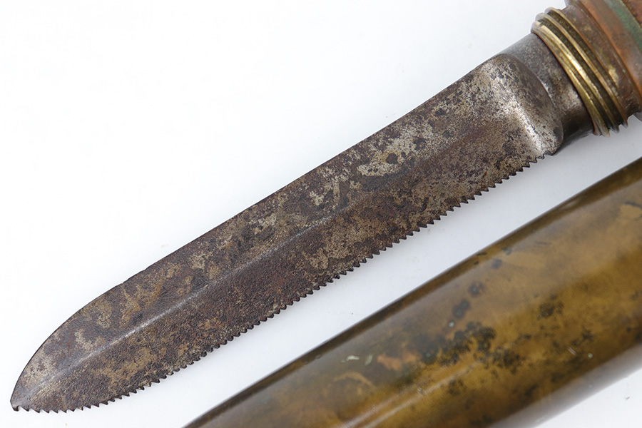 5/10/23 – This is an original WW2 US Navy Diver’s Knife with an original weighted scabbard. There’s no markings or stamps on the blade or scabbard, as shown. The blade has honest surface patina and dark discoloration throughout – showing it’s natural age. The edges show no signs of tampering or sharpening. Nice wood handle with green verdigris on the hand guard and pommel. The scabbard has dark patina throughout as well but no major issues and screws into the knife with no problem. A nice example with some honest wear throughout.