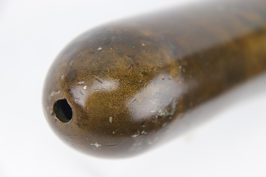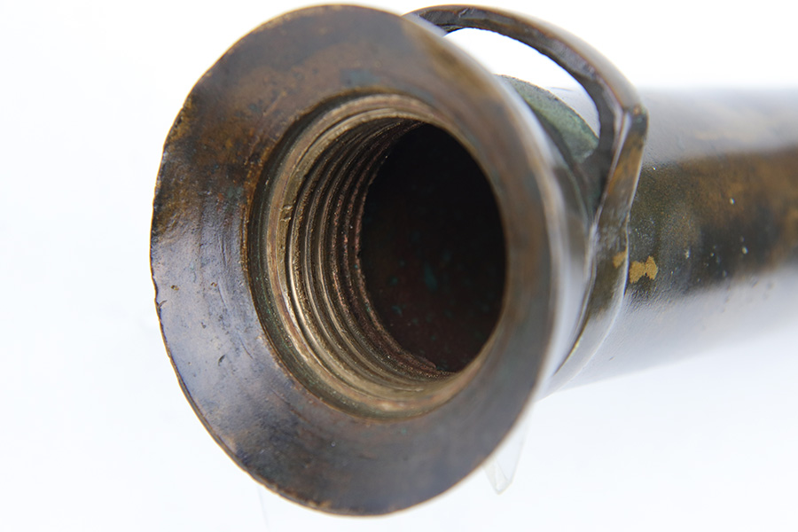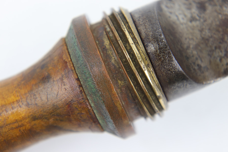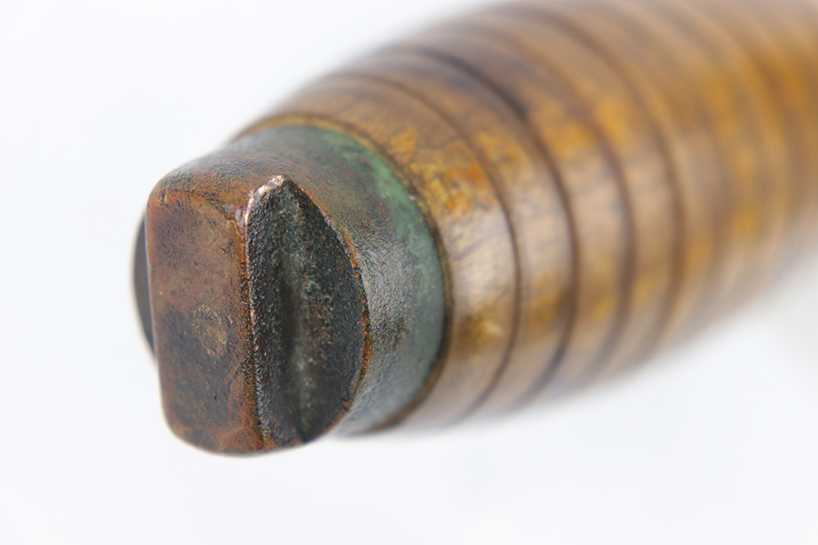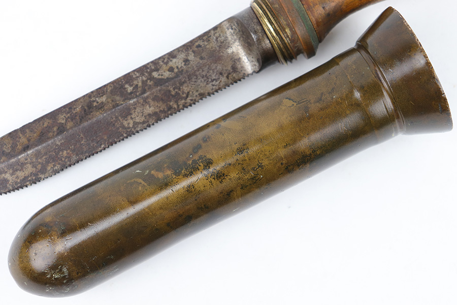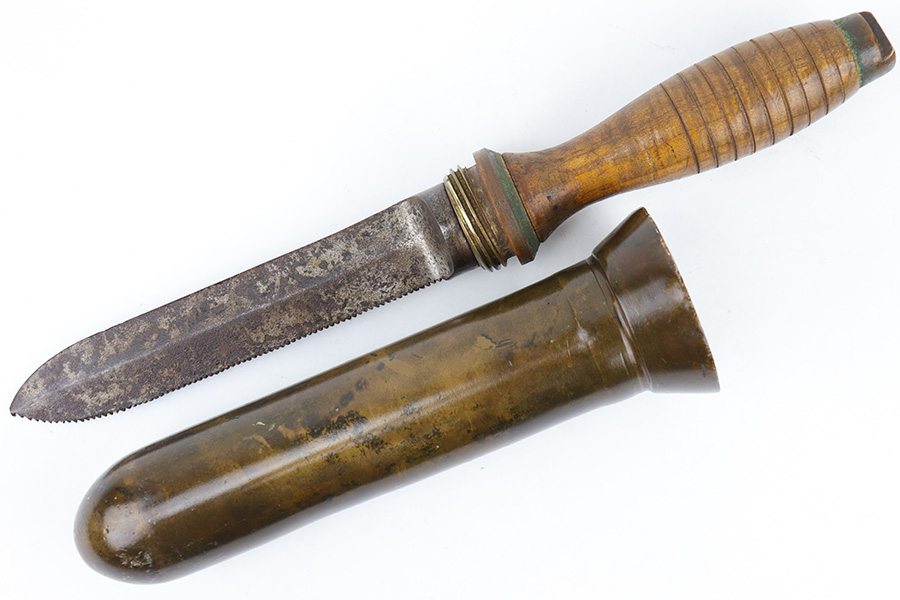 5/10/23 – This is an original WW2 US Navy Diver’s Knife with an original weighted scabbard. There’s no markings or stamps on the blade or scabbard, as shown. The blade has honest surface patina and dark discoloration throughout – showing it’s natural age. The edges show no signs of tampering or sharpening. Nice wood handle with green verdigris on the hand guard and pommel. The scabbard has dark patina throughout as well but no major issues and screws into the knife with no problem. A nice example with some honest wear throughout.