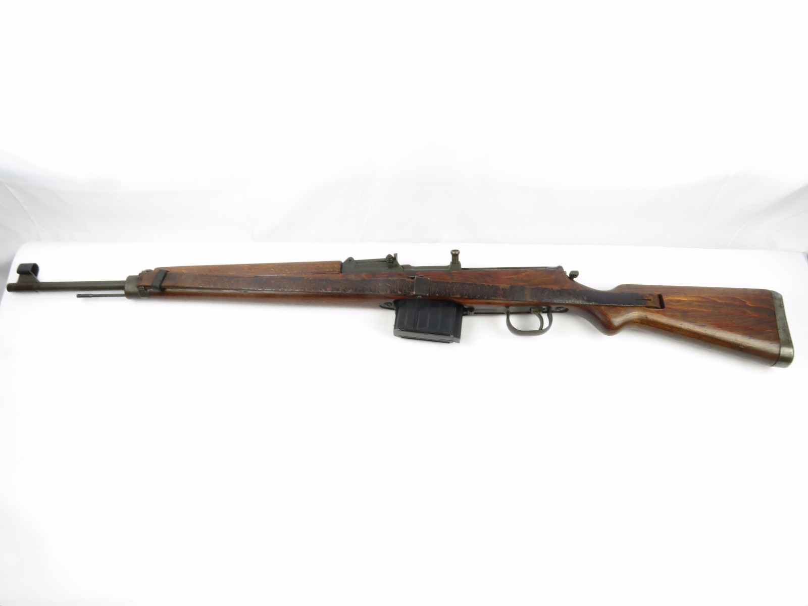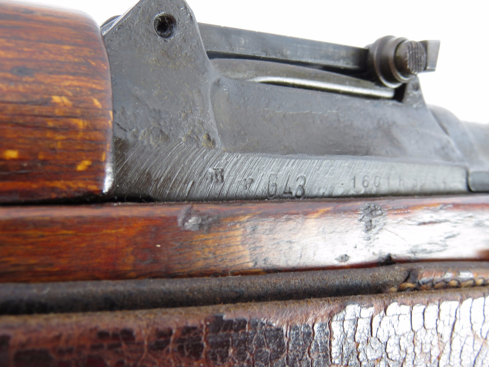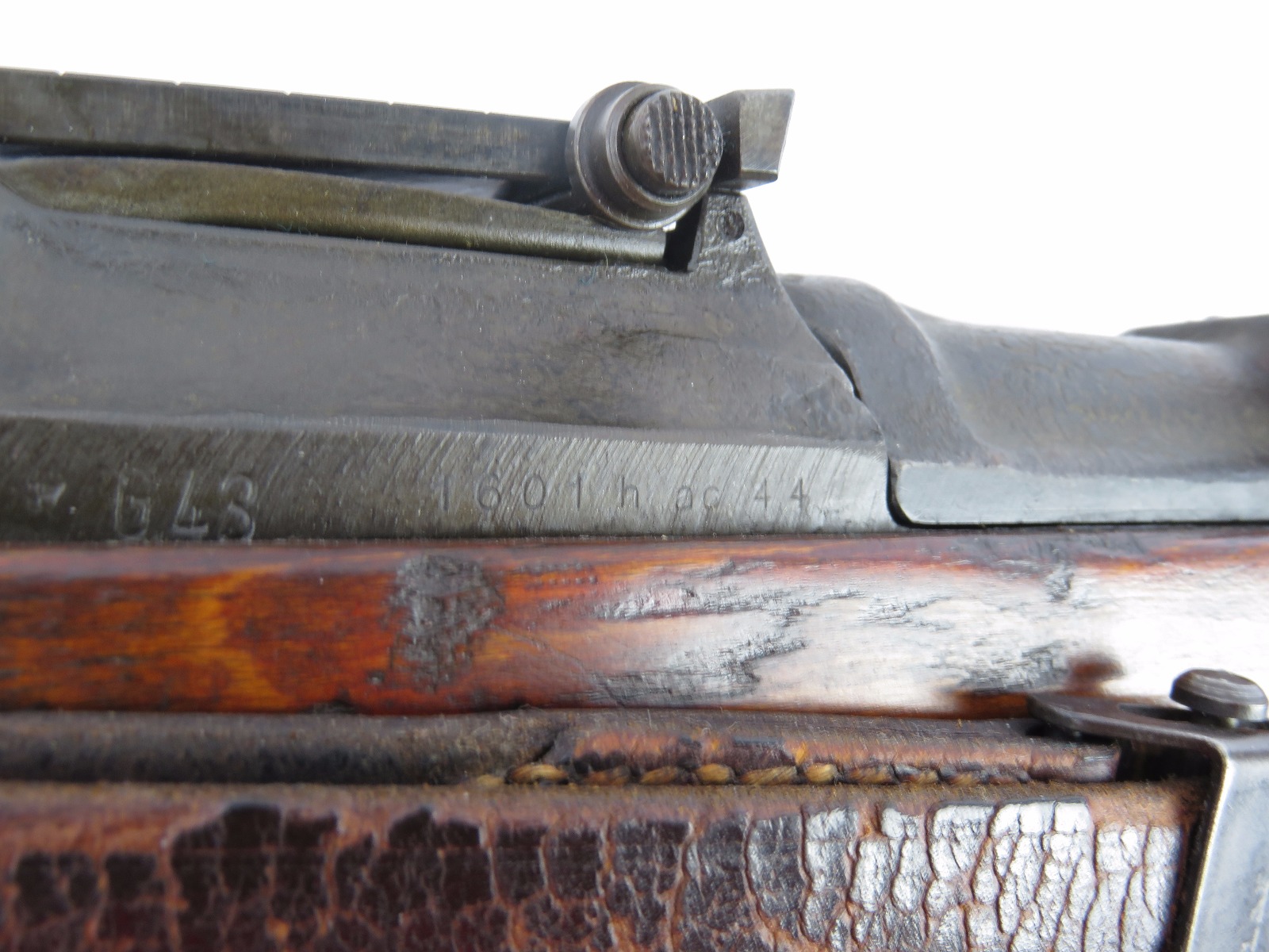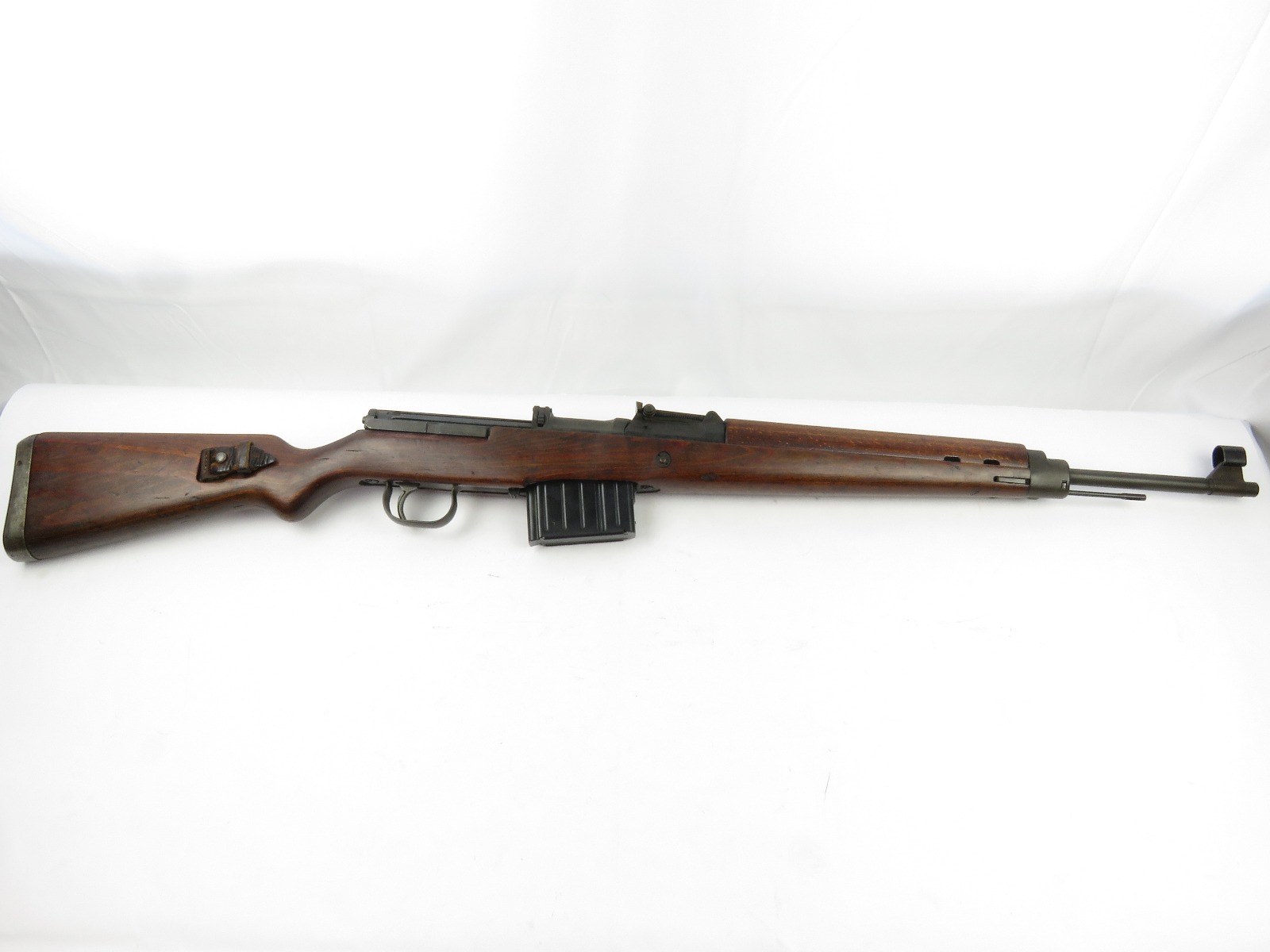 8/31/17 – This is a late WW2 production Walther AC44 G43 rifle. The rifle is all original configuration, and in great condition overall considering that most late WW2 production guns had very rushed, rough finishes. The metal has rough machine marks, but no rust or pitting. The wood stock is original and unsanded, with two waffen proof stamps and a matching serial number on the underside of the rifle. The shoulder strap attached is rough as well with cracked surface leather, but completely in tact and original. The magazine is stamped “K43” and “gcb” with a waffen proof stamp. The bore has residue and corrosion, but the rifling is still in tact, and would probably clean out fairly nicely. The dust cover on the top of the receiver isn’t shown in photos, but will be included upon sale. Guaranteed original and authentic.