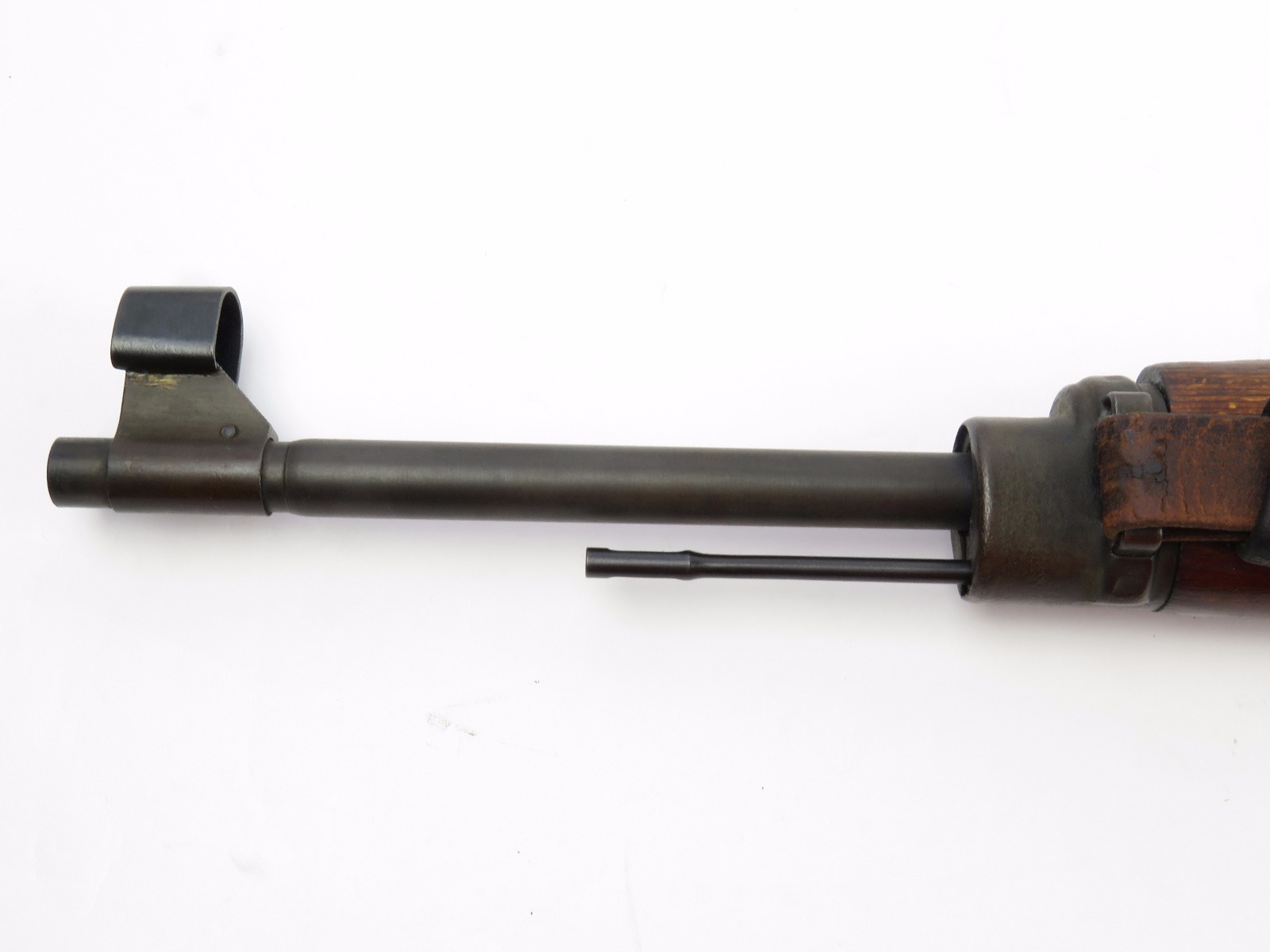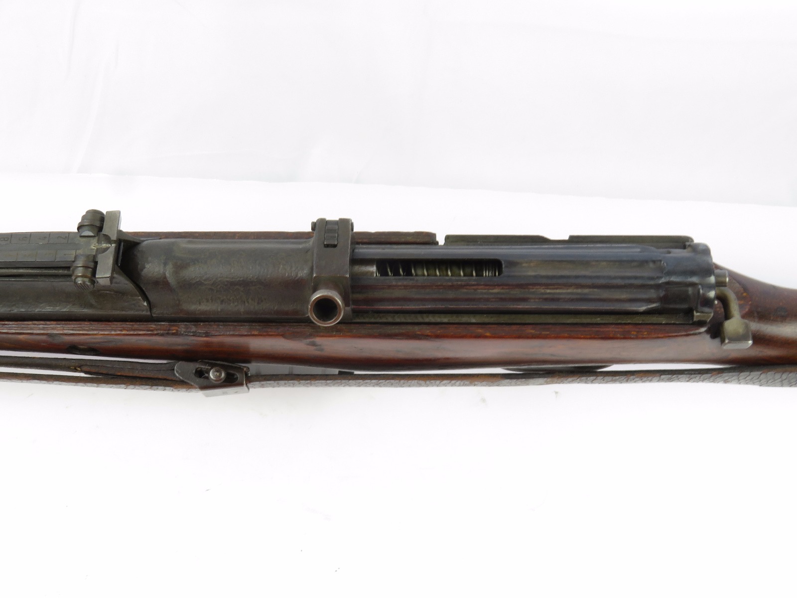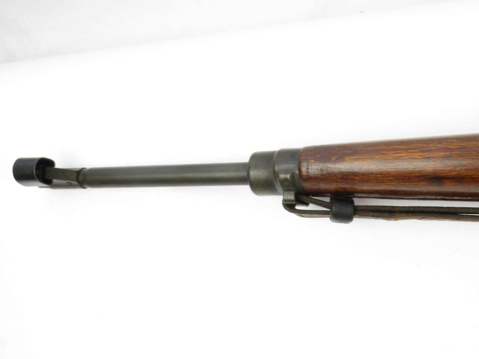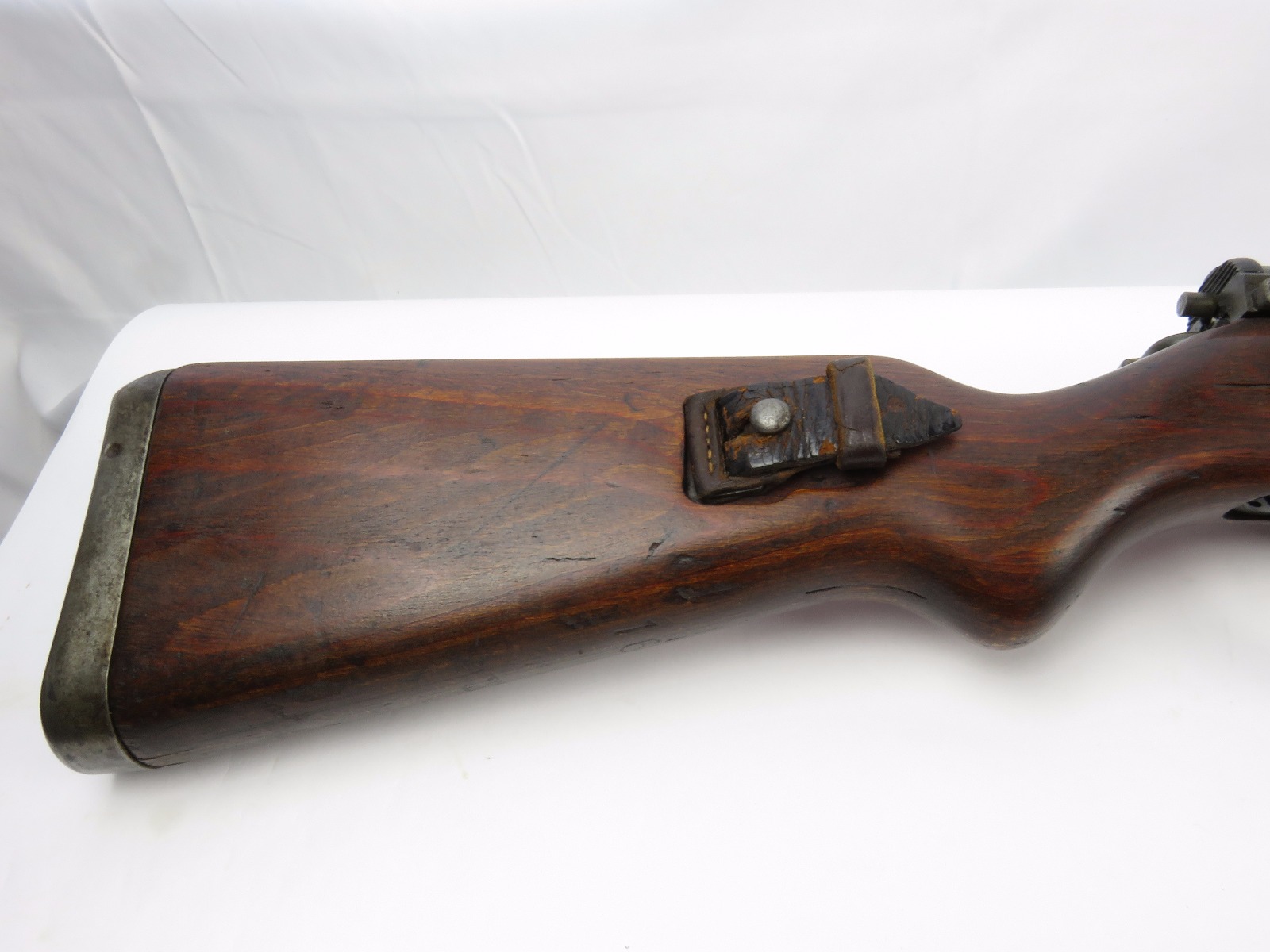 8/31/17 – This is a late WW2 production Walther AC44 G43 rifle. The rifle is all original configuration, and in great condition overall considering that most late WW2 production guns had very rushed, rough finishes. The metal has rough machine marks, but no rust or pitting. The wood stock is original and unsanded, with two waffen proof stamps and a matching serial number on the underside of the rifle. The shoulder strap attached is rough as well with cracked surface leather, but completely in tact and original. The magazine is stamped “K43” and “gcb” with a waffen proof stamp. The bore has residue and corrosion, but the rifling is still in tact, and would probably clean out fairly nicely. The dust cover on the top of the receiver isn’t shown in photos, but will be included upon sale. Guaranteed original and authentic.