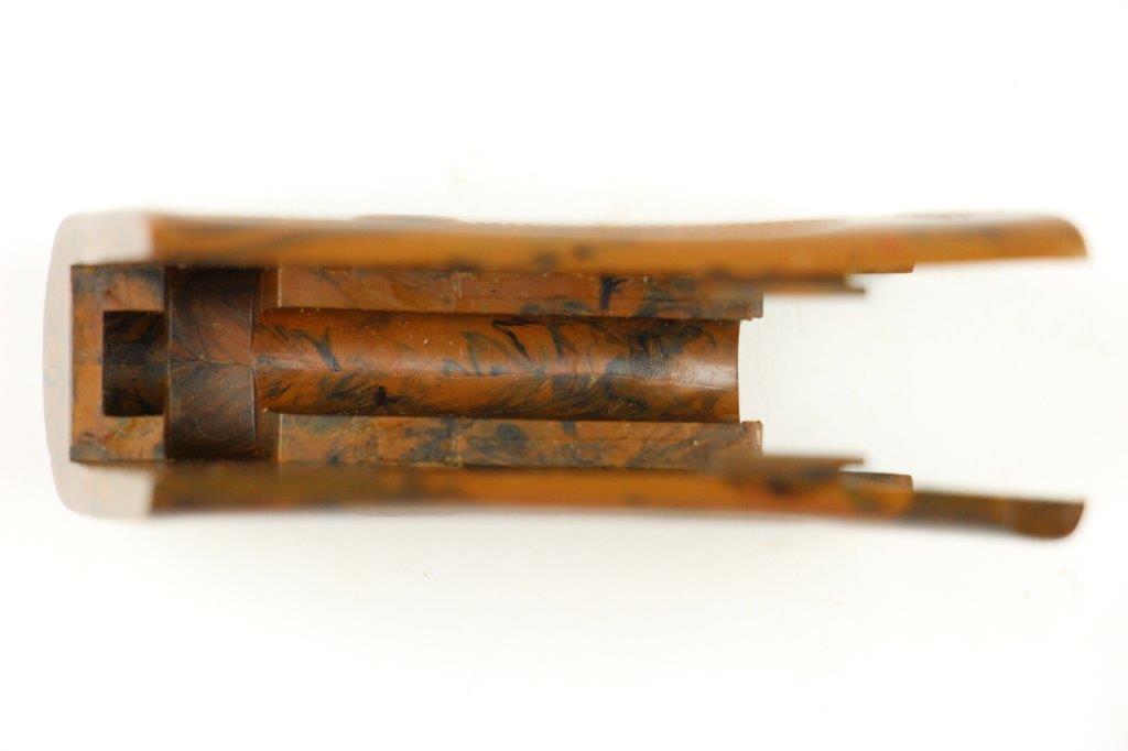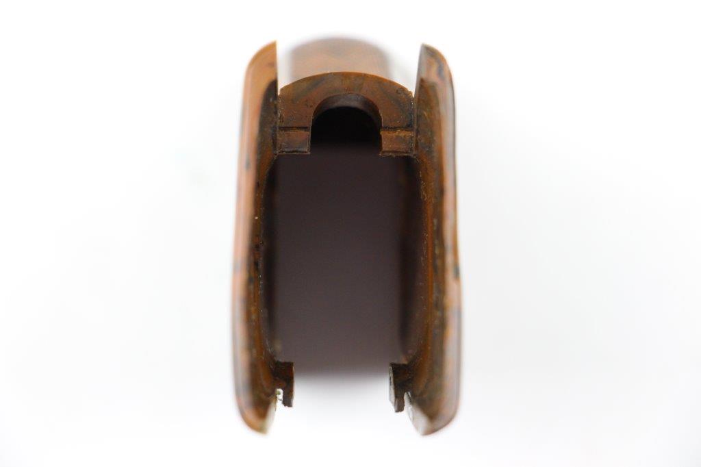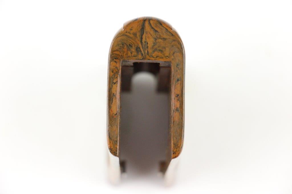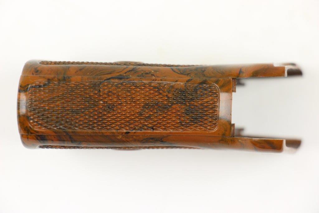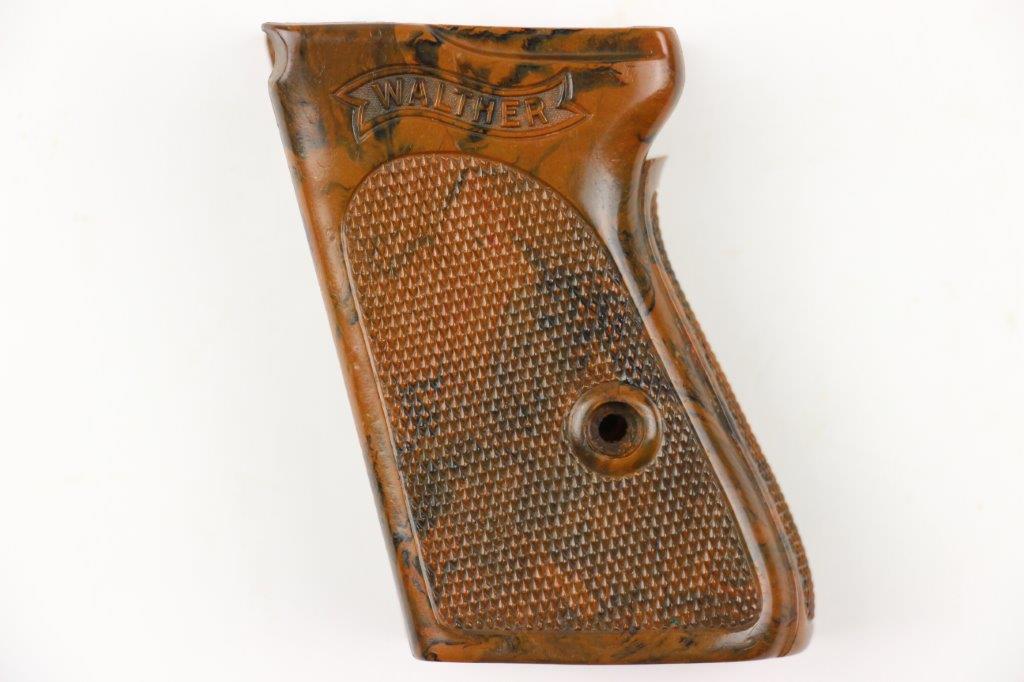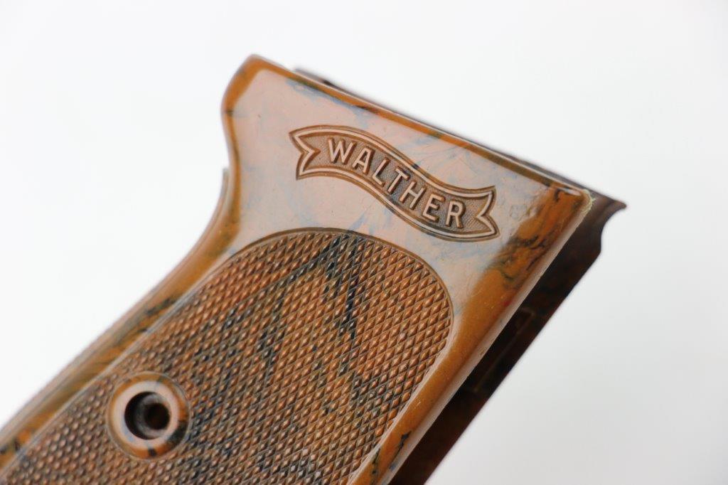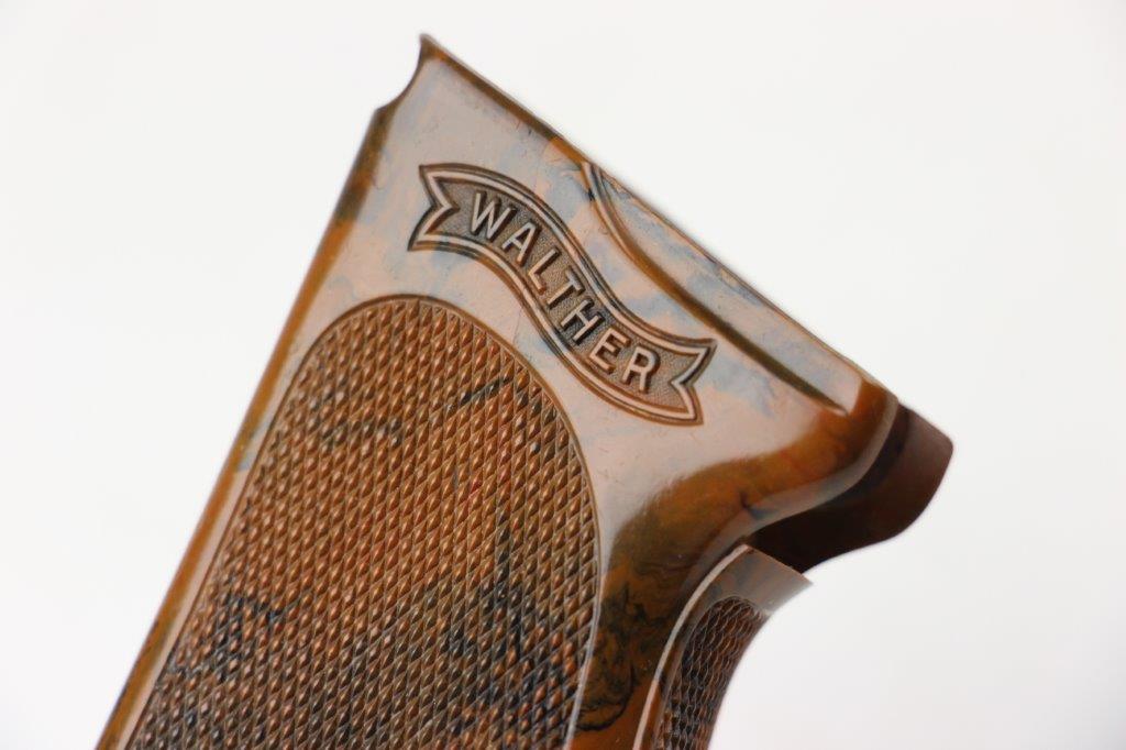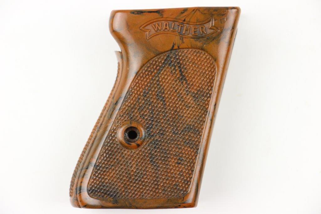 9/5/24 – This is a near-excellent condition Walther PPK grip from WW2. The grip features an attractive black marbling throughout the brown bakelite and minimal warping or “flaring” at the top of the grip. These grips are brittle and often come with multiple cracks and hairline fractures. This example has one hairline crack on the left side, going down from the “A” in the Walther banner. The left side also has a very tiny hairline near the escutcheon hole. The spine of the grip shows another very small hairline crack. All three of these small imperfections are minimal and overall this grip is much nicer than most examples we’ve encountered (in this configuration from WW2). No screw or escutcheons included.