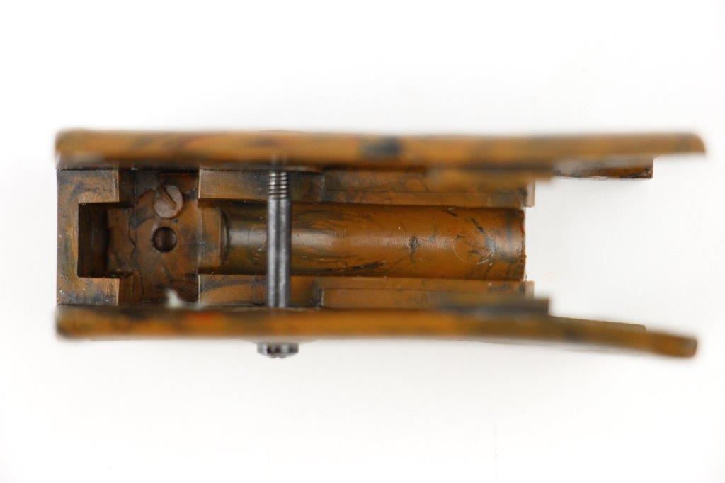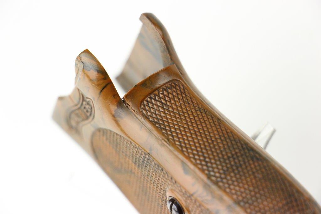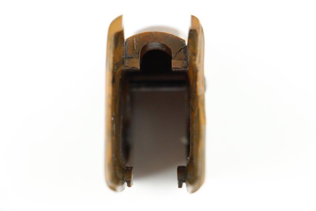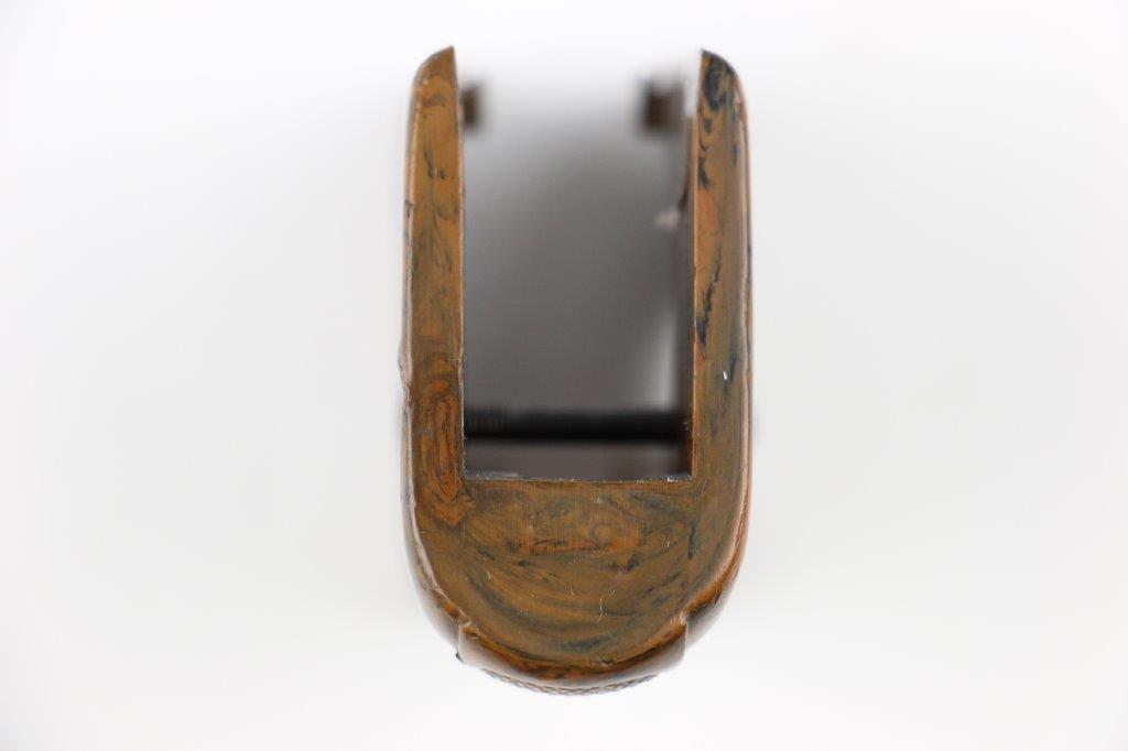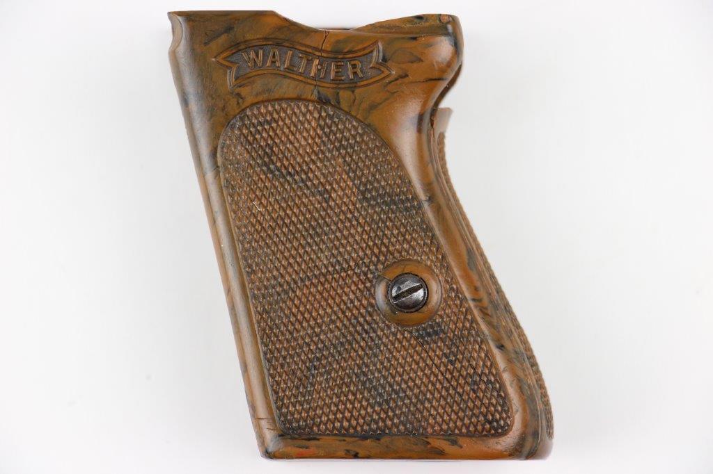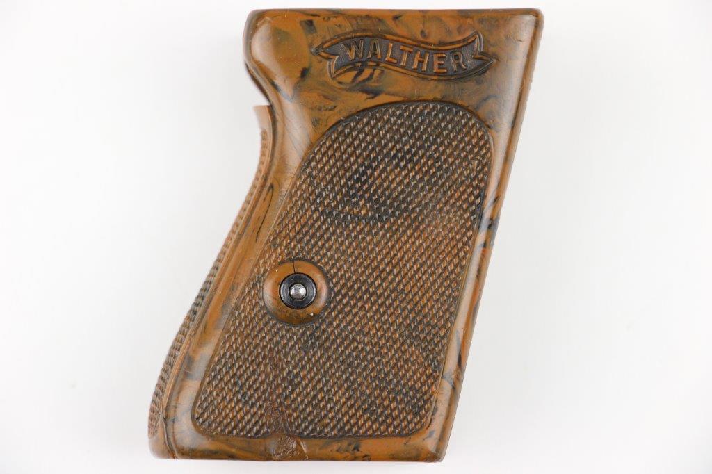 6/12/24 – This is an original WW2 bakelite Walther PPK one piece grip. The grip comes with an original screw and both grip escutcheons. The left side of the grip has a hairline crack going through the Walther banner and a small chip at the top. The right side of the grip has a very minor crack near the escutcheon hole. Besides these flaws, the grip is structurally strong and has minimal warping. Would make for a great backup / spare grip or a range grip.
