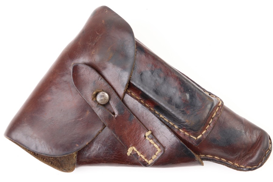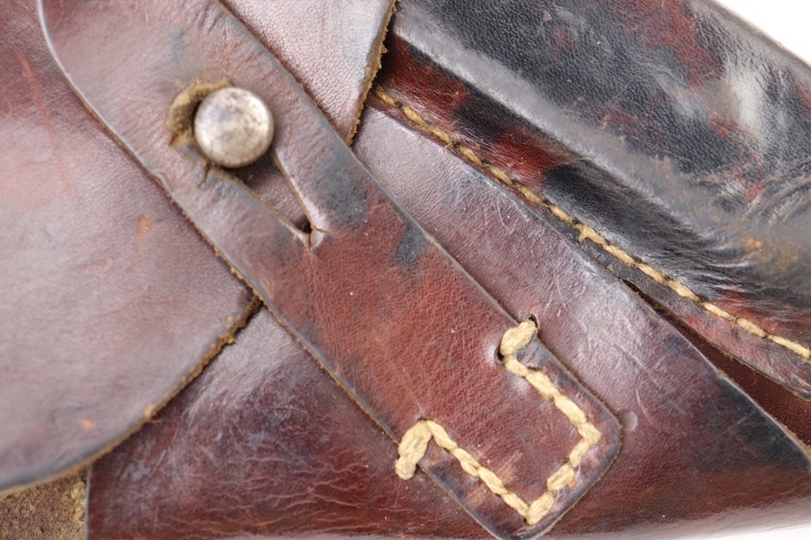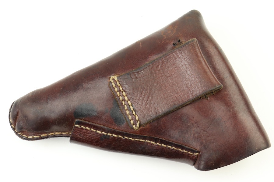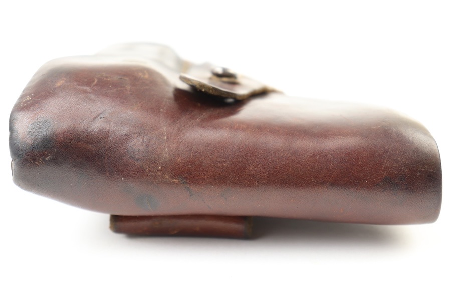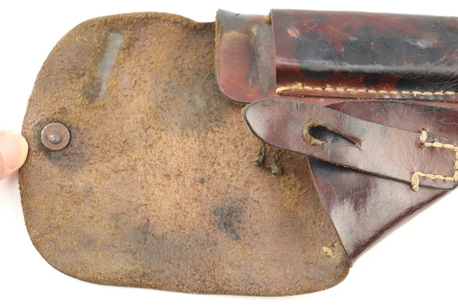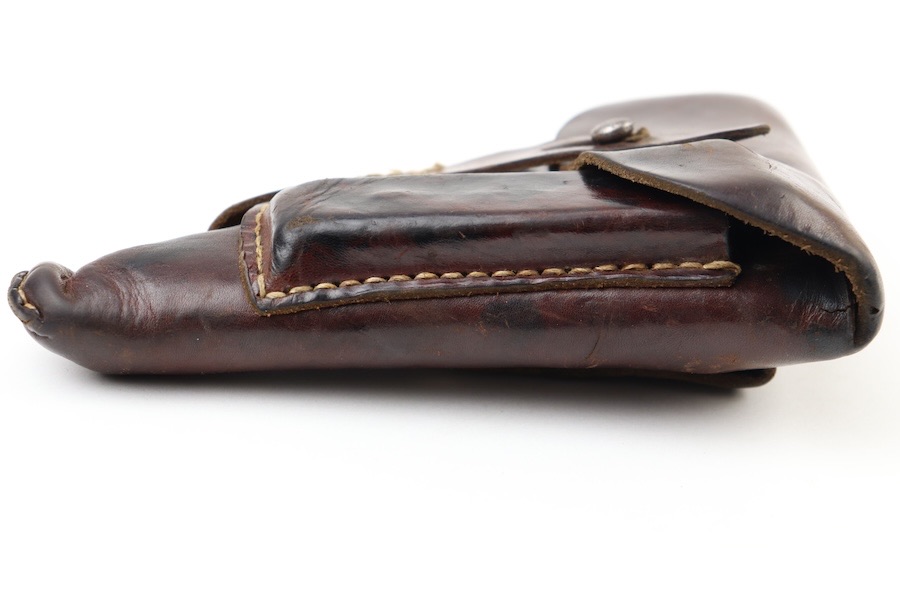 11/15/23 – This is a great condition WW2 Commercial Walther PPK or similar-sized 7.65mm pistol holster. Outer Leather is soft and pliable with minor wrinkling on the toe and bottom of the magazine pouch. There’s some evidence that the stitching may be replacement, and the price is reduced accordingly. There are no maker stamps or markings. The holster has a clean interior. Overall a nice holster with some minor flaws.