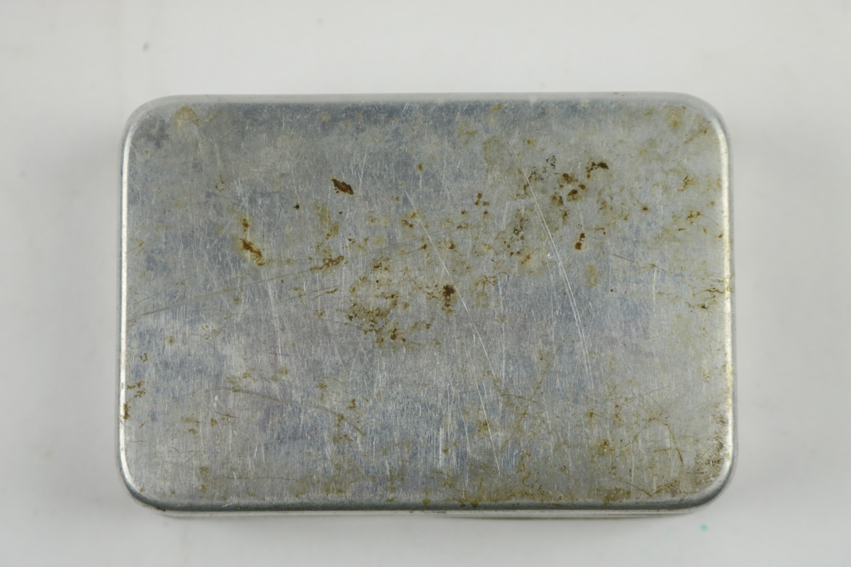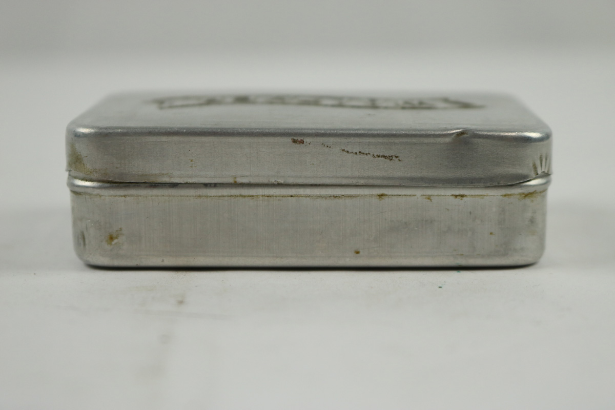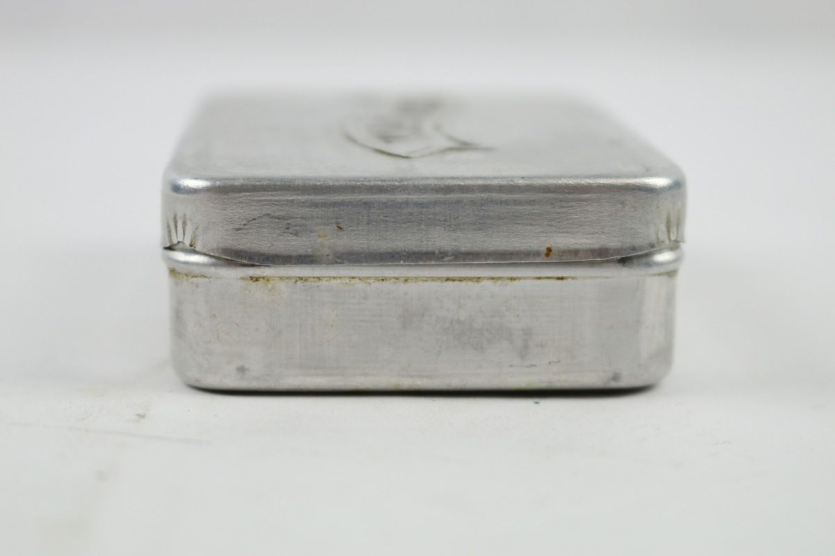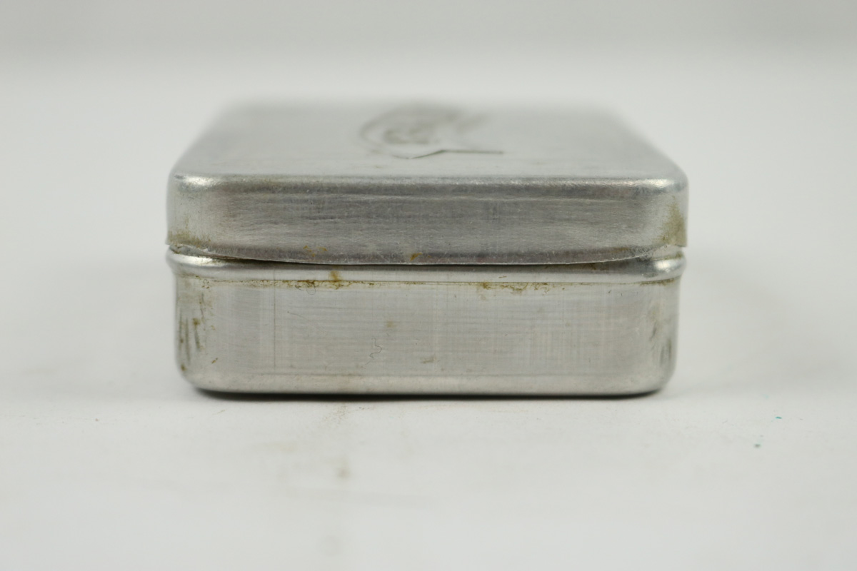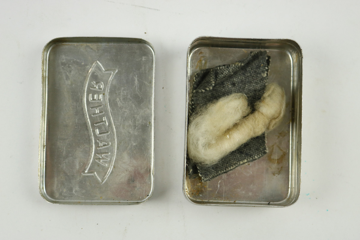 10/9/18 – This is an original WW2 production Walther PP / PPK tin. The tin is wartime production with the banner solely stamped on the lid. This is the more scarce variation, as opposed to the factory image on the front. The tin has one small dent on the lid but for the most part is in great shape. Two small interior pieces of cloth (unmarked) are included. The tin is guaranteed original and authentic.