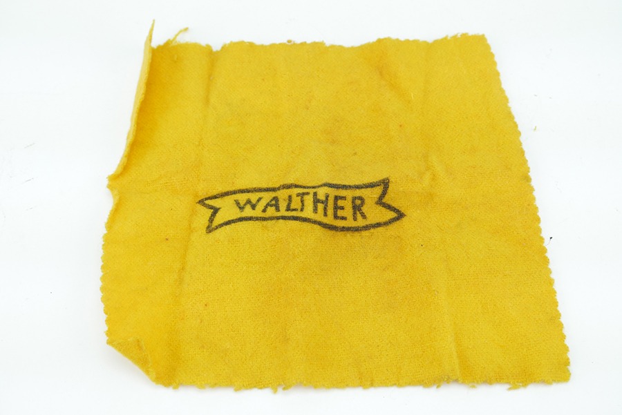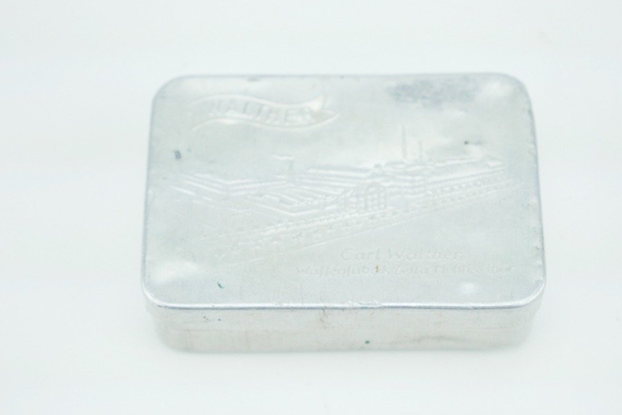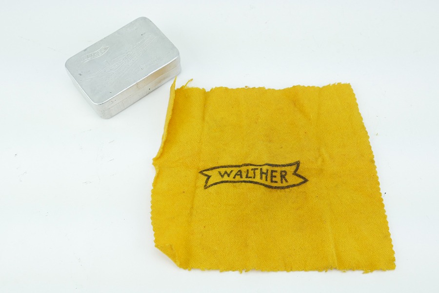 11/1/24 – This is an original Walther Tin for a WW2 era Walther PP or PPK pistol. The tin is intact and in great overall condition with a picture of the Walther factory on the front. This tin does include a Walther Banner cleaning cloth. There are various small dents throughout the tin but the overall shape is great.