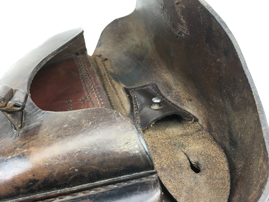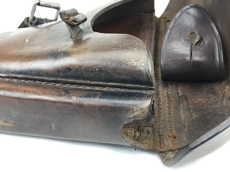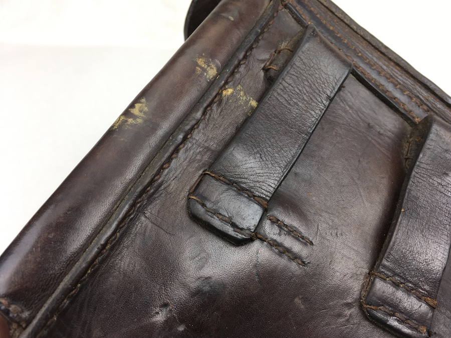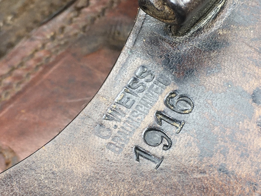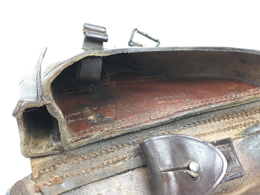 10/21/19 – This is an original 1916 dated Luger holster from WW1. The holster is maker stamped and dated under the closure flap. The maker is C. WEISS. The leather and stitching on this holster are excellent, especially considering the age. The leather is firm and clean with minor surface, age discoloration. A few stains and scuffs. The stitching is all in tact and original. Clean interior and secure lift strap. The maker stamp is crisp and clear. Hard to upgrade and guaranteed original.