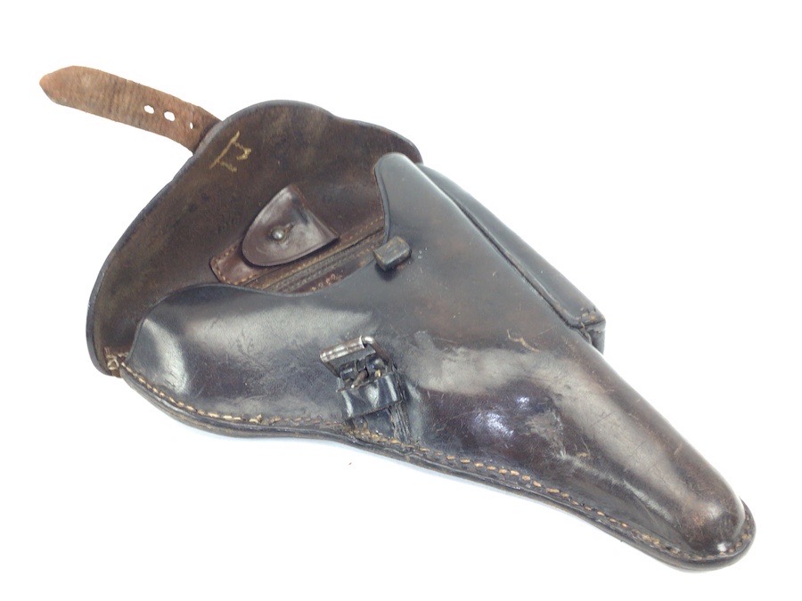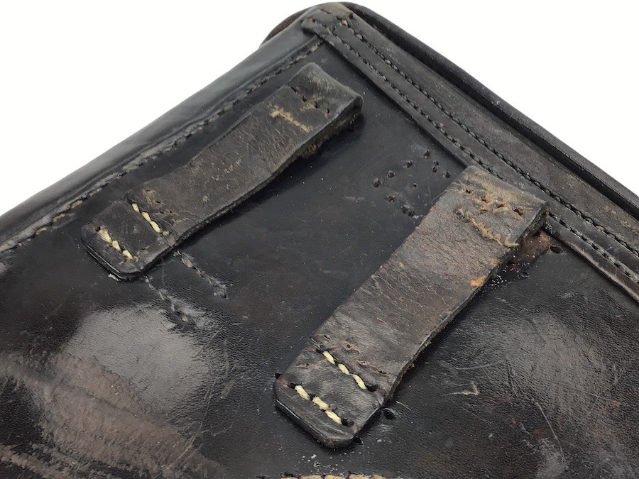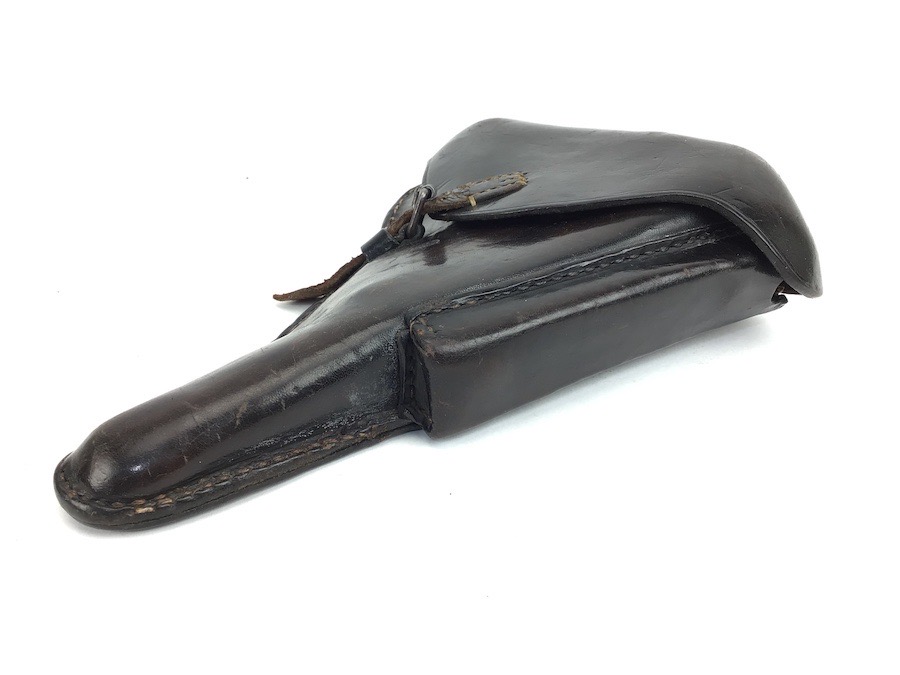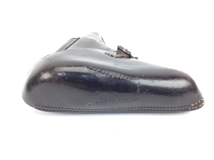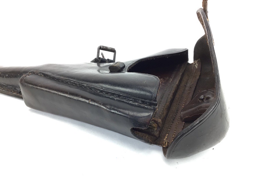 1/16/23 – This is an original 1916 dated Luger holster from WW1. The holster is maker stamped and dated under the closure flap. The maker is C. F. Twoller. The leather and stitching on this holster are intact, however, there has been some professional re-stitching at the belt loops and along the left side and toe. The leather is firm and clean with minor surface, age discoloration. Clean interior and secure lift strap. The maker stamp is crisp and clear.