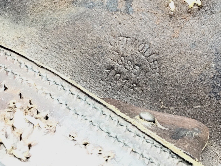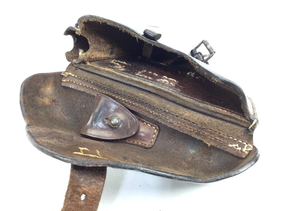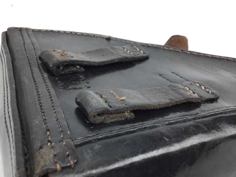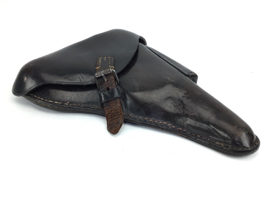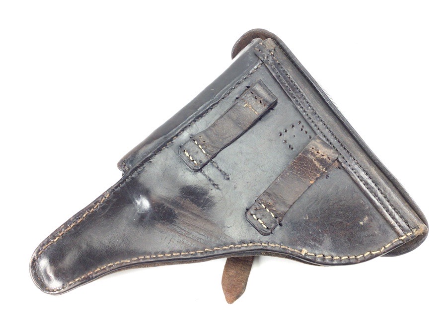 1/16/23 – This is an original 1916 dated Luger holster from WW1. The holster is maker stamped and dated under the closure flap. The maker is C. F. Twoller. The leather and stitching on this holster are intact, however, there has been some professional re-stitching at the belt loops and along the left side and toe. The leather is firm and clean with minor surface, age discoloration. Clean interior and secure lift strap. The maker stamp is crisp and clear.