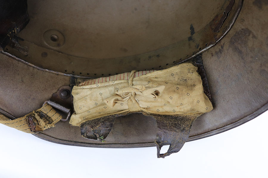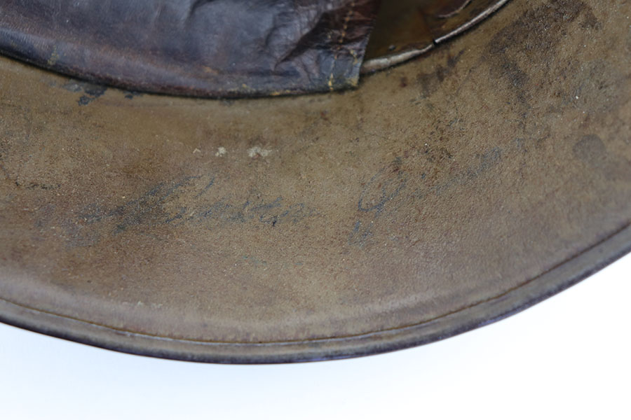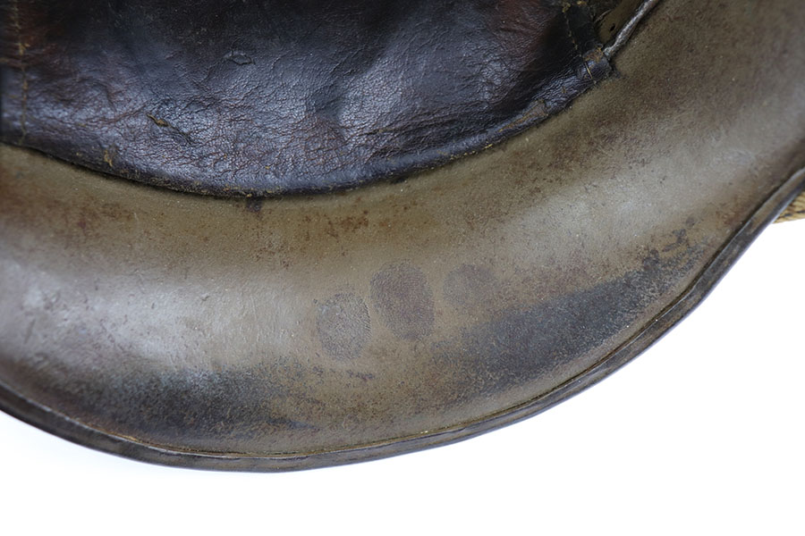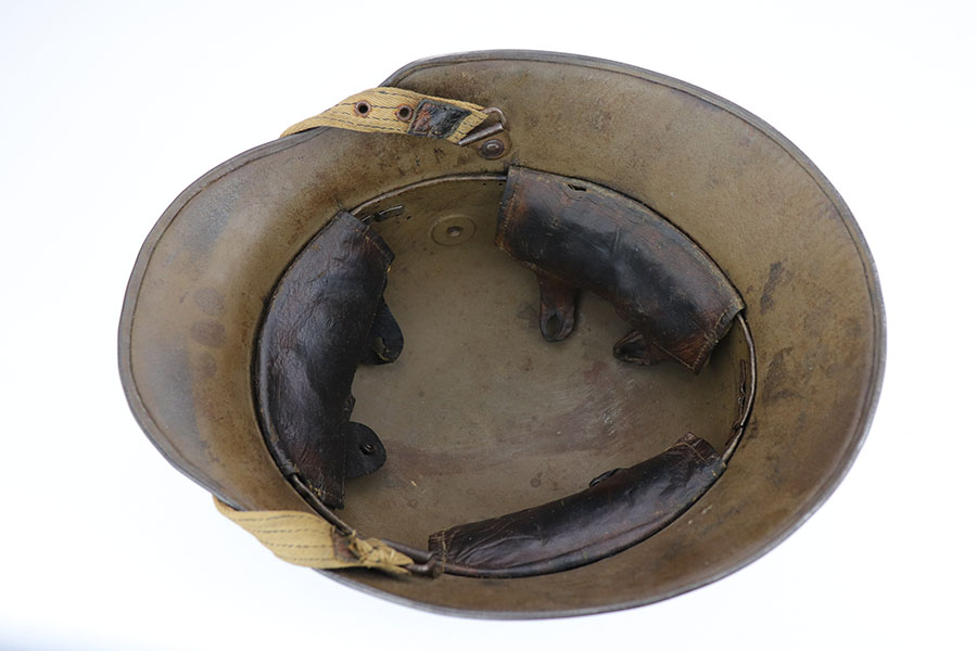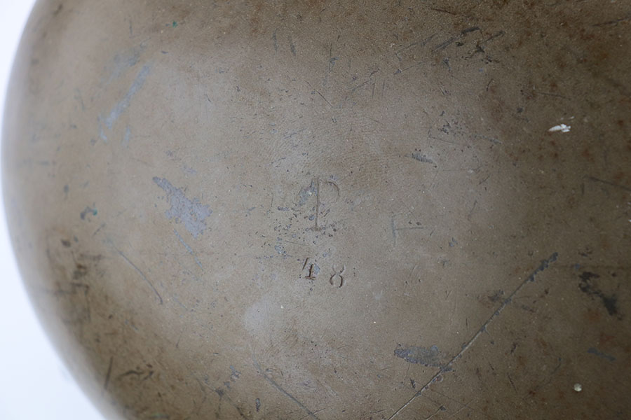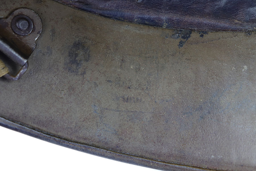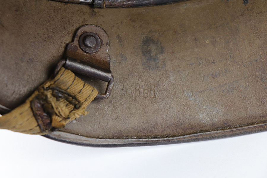 1/7/19 – This is an original WW1 era production (we estimate around 1916) Austrian helmet. The helmet is a large size 66, which is very desirable for today’s collector. The helmet is overall in great condition especially given its’ age. There are no dents or major issues on the shell – and the original brown colored paint is still in tact. THe interior of the helmet shows light aging and fading of what appears to be a square shaped inkstamp. The outlined edge of this stamp is noticeable, but not legible. This is next to a “3.GB. 66.” maker stamp. The original canvas chin strap is still in tact. The interior leather pads are still in good condition as well, although showing normal signs of aging.