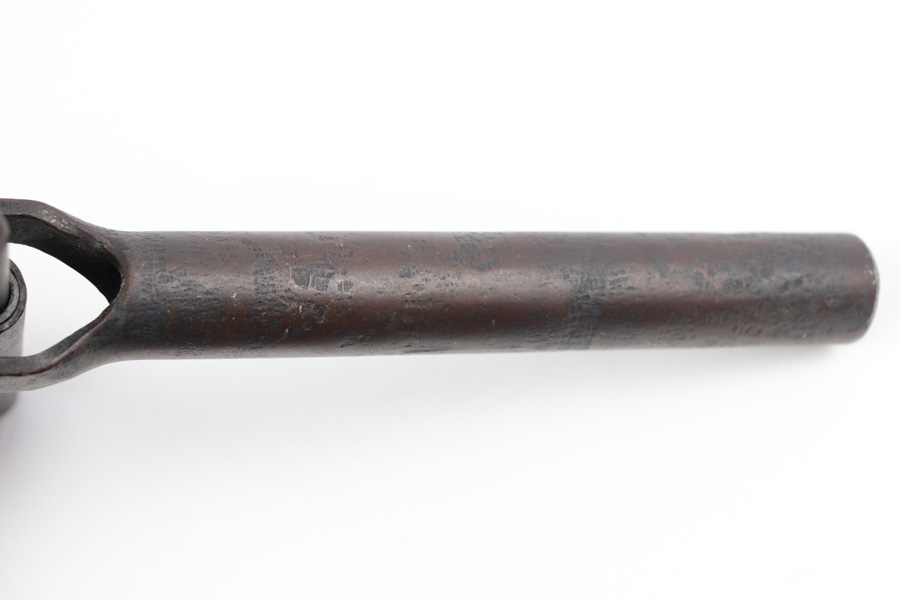 6/21/19 – This is an original WWI Imperial snail drum luger magazine loader. The device is fully functional and all original. There’s dark patina and finish loss throughout – leaving a reddish hue to the device. Smooth action on the loading lever / mechanism. All honest wear due to aging. The right side is Crown/D imperial proof stamped.