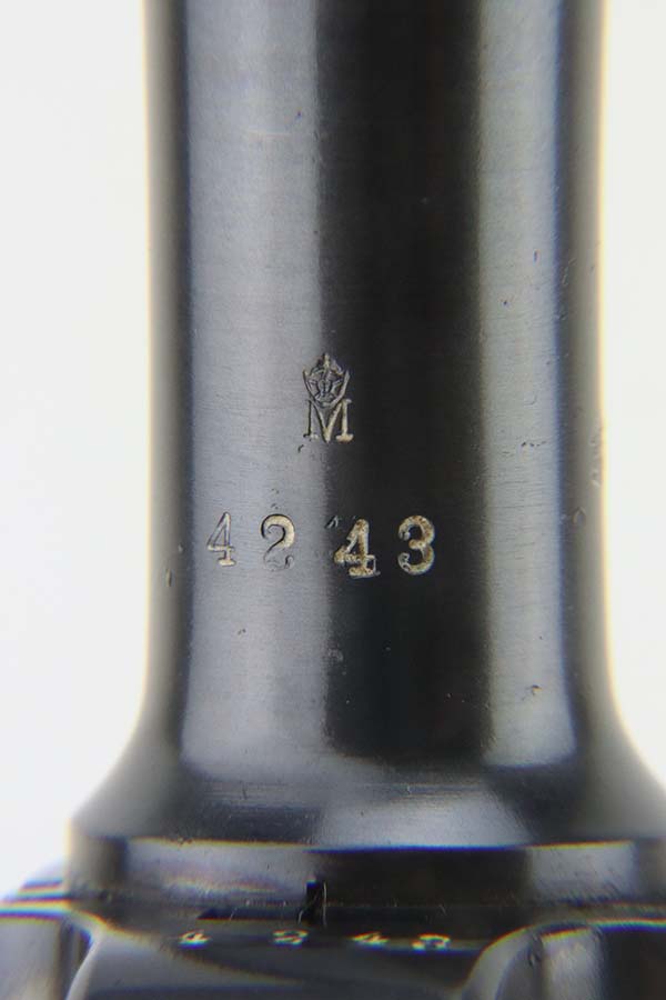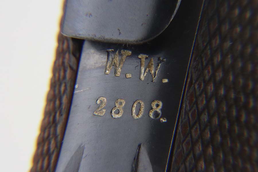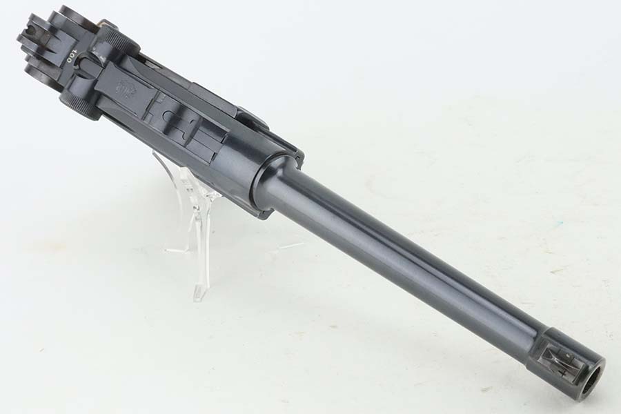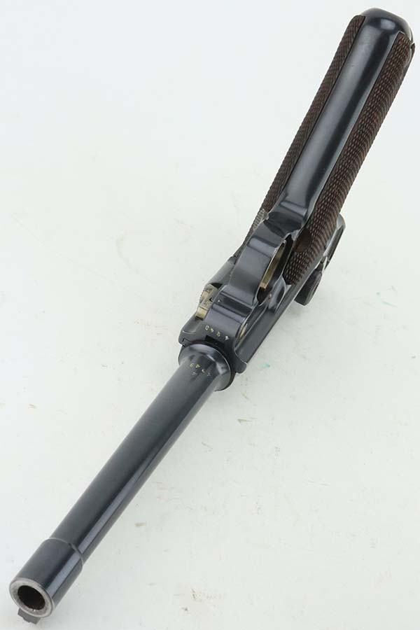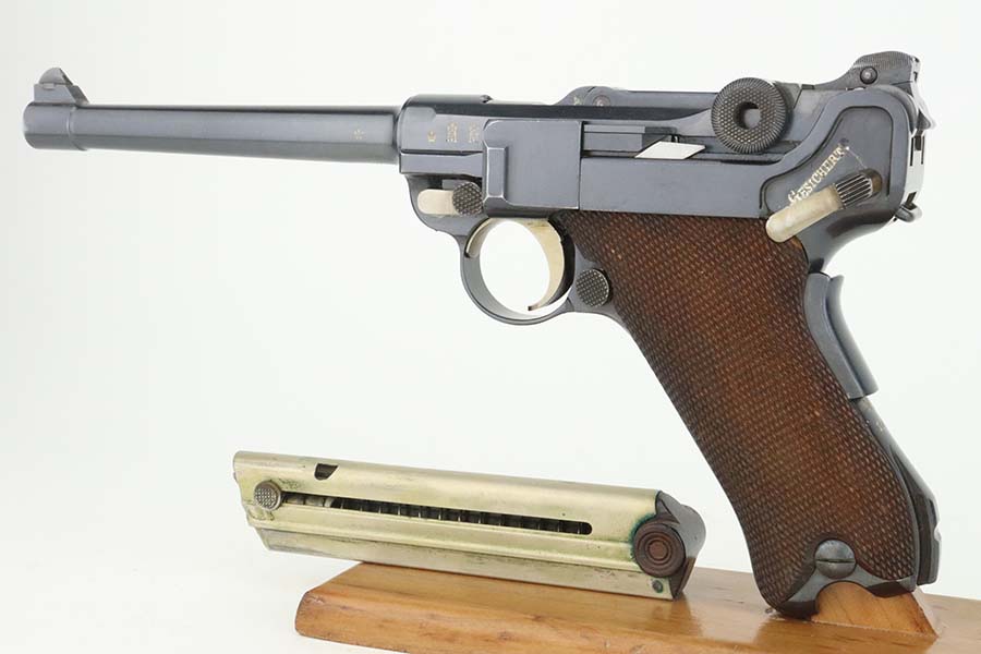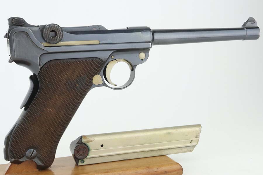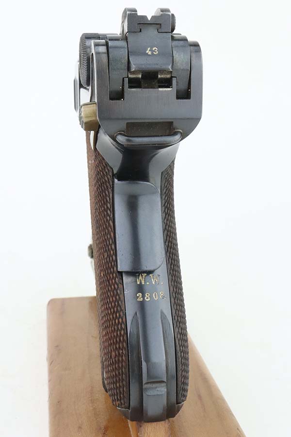 7/22/24 – This is a beautiful example of a DWM Navy Luger issued to the Imperial German Navy during WWI. All matching with the proper “Crown M” navy proofs and “W. W. 2808.” Navy unit marking on the back strap. The gun has been professionally restored and refinished, and the bluing is great. Altered safety. Fitted with minty matching-numbered wood grips – tiny chip in the upper corner of the left side. Comes with an un-numbered Navy magazine. Mint bore.