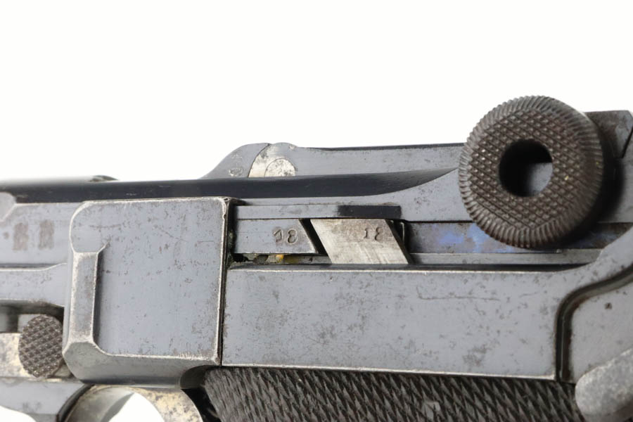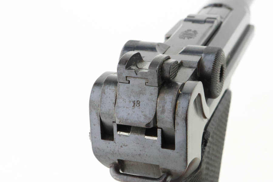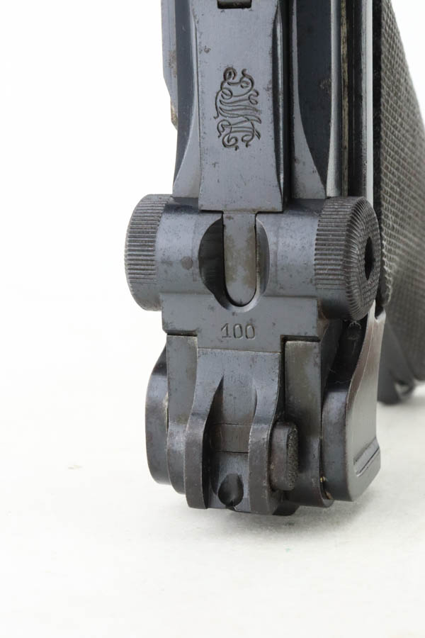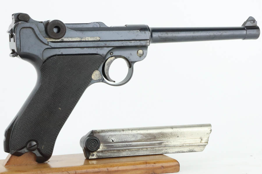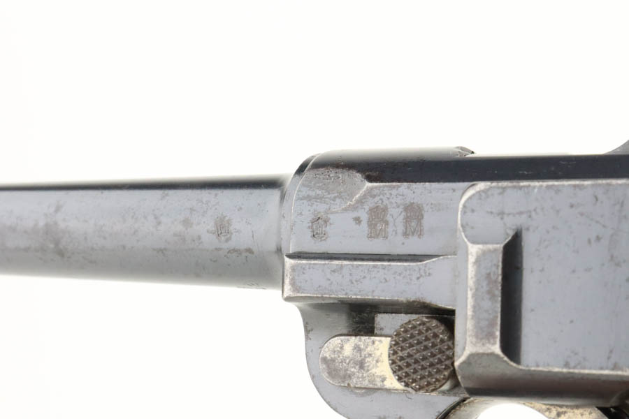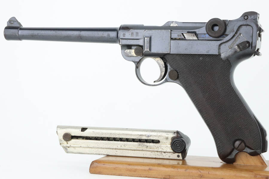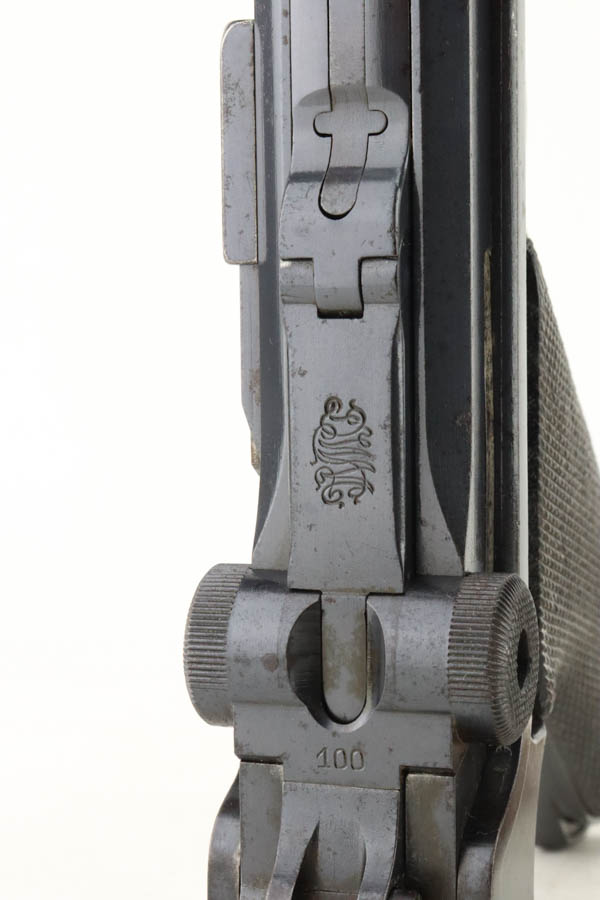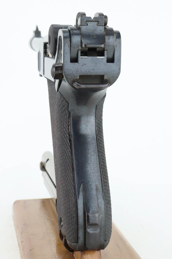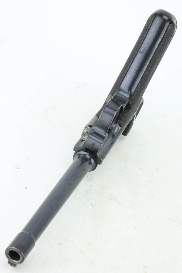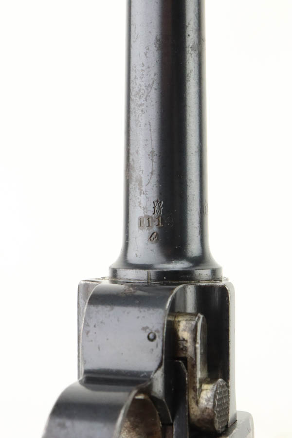 6/3/24 – This is a very nice example of a DWM Navy Luger issued to the Imperial German Navy during WWI. All matching with the proper “Crown M” navy proofs. It has retained about 97% of its original finish. While there is very little actual finish loss, there is noticeable spotty oxidation throughout. Fitted with matching-numbered wood grips. Comes with a numbered but mismatched Navy magazine. The bore shows minor pitting throughout.