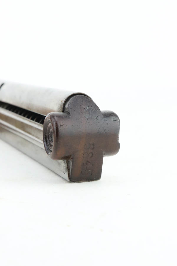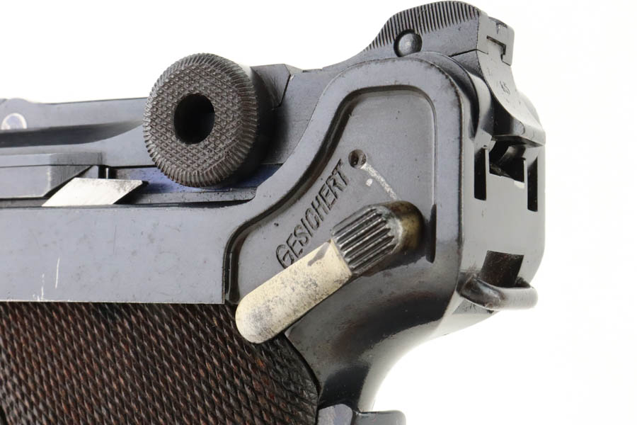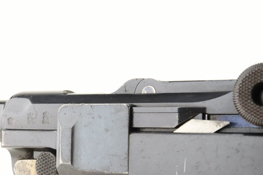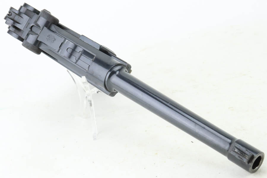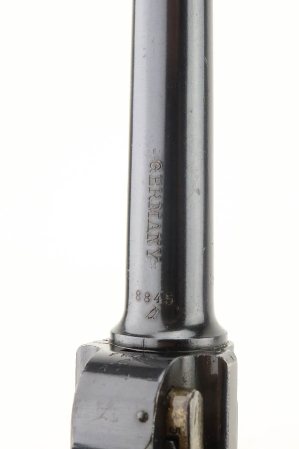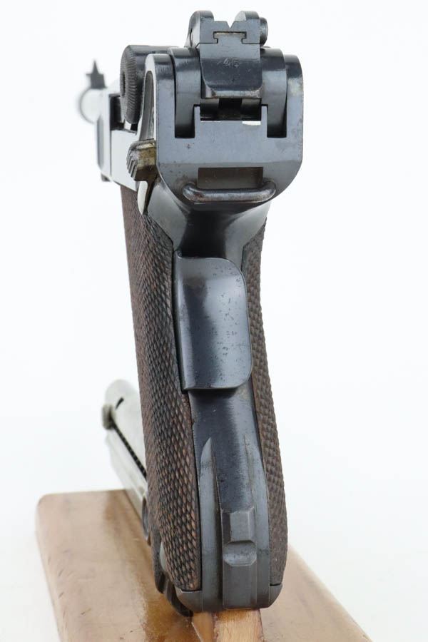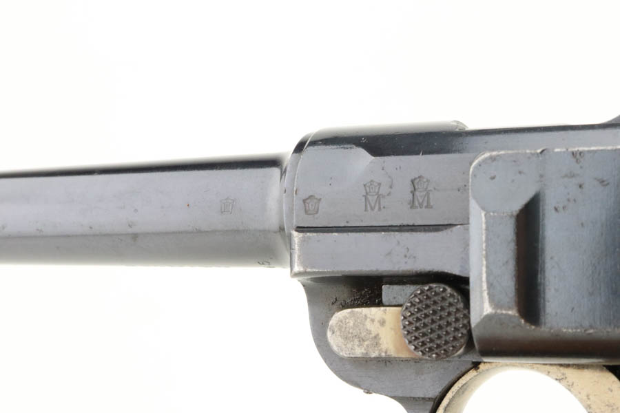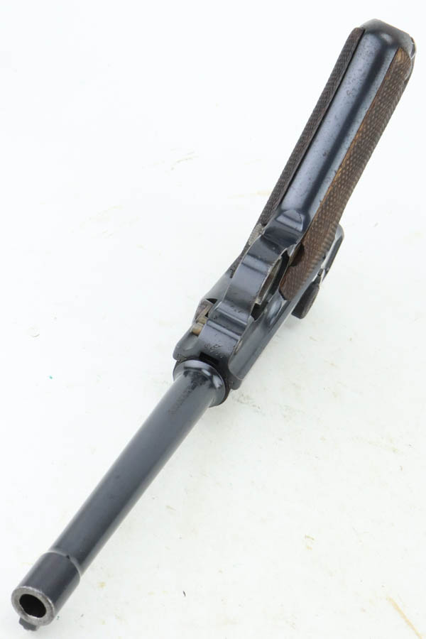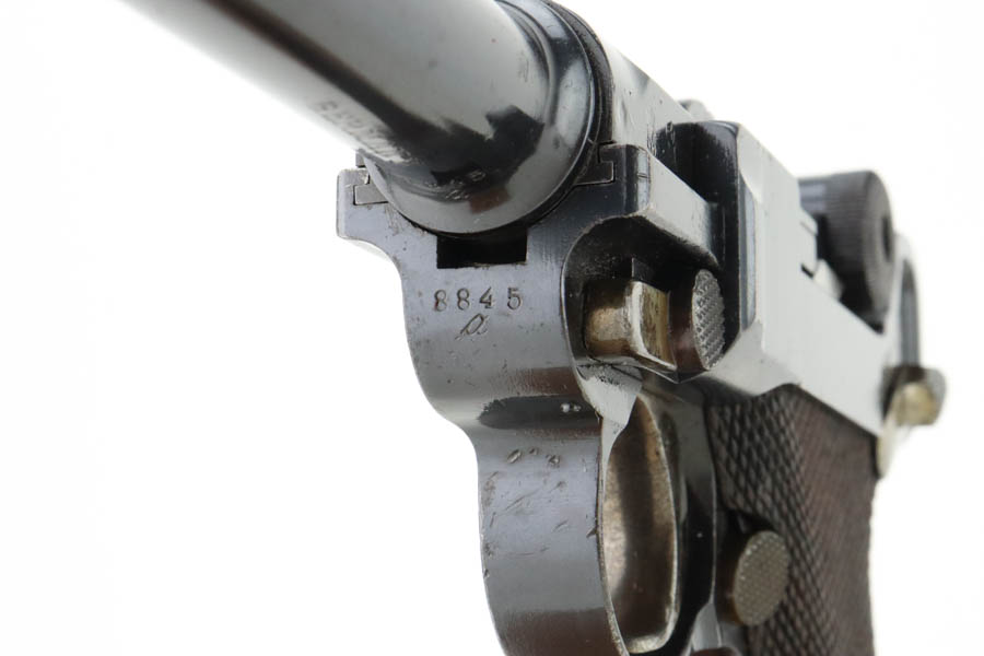 5/29/24 – This is an excellent example of a DWM Navy Luger issued to the Imperial German Navy during WWI. All matching with the proper “Crown M” navy proofs. Comes with an original matching-numbered magazine. Un-altered safety. We believe this gun has an old arsenal re-blued finish. There is very little finish loss, but there is some freckling on the grip straps and a few tiny pits under the bluing on the barrel. The left grip is numbered but mismatched, the right is un-numbered. Very nice bore.