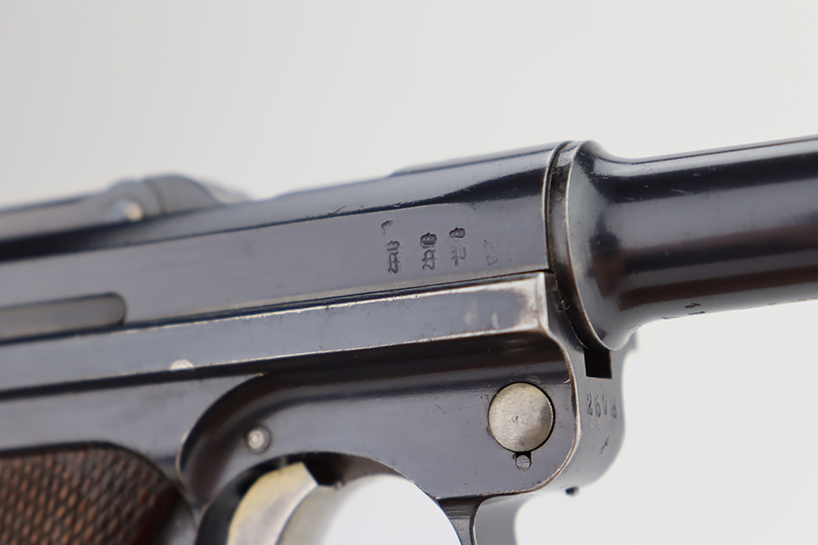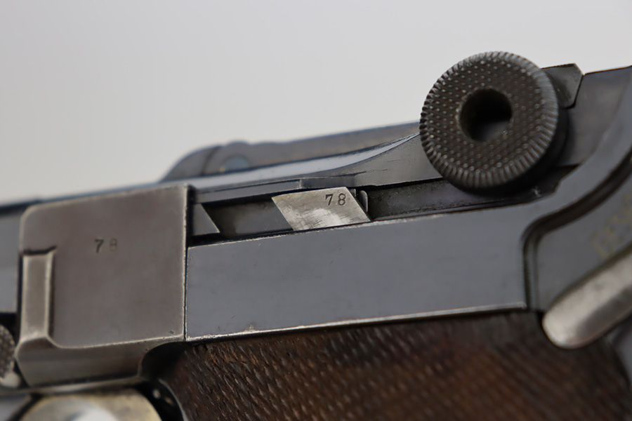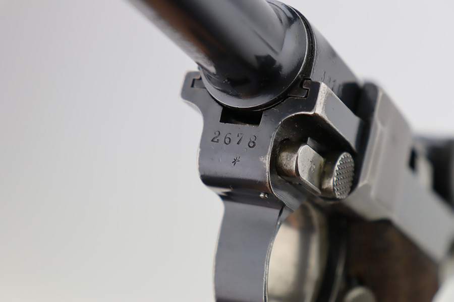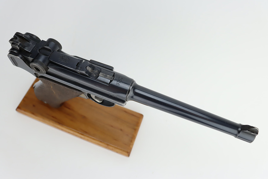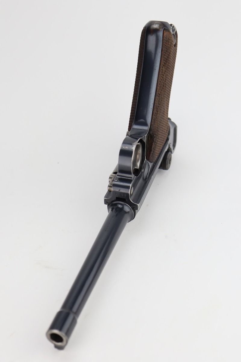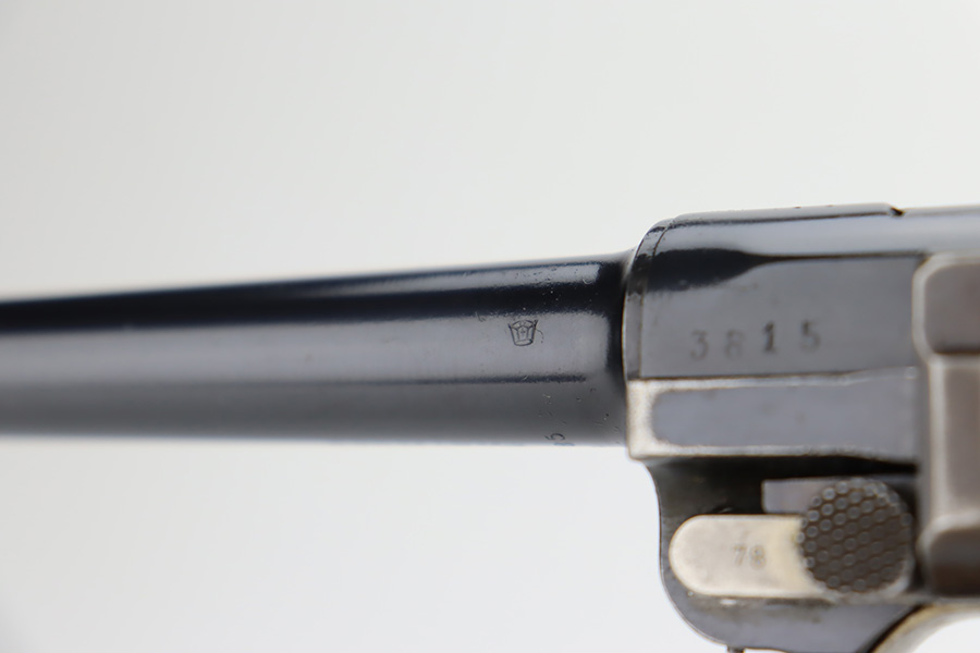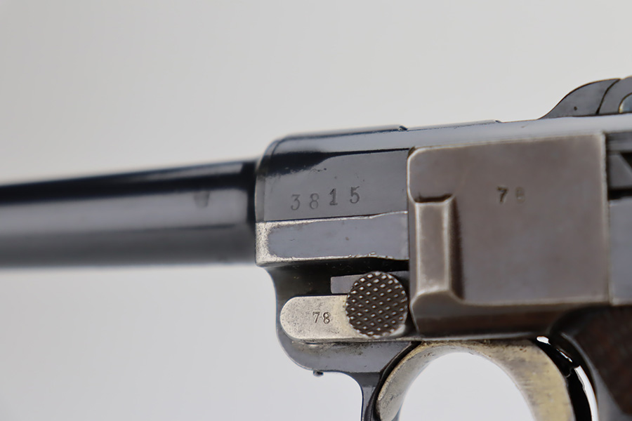 12/6/23 – This is a very nice DWM Navy Luger put together from parts. It is mismatched, has Imperial military proofs on the slide, and has a “Germany” export marking on the barrel. The bluing rates about 96% with very minor wear around the muzzle and on the high edges, some minor wear at the base of the grip straps, and some brown patina on the side plate. The right grip panel is numbered and matches the frame, the left is un-numbered and has a tiny chip in the upper corner. Comes with an un-marked magazine. The bore has good rifling, but there is very light frosting throughout.