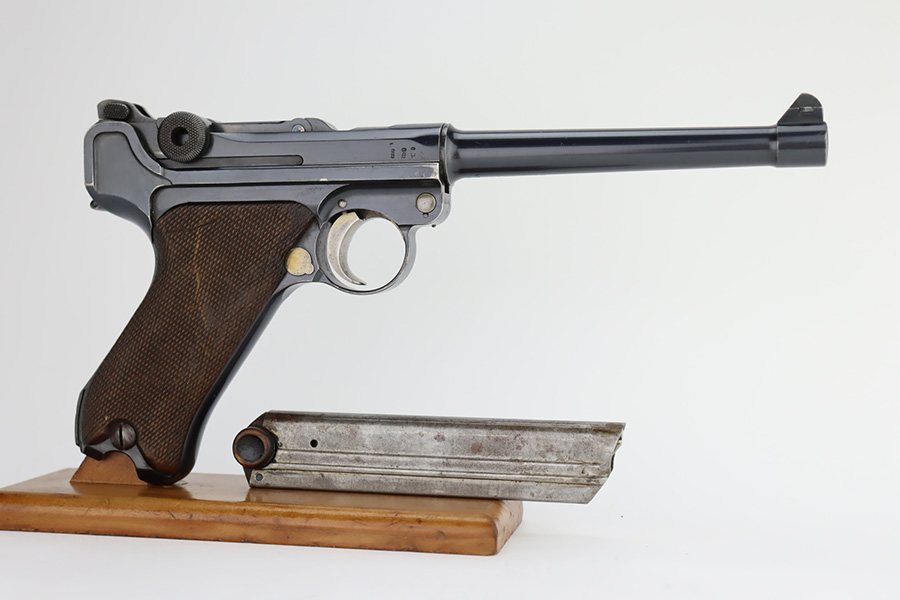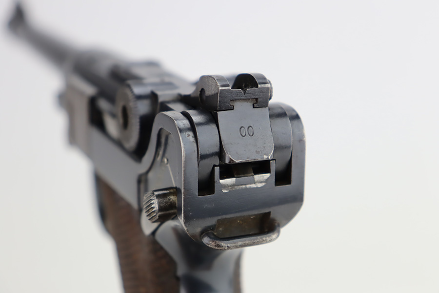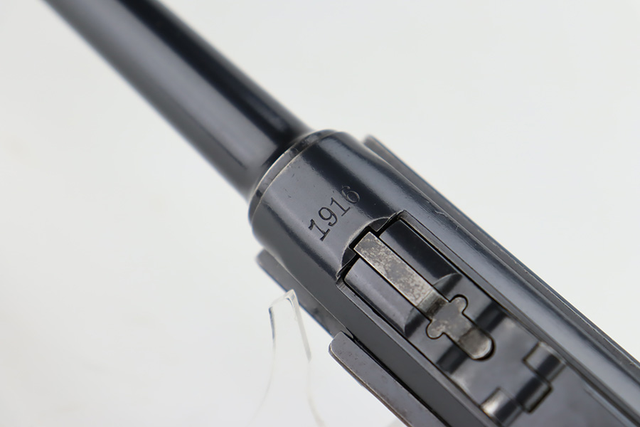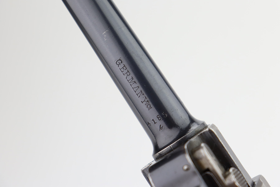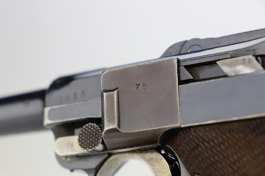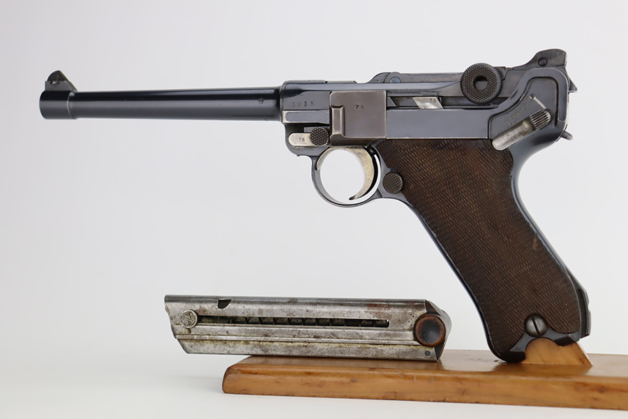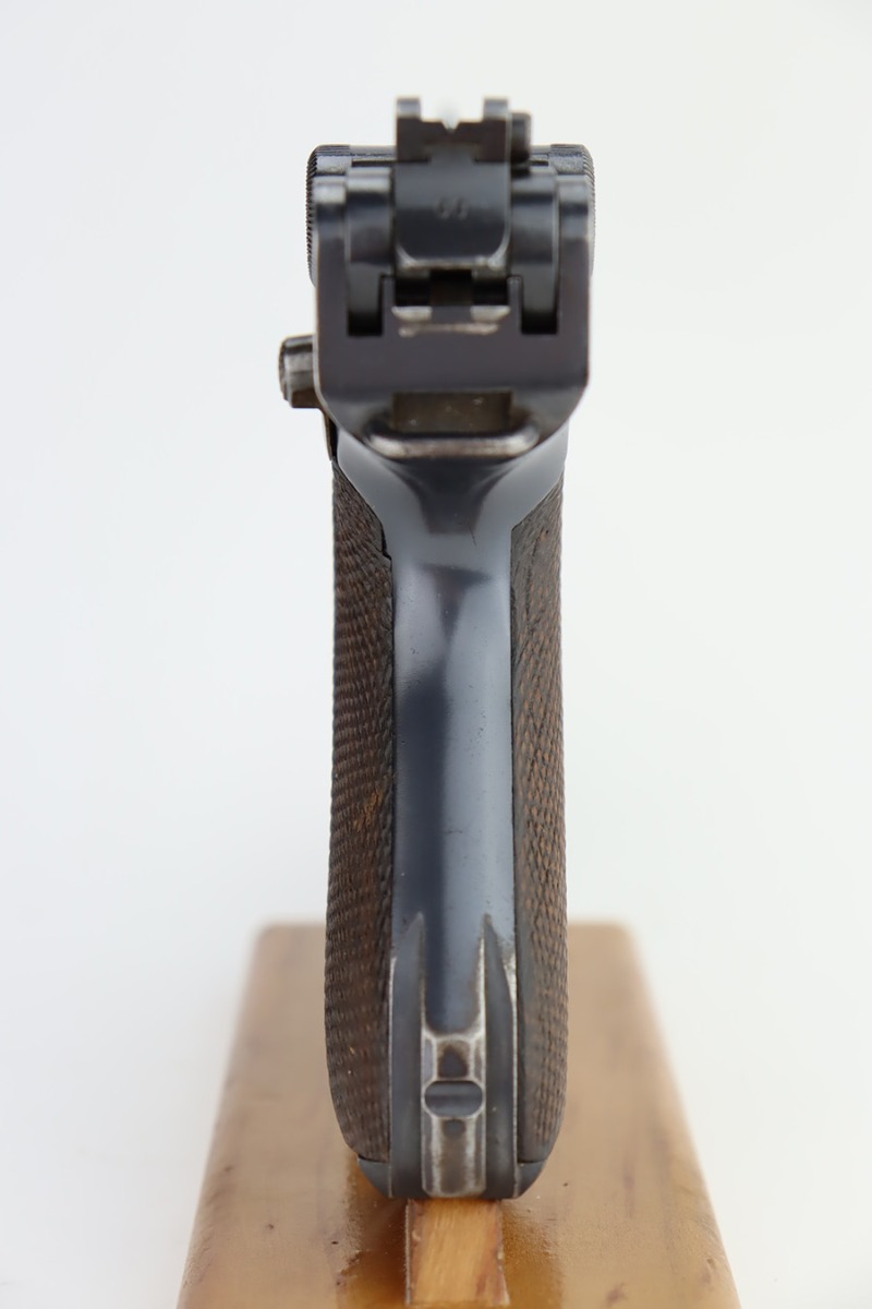 12/6/23 – This is a very nice DWM Navy Luger put together from parts. It is mismatched, has Imperial military proofs on the slide, and has a “Germany” export marking on the barrel. The bluing rates about 96% with very minor wear around the muzzle and on the high edges, some minor wear at the base of the grip straps, and some brown patina on the side plate. The right grip panel is numbered and matches the frame, the left is un-numbered and has a tiny chip in the upper corner. Comes with an un-marked magazine. The bore has good rifling, but there is very light frosting throughout.