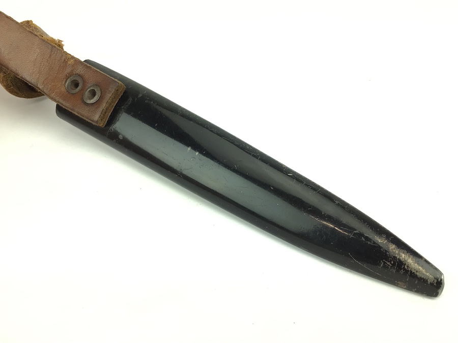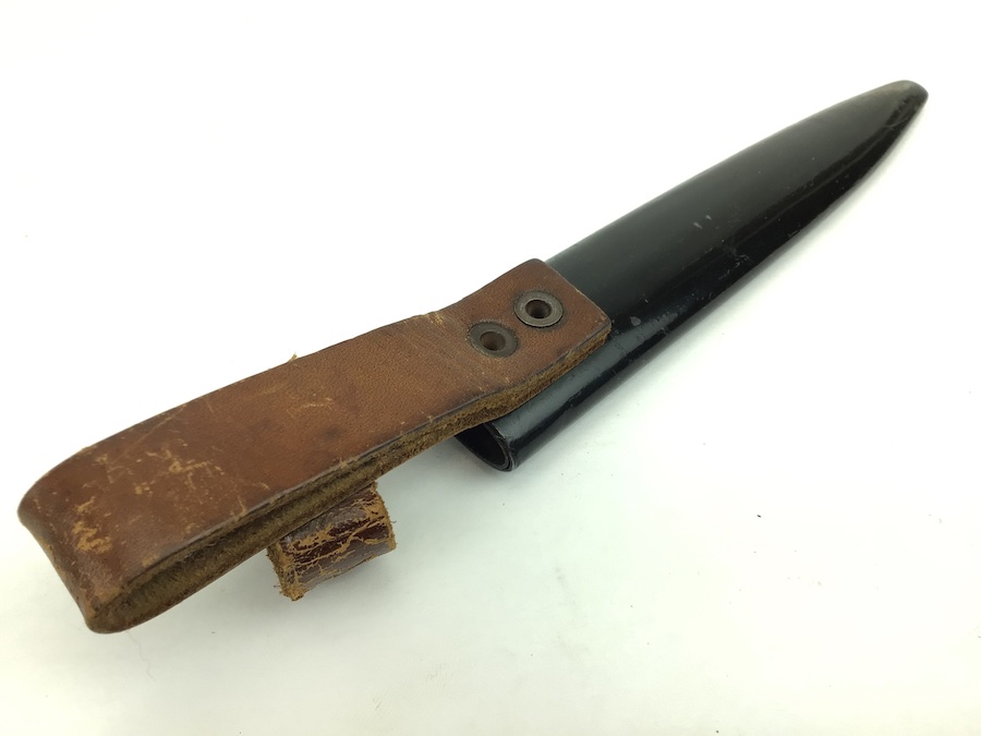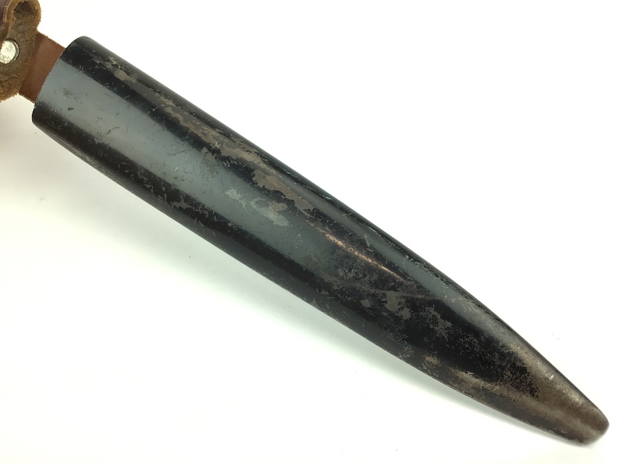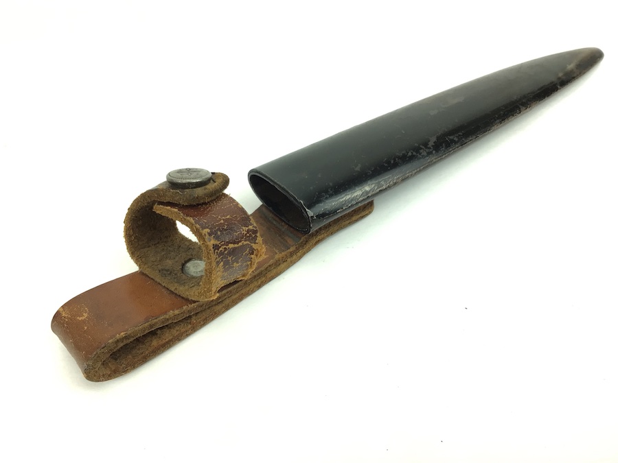 9/22/21 – Original and great condition WWI era boot / trench knife. Unmarked. Blade has some age stains and minor wear, but no evidence of sharpening. Scabbard is in good condition with minor paint chipping. Leather and snap are intact and functional. A very nice collectible knife.