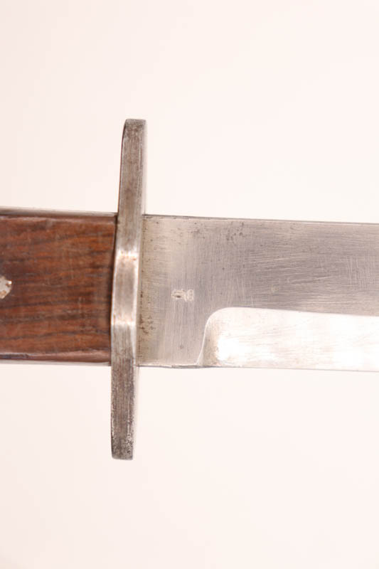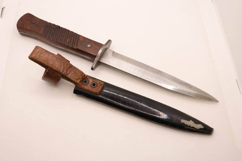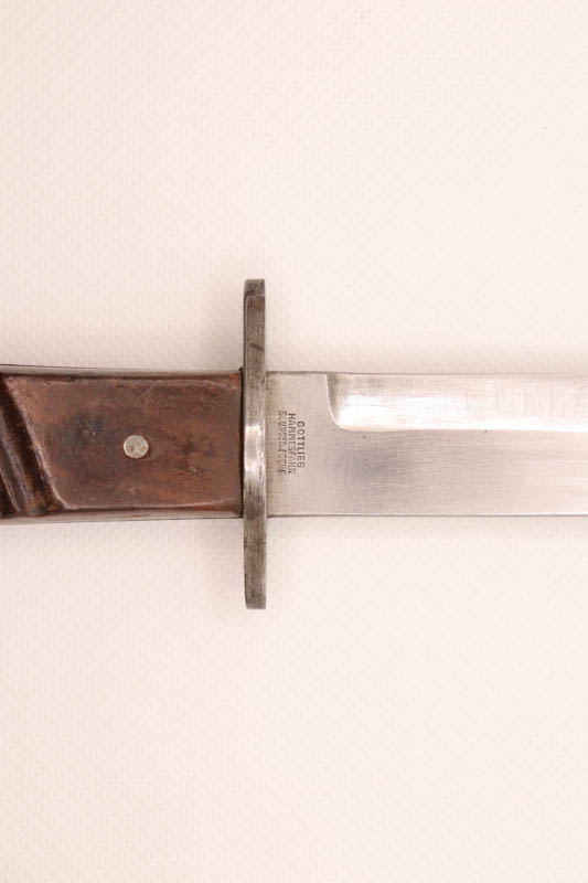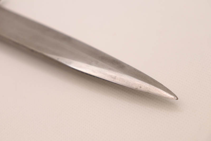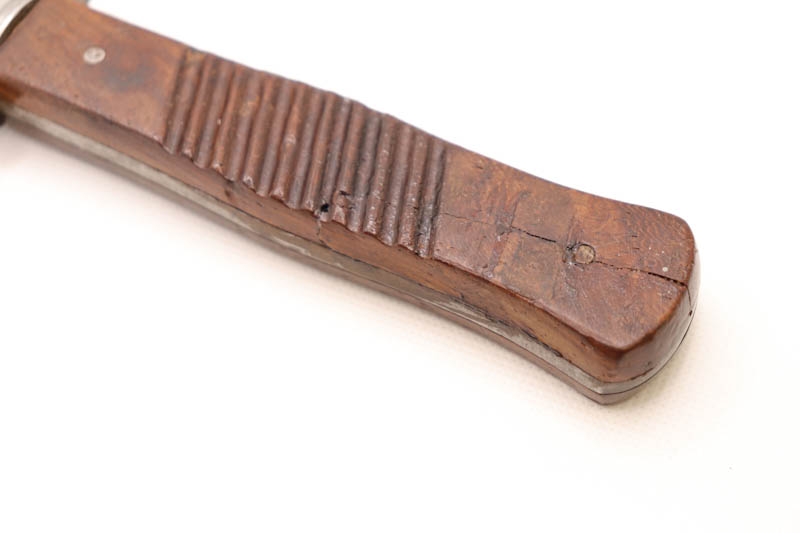 10/17/20 – This boot knife has a Gottlieb blade with a wooden handle. The scabbard is metal and comes with a leather frog. The blade is stamped “Gottlieb Hammesfahr Soligen.Foche” with a Crown D on the other side. The blade is about 7″ with a handle about 5″. The dagger has seen some rough use as its handle has been cracked and repaired, visible in photos. The blade is dulled but should sharpen well. Original WW1 boot knife.