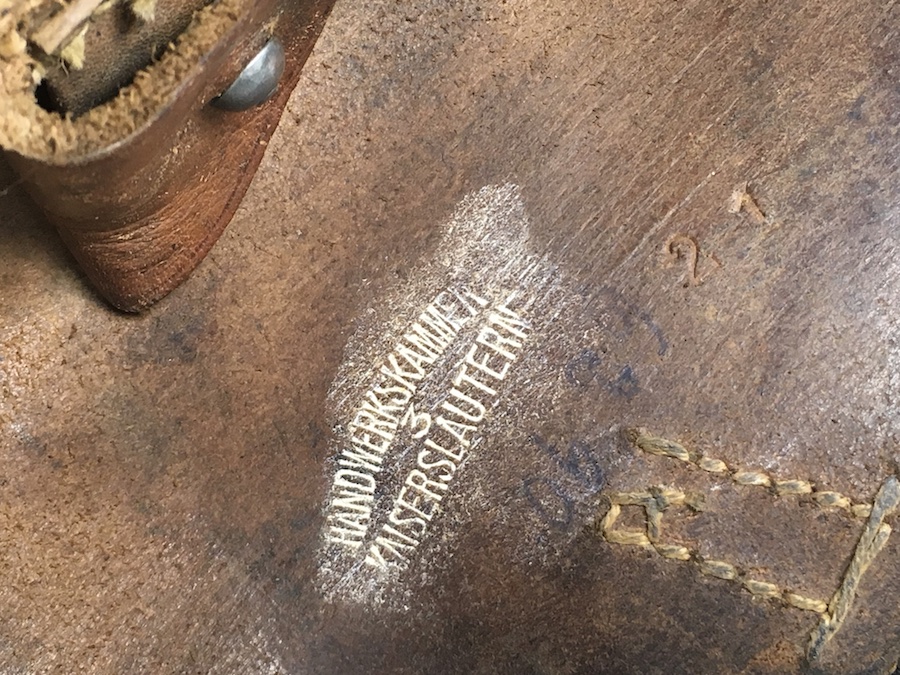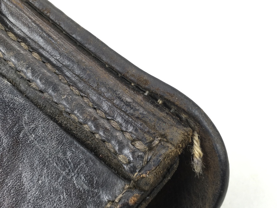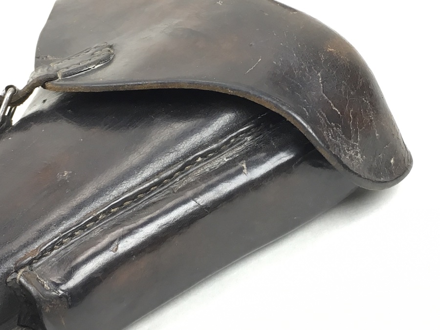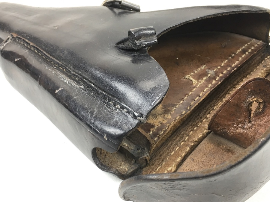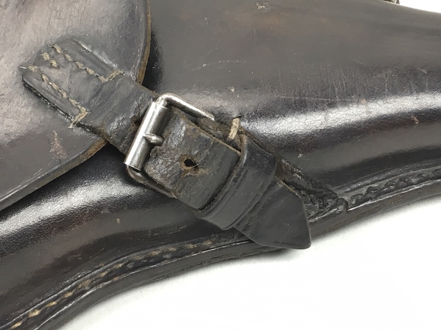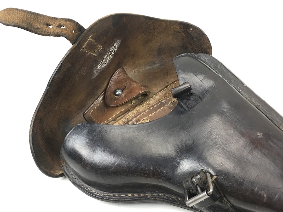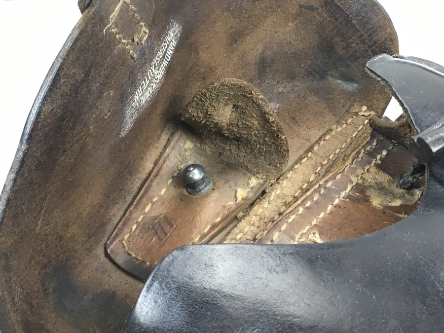 8/13/19 – This is an original, non-dated Luger holster from the WW1 era. The holster is maker stamped under the flap interior. The maker is “Handwerkskammer”. The numeral “21” is also stamped near the maker mark. We don’t believe this is a date stamp. The leather and stitching on this holster are excellent, especially considering the age. The leather is firm and clean with minor surface, age discoloration. The stitching is all in tact and original. There is a small area at the hinge flap where the threads are slightly loose but completely secure. Clean interior and secure lift strap. The roman numeral III is pencil marked on the tool pouch. The maker stamp is crisp and clear.