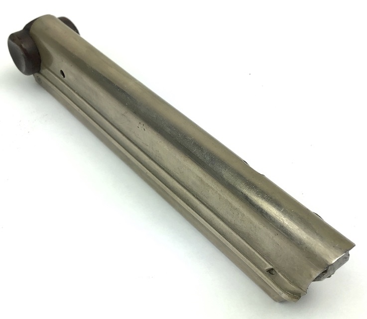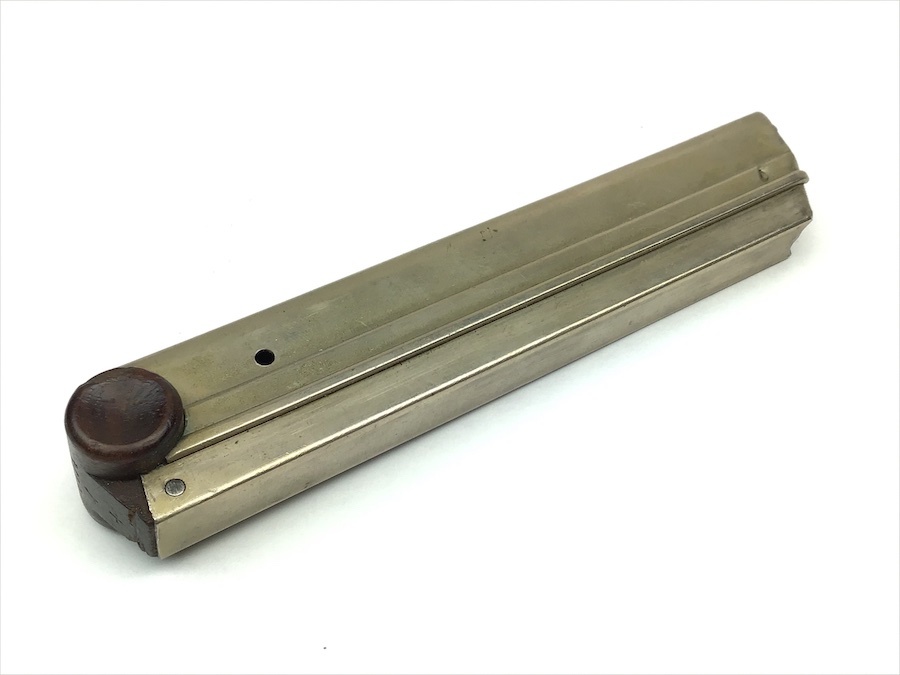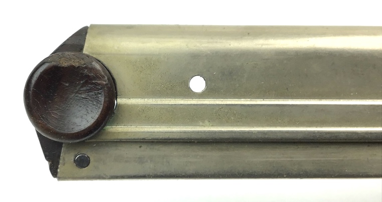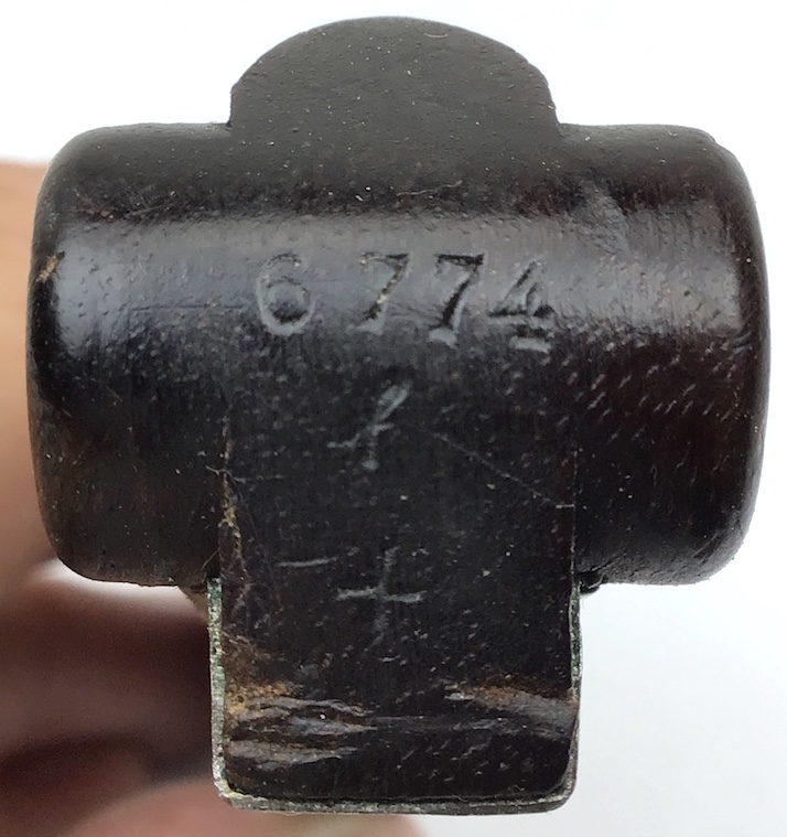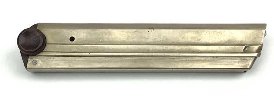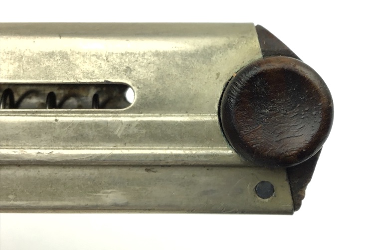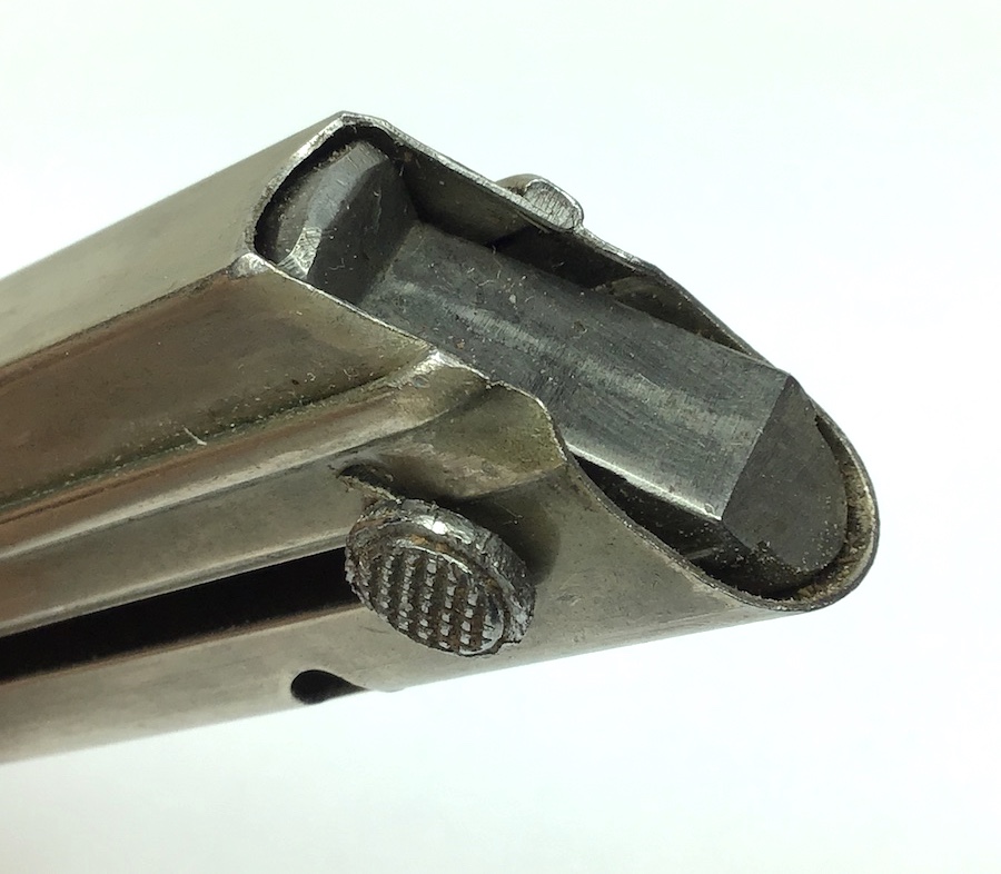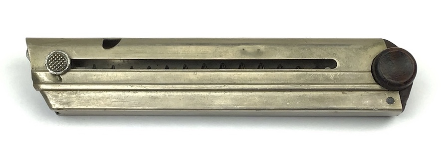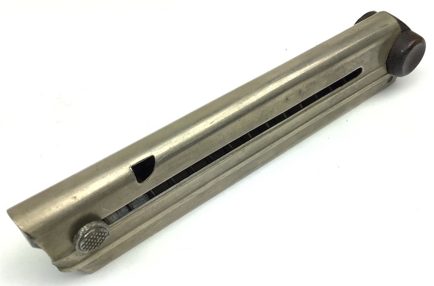 6/10/20 – This is an original WWI production Luger magazine. This magazine is in excellent overall condition. The base is solid with no cracks and one small chip on the left side. Serial number “6774 f” stamped into the base and a “+” below that. Very nice, clean tube has minimal wear. Strong, fully functional spring.