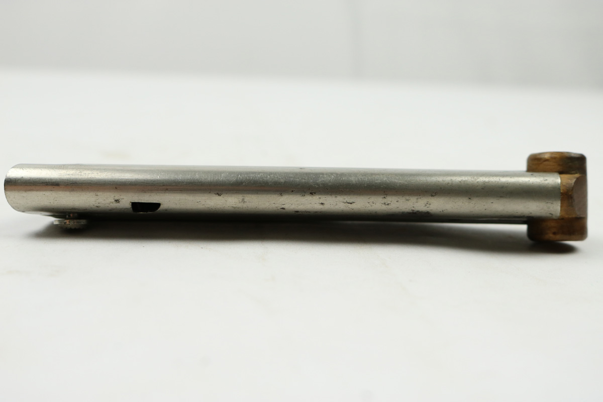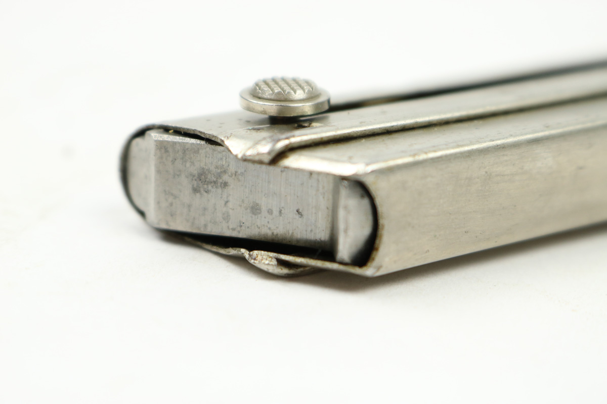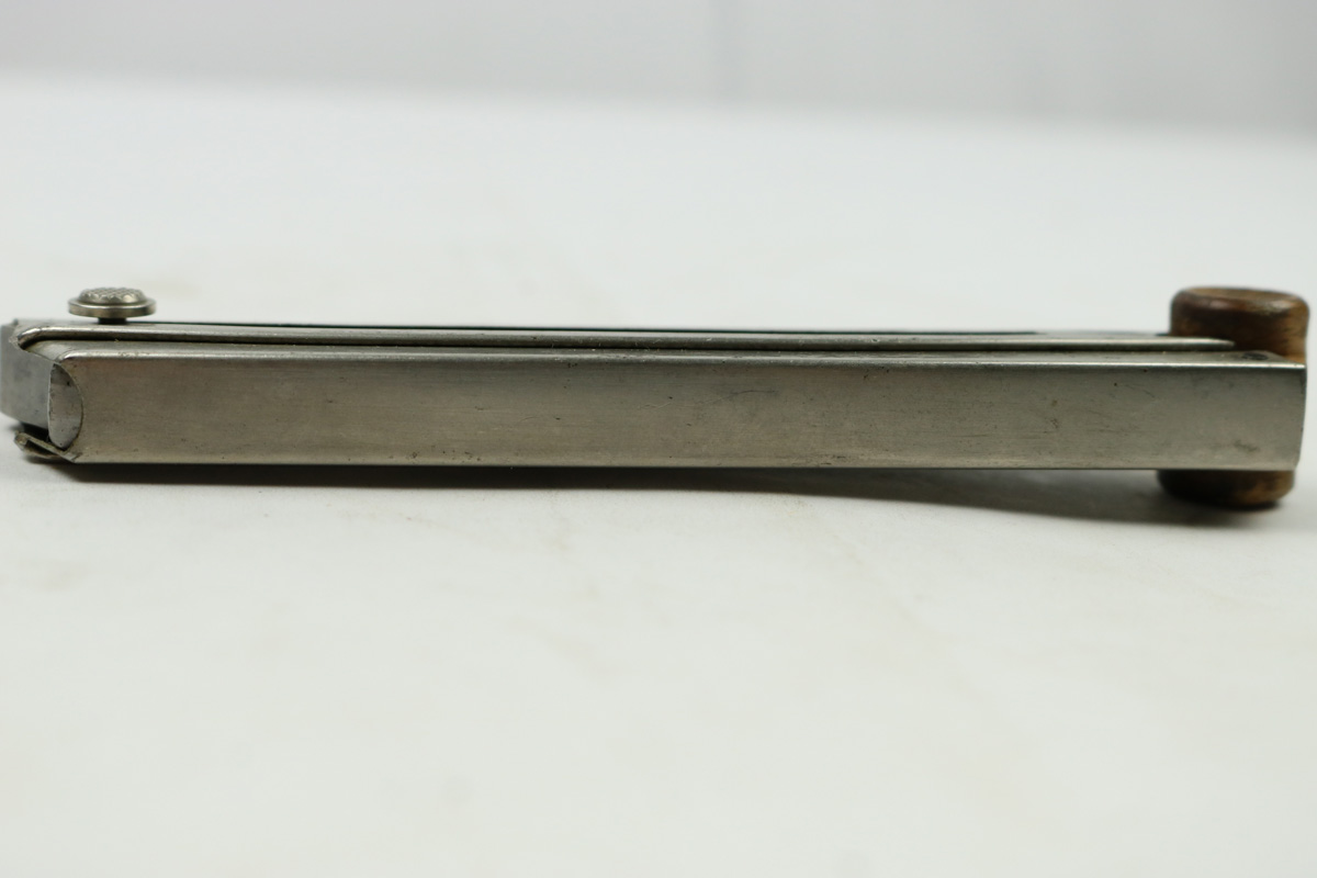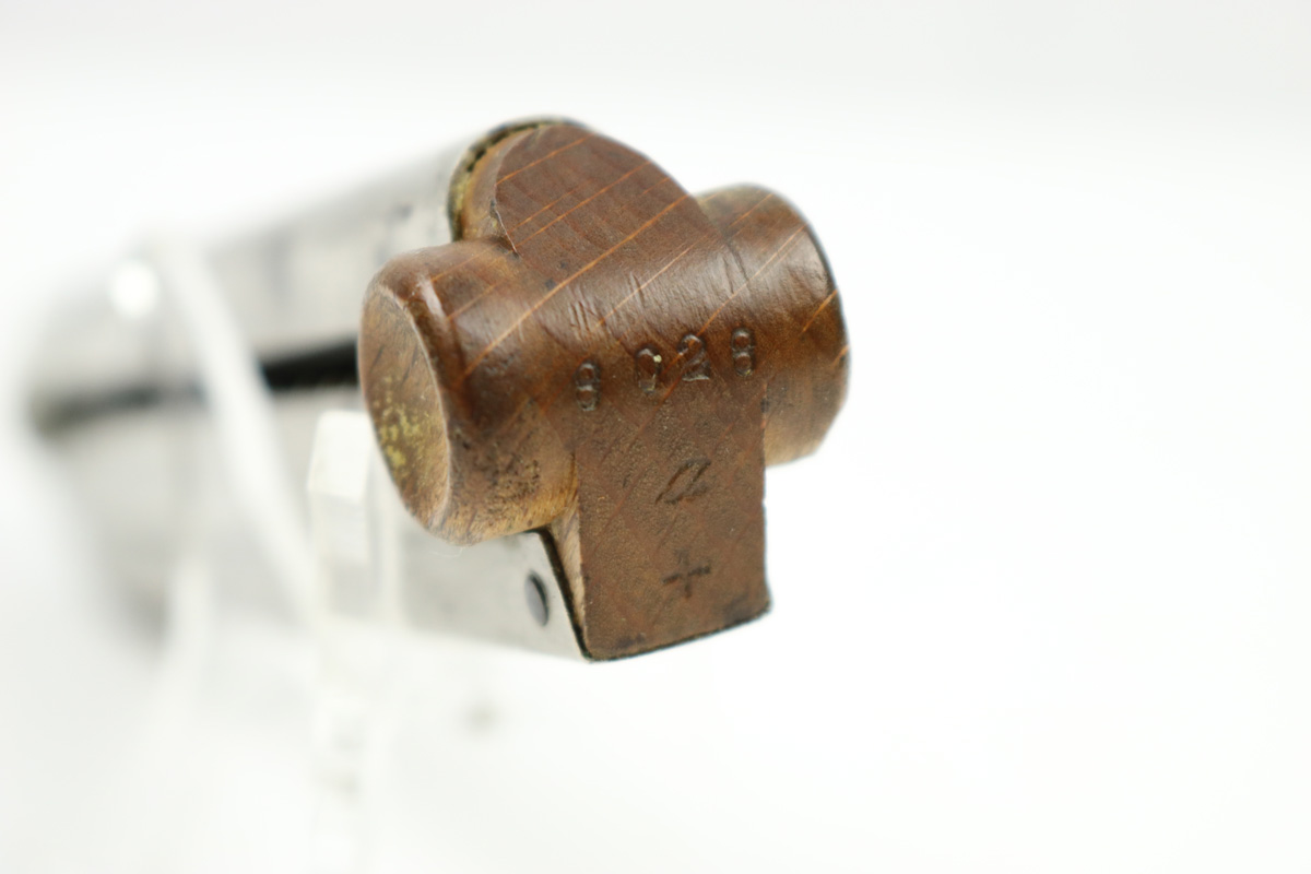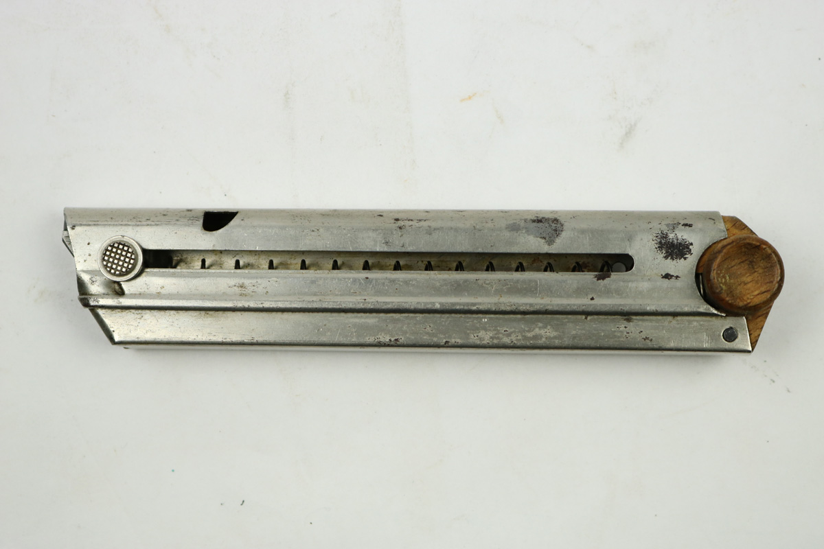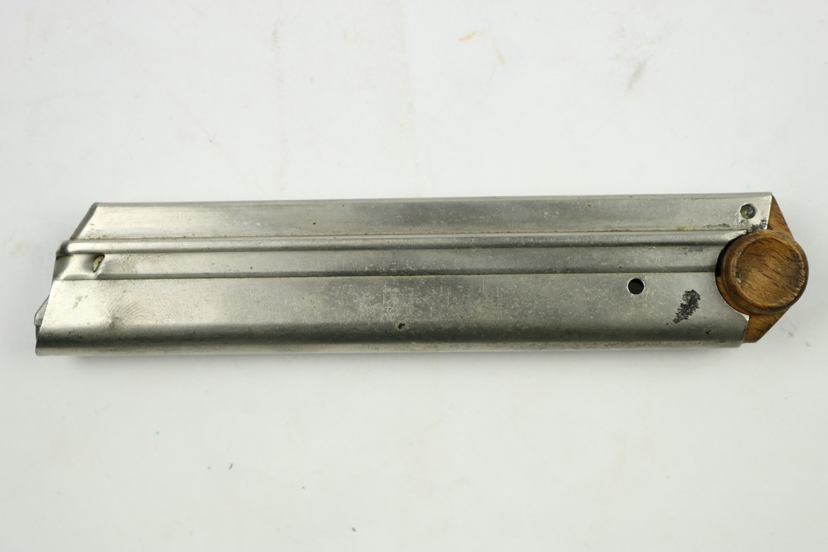 8/1/18 – This is an original WW1 Luger magazine. The magazine has an aluminum frame and a wood base. The base is in minty condition with a strong serial number stamp and “+” sign. There’s no imperial or Erfurt proof stamp though, meaning this could have been for a commercial or police gun. The frame has some oxidation on both sides. The right side has more wear than the left. Strong, fully functional spring.