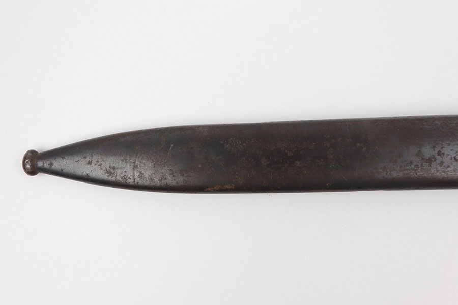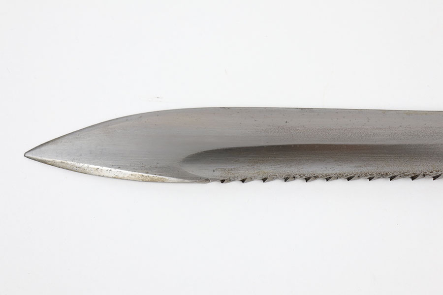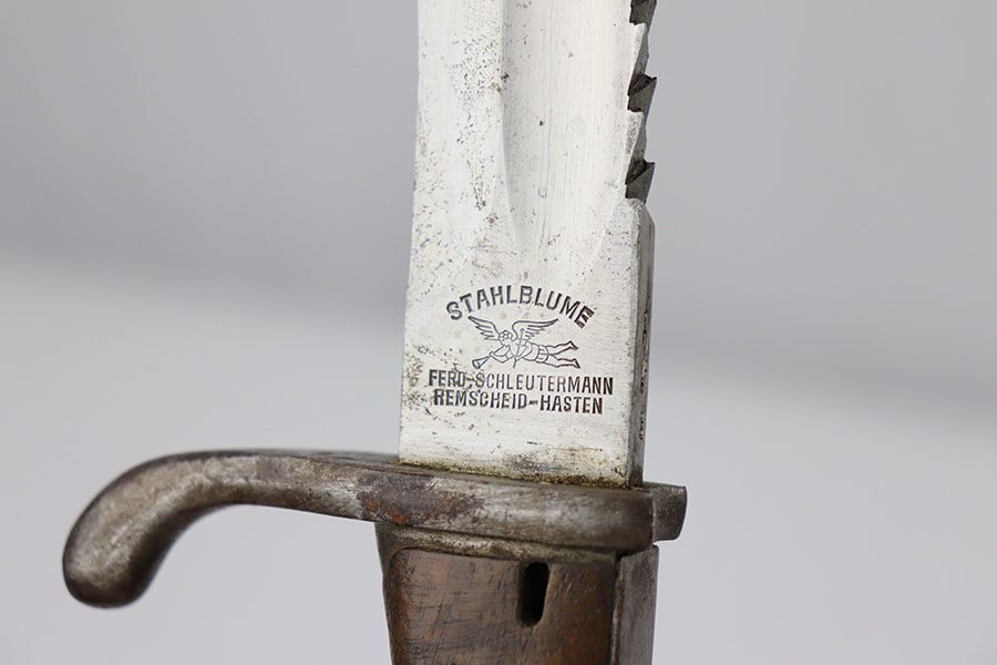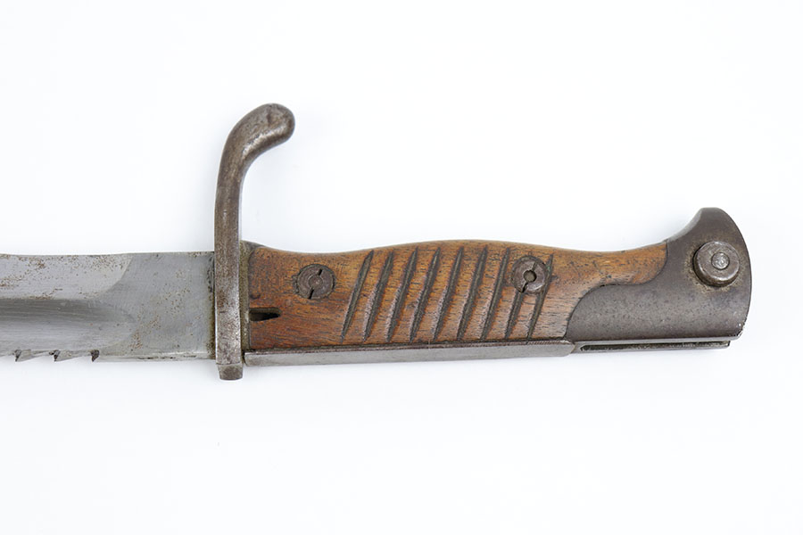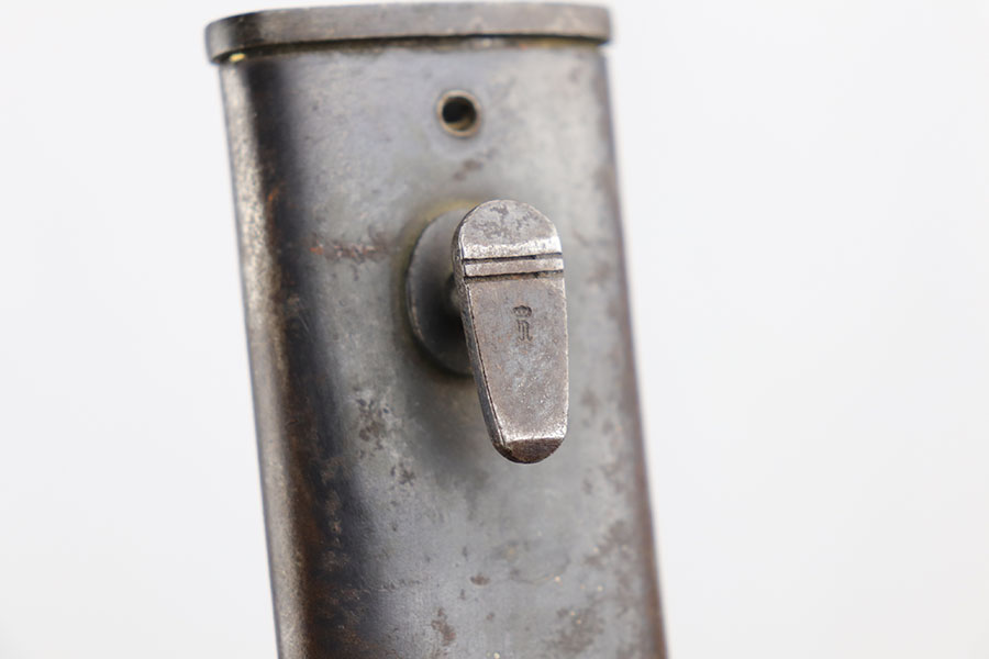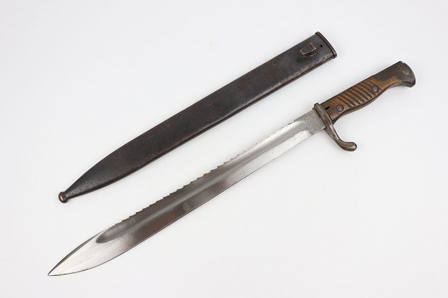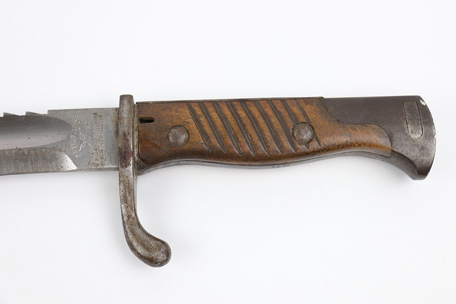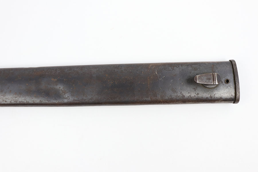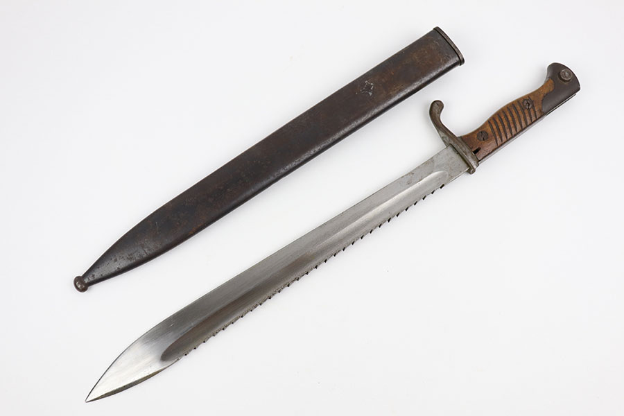 9/30/19 – This is a WWI era production German rifle bayonet with a “sawback” spine, a feature seldom seen today as these were outlawed by the Geneva Convention. This butcher bayonet would be attached to a Gew. 98 or similar German rifle. The blade is excellent with a strong maker stamp on one side. Very minimal wear on the blade. The scabbard has some speckling wear / rust throughout but no major dents or flaws. Imperial proof stamped on the handle. Also proofed stamped on the scabbard and scabbard hook (for leather frog). See photos. Wood grip has no major / notable issues. All original and authentic.