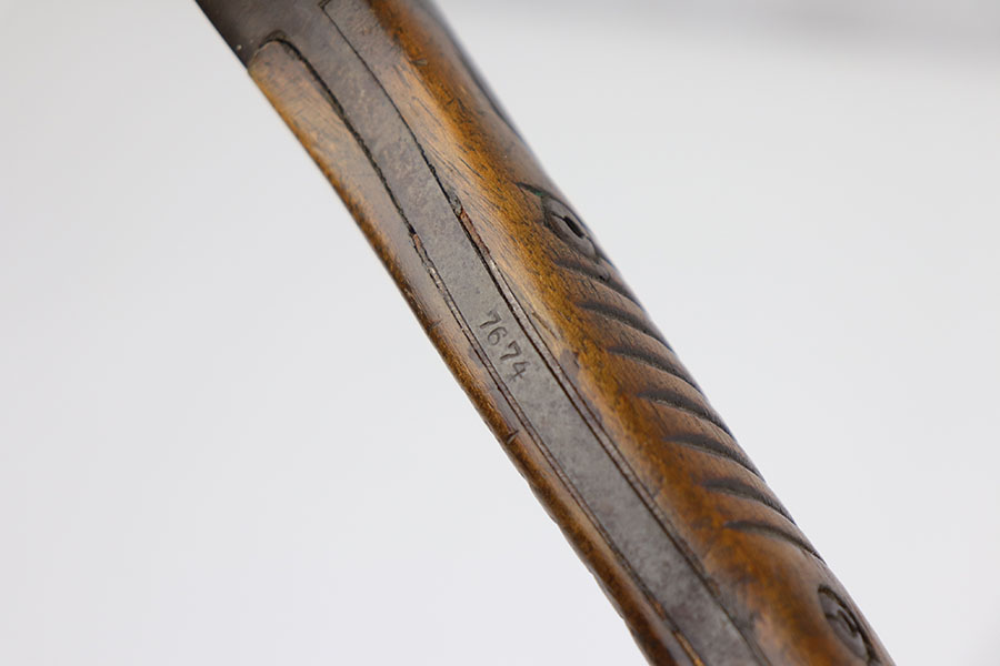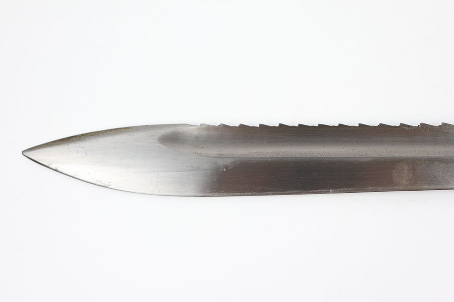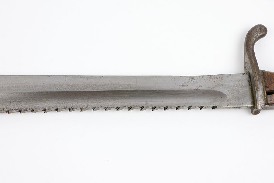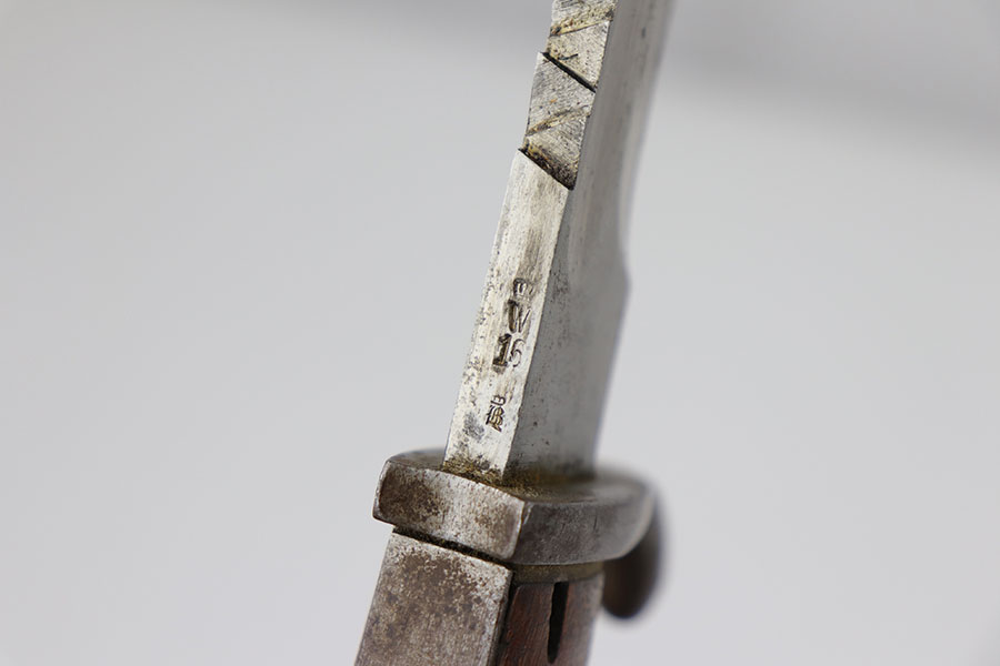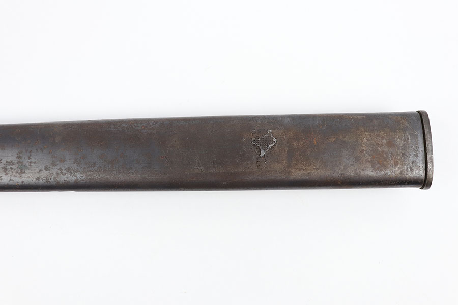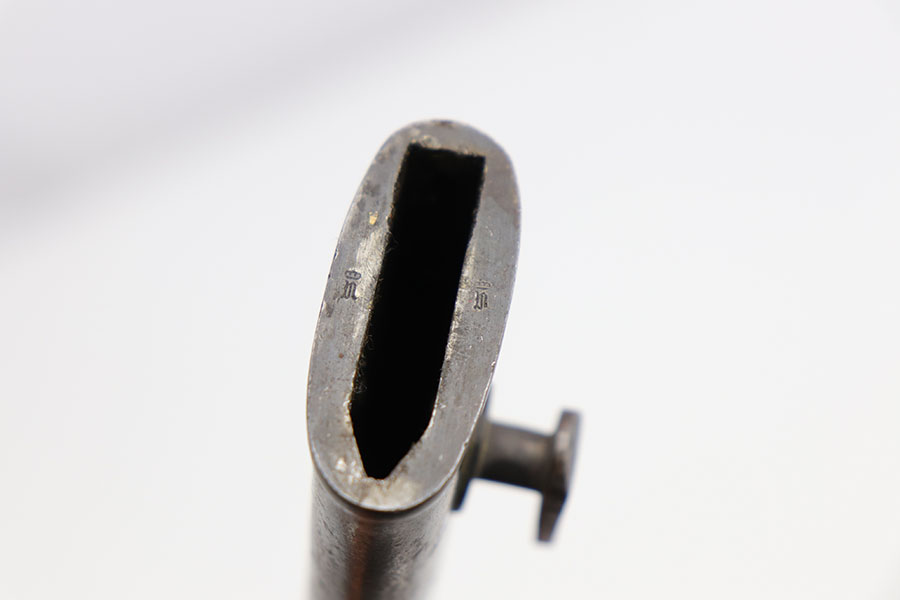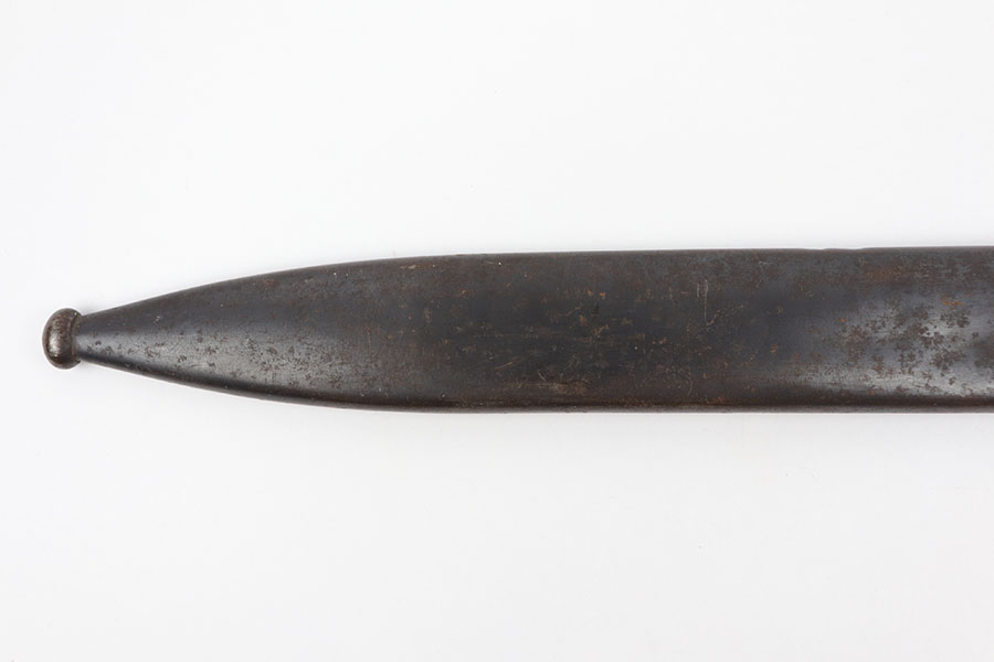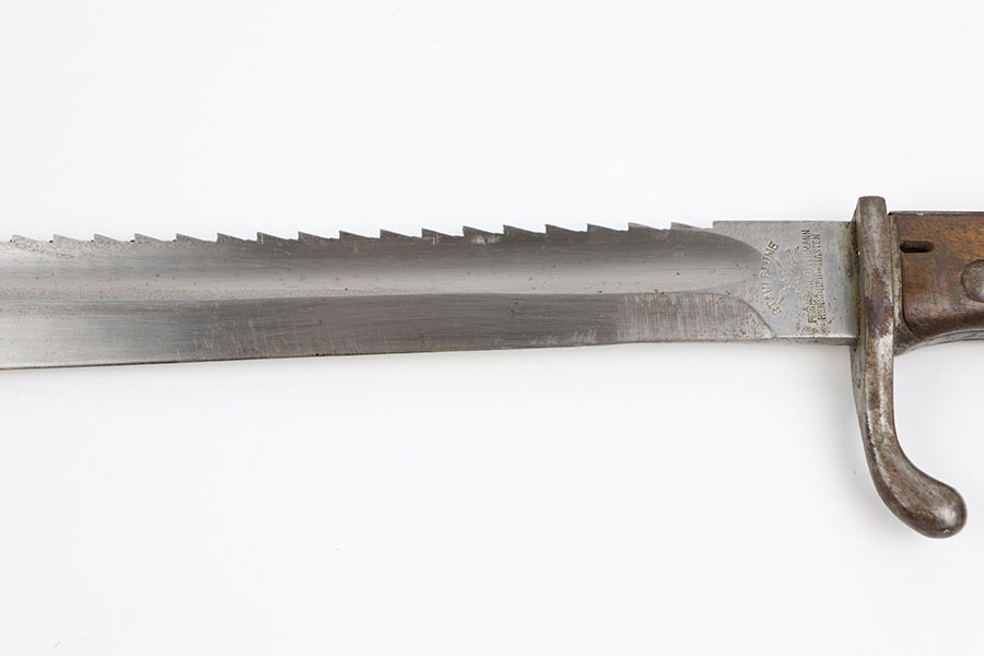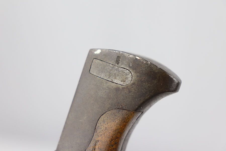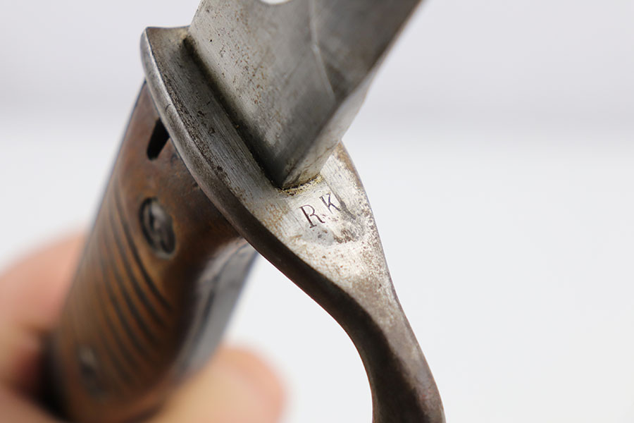 9/30/19 – This is a WWI era production German rifle bayonet with a “sawback” spine, a feature seldom seen today as these were outlawed by the Geneva Convention. This butcher bayonet would be attached to a Gew. 98 or similar German rifle. The blade is excellent with a strong maker stamp on one side. Very minimal wear on the blade. The scabbard has some speckling wear / rust throughout but no major dents or flaws. Imperial proof stamped on the handle. Also proofed stamped on the scabbard and scabbard hook (for leather frog). See photos. Wood grip has no major / notable issues. All original and authentic.
