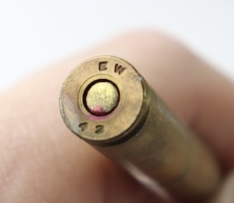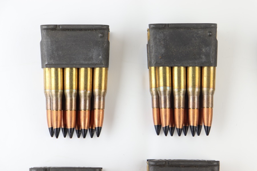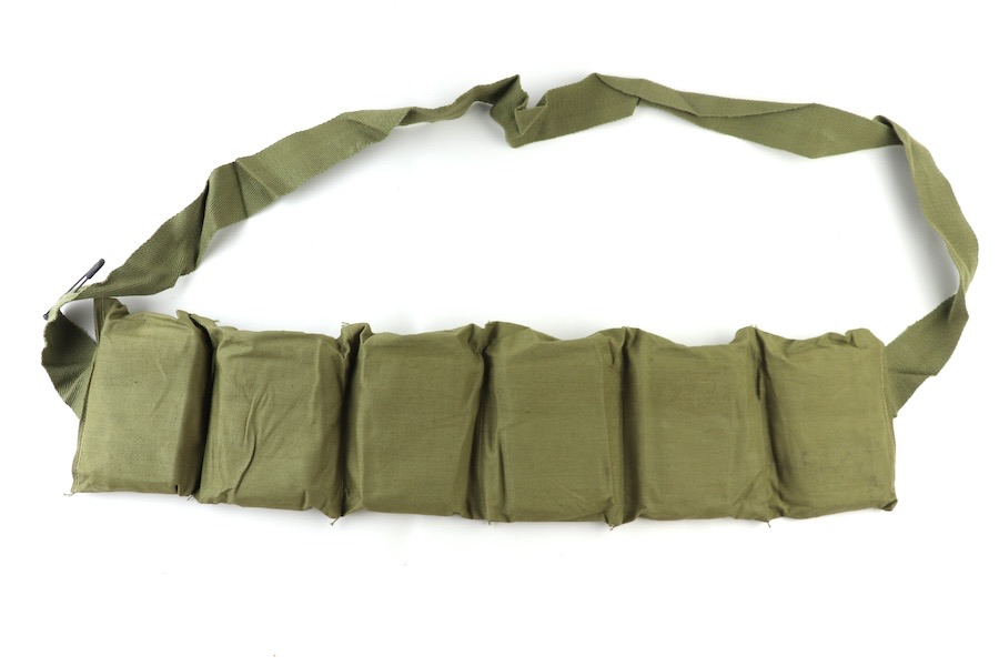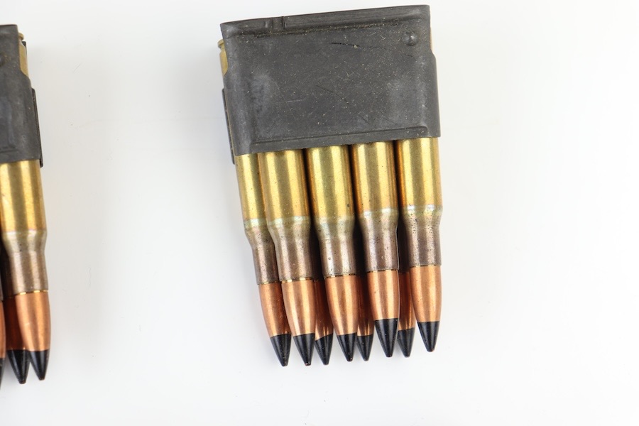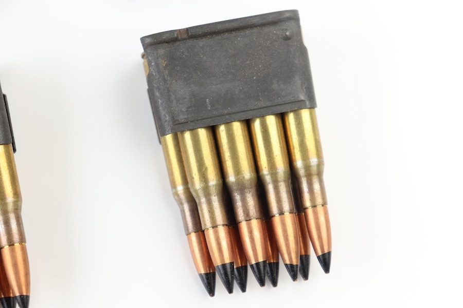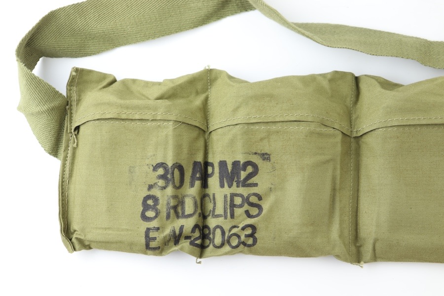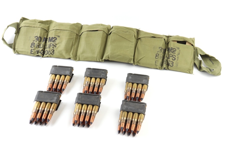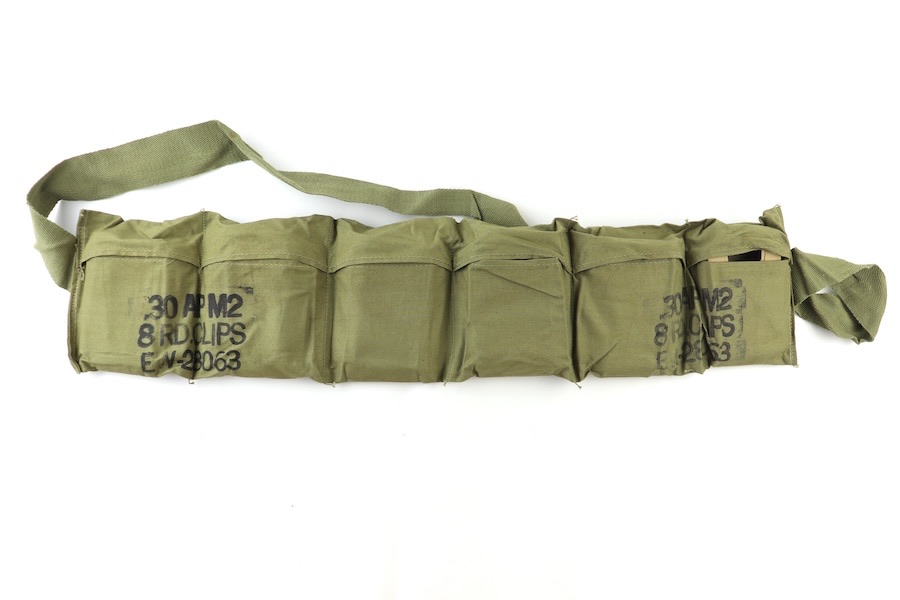3/27/24 – Located at our Ohio office. Multiple, full bandoliers available. Price is for one full bandolier. Each bandolier includes 48 rounds of armor piercing 30-06 WW2 ammo, 8 EN-Block clips, and a bandolier. All rounds are in very good condition. Some rounds may have areas of discoloration. Also features the original cardboard covers within the bandolier pockets. The projectiles are magnetic, indicating their steel core authenticity. Head stamp reads EW 42. The bandolier has fully legible ink stamps, no rips or tears, and tight and original stitching. These pictures are representative of the multiple quantities we have in stock.