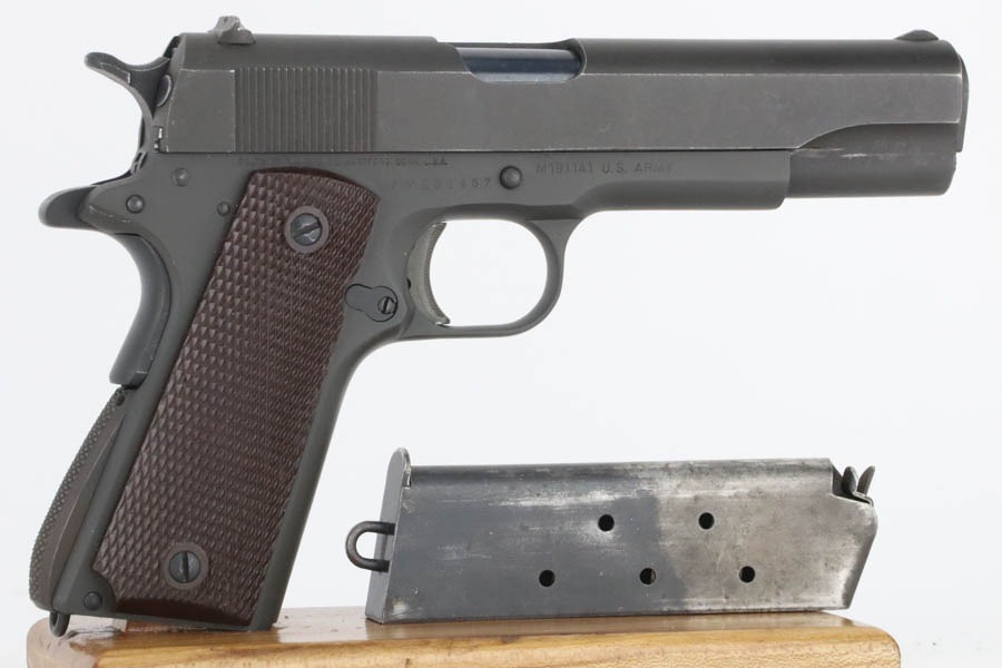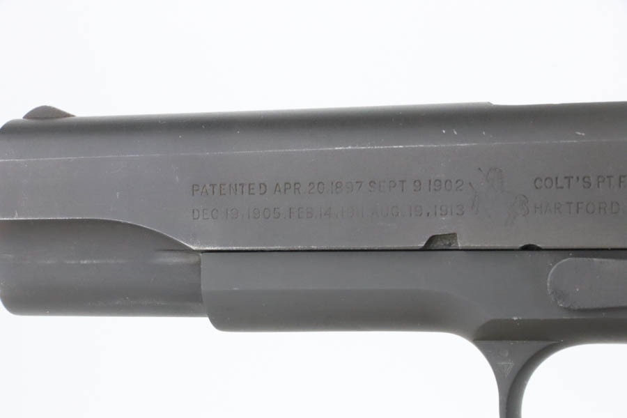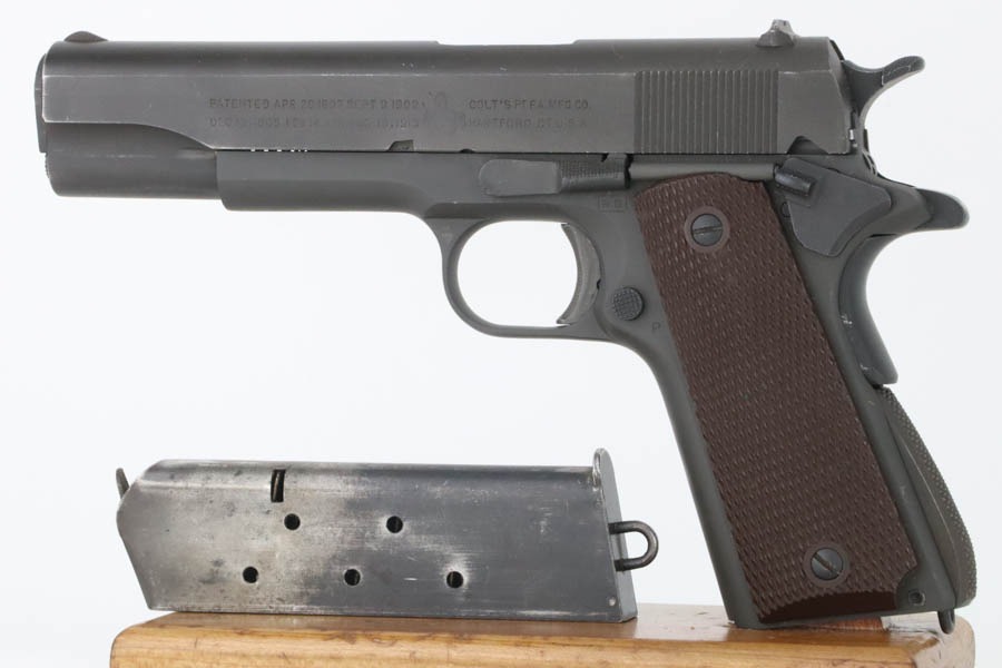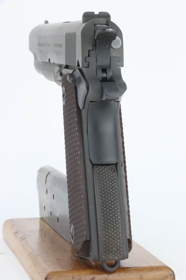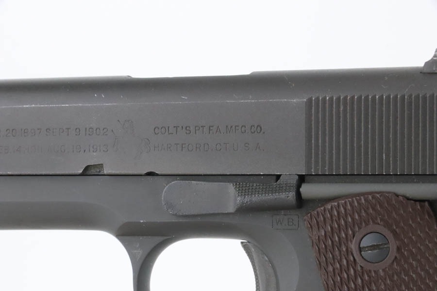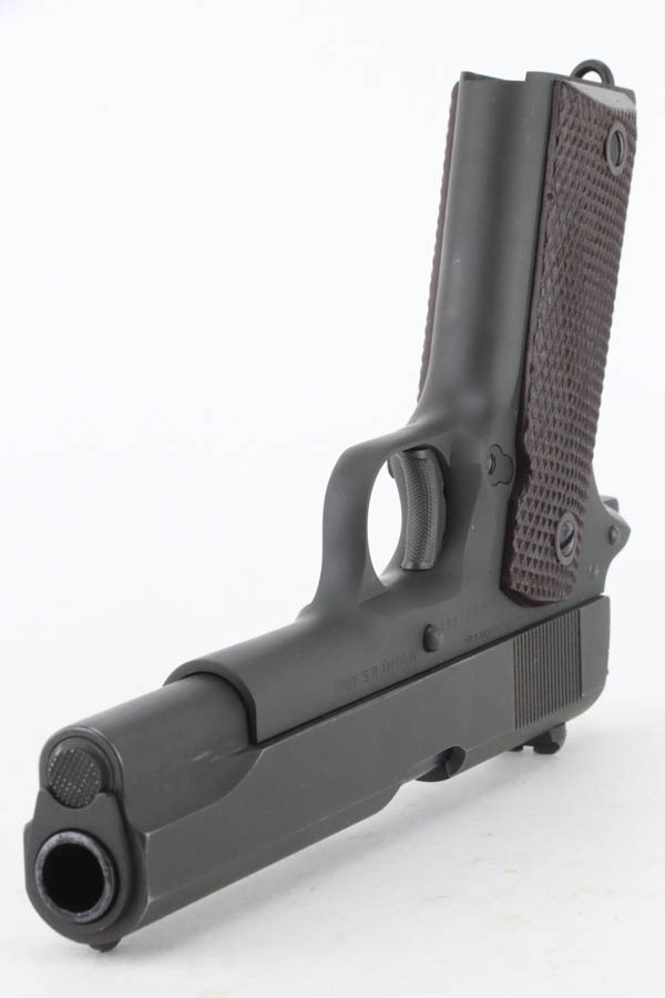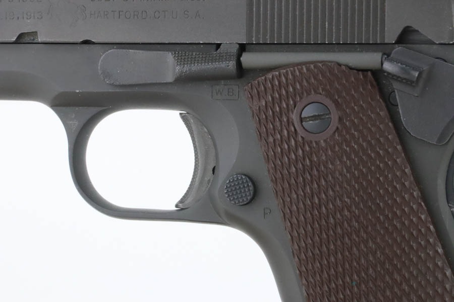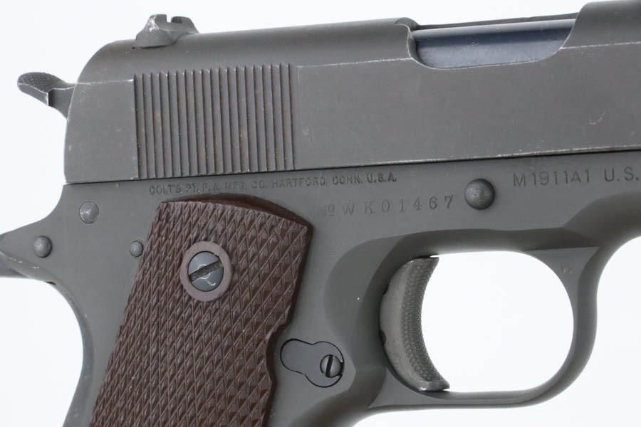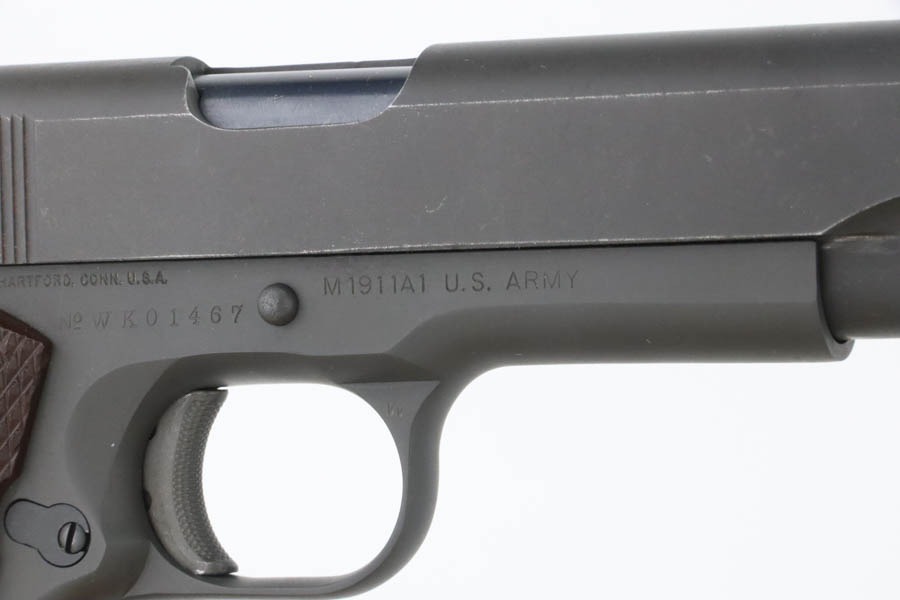 12/3/24 – This is a minty ANIB Colt M1911A1 that was part of a limited (4,000 guns) reproduction run of military style pistols that Colt did in the early 2000s. The gun is designed completely to WWII specs, including the markings such as the WB inspectors mark on frame. They were given special serial numbers, with the first batch receiving a “WK” prefix, which represented then-CEO of Colt, William Keyes. This gun shows maybe 1% rub wear and has been fired a little, but is in otherwise excellent shape. Mint bore. Comes with one magazine. FFL required.