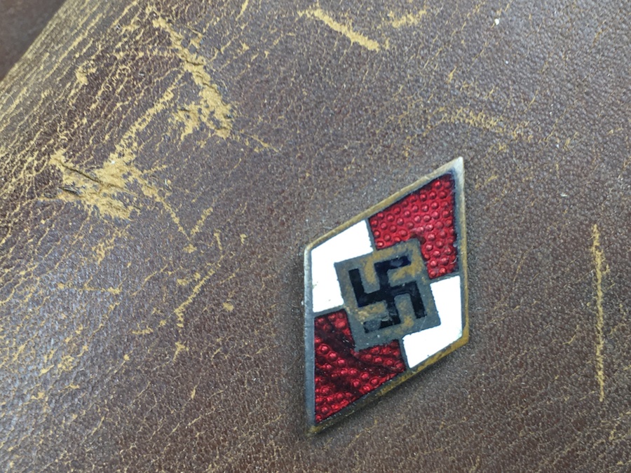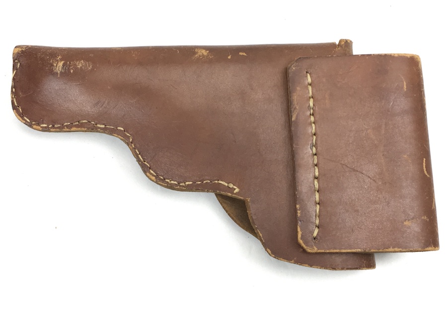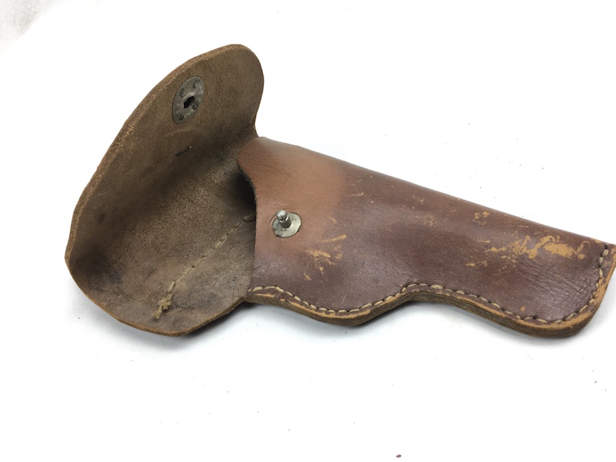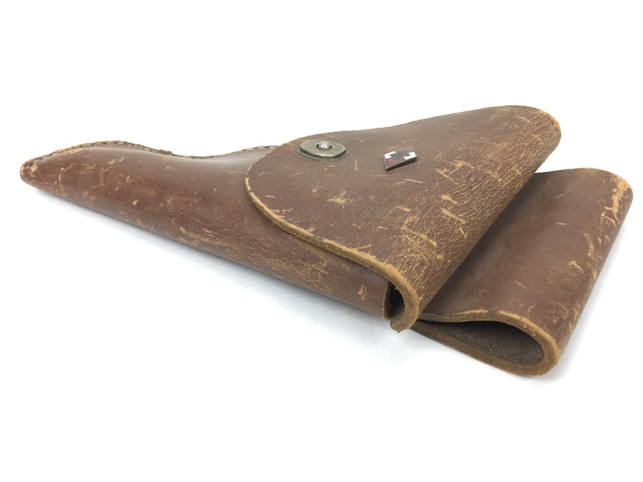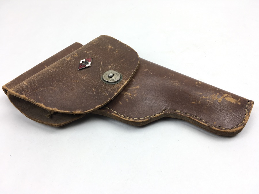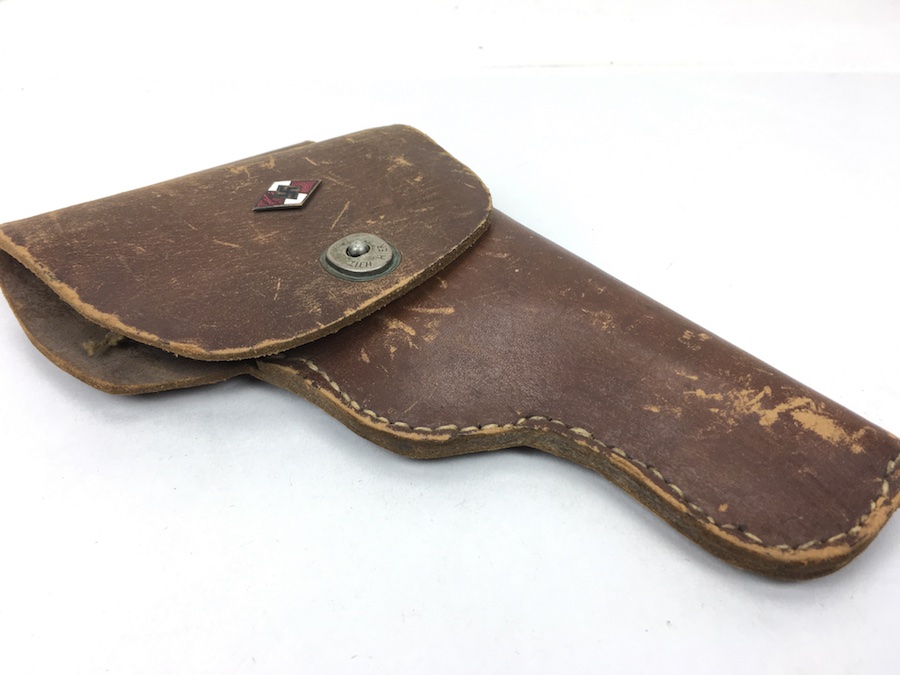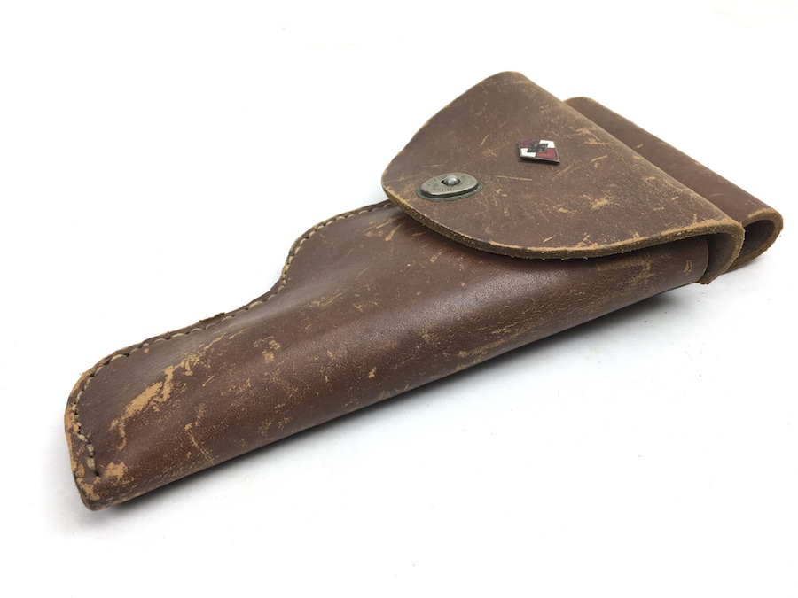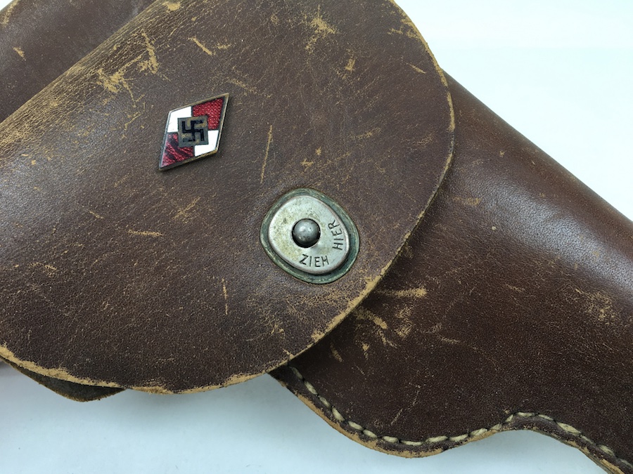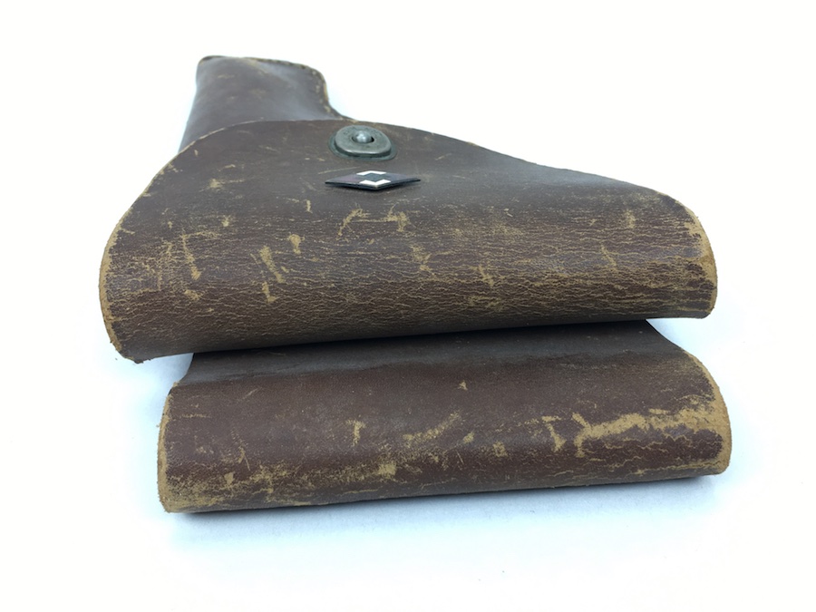 7/1/19 – This is an original WWII era holster embellished with a Nzi Youth emblem. The holster is Un-dated and un-marked. Some minor surface scuffs. Stitching is intact. Holster measure 8″ from top of closure flap to tip of toe.
