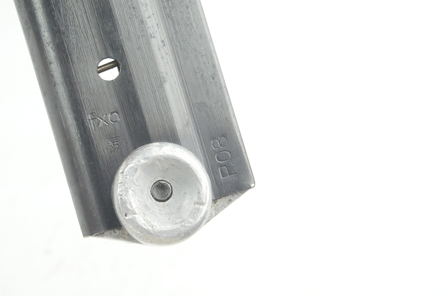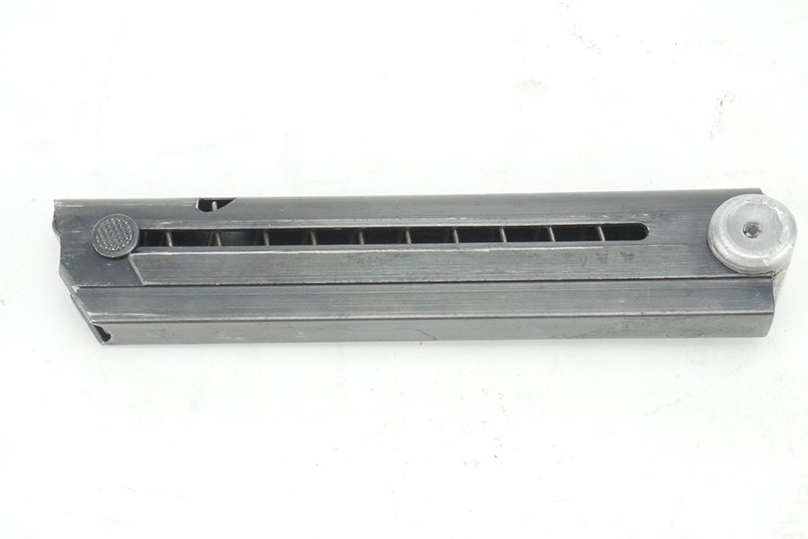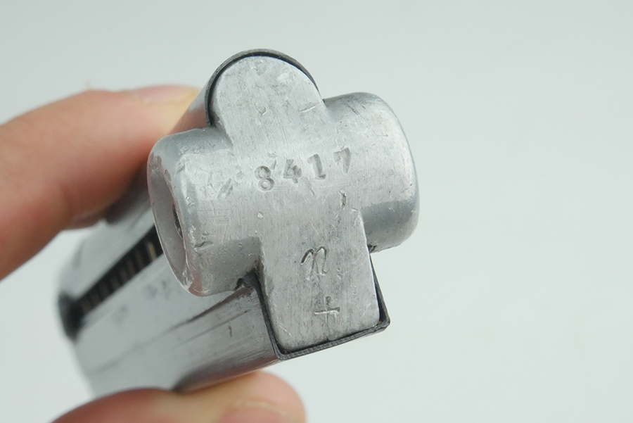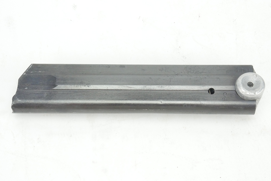 6/20/24 – This is an original Haenel Luger magazine from WWII. The magazine has a blued tube and aluminum base, marked with serial numbered 8417n. The tube has excellent original bluing, with minimal surface wear. The left side of the tube is “fxo” stamped with two eagle 37 military proofs. The spring is strong and fully functional. Some dings around the perimeter of both sides of the base.