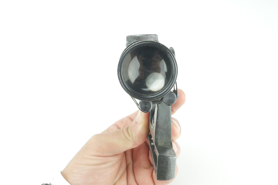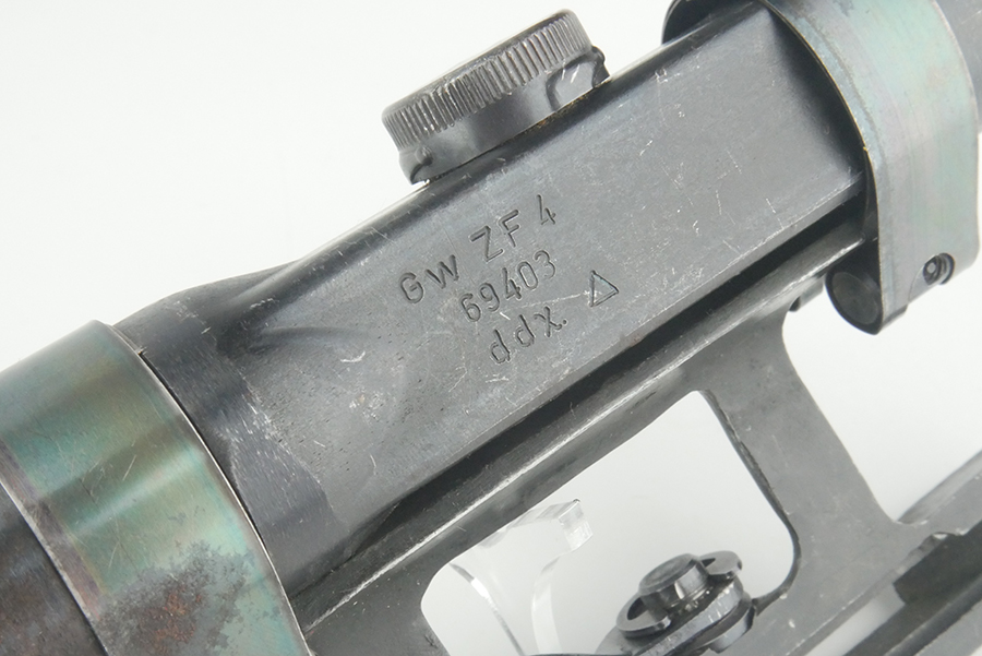 9/17/24 – This is a great example of a ZF4 scope made during WW2. The scope body in in great condition and maintains almost all of it’s original finish. The scope is stamped on the left side of the body ” Gw ZF 4 69403 ddx”. The optics on this scope are cloudy, however you can still see through the scope and see the reticle. The scope mount is a reproduction mount.
