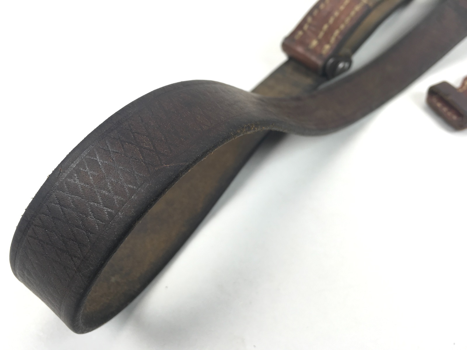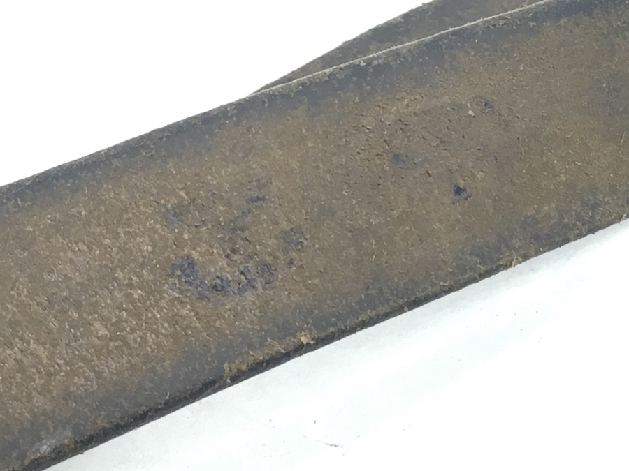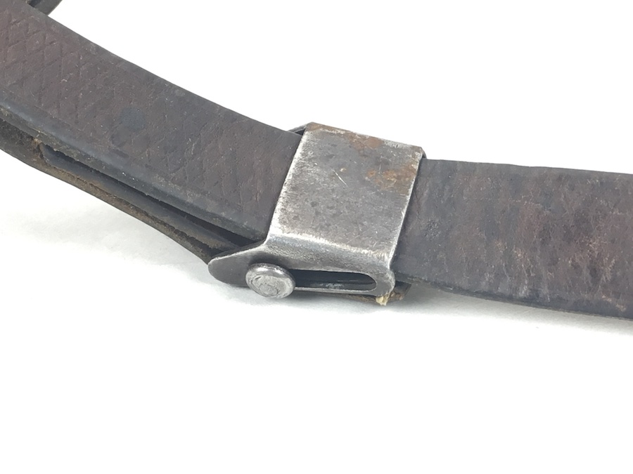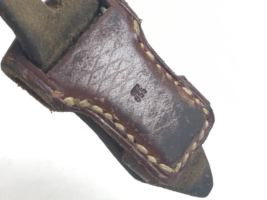 7/11/19 – This is an original leather strap for a K98 rifle manufactured during WWII. The buckle is un-marked. E/655 military proof stamp is on the rear of the keeper stud. Waffen eagle WaA??? and maker code is faintly stamped on the rear of the sling. Something you don’t often see because these were worn off during use. The leather is soft, strong and completely in tact with no notable flaws. About 80% original herringbone texture is still visible on the exterior. The stitching is all original as well without issues. Guaranteed original.