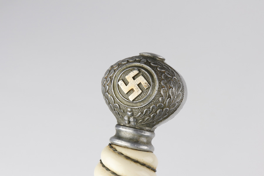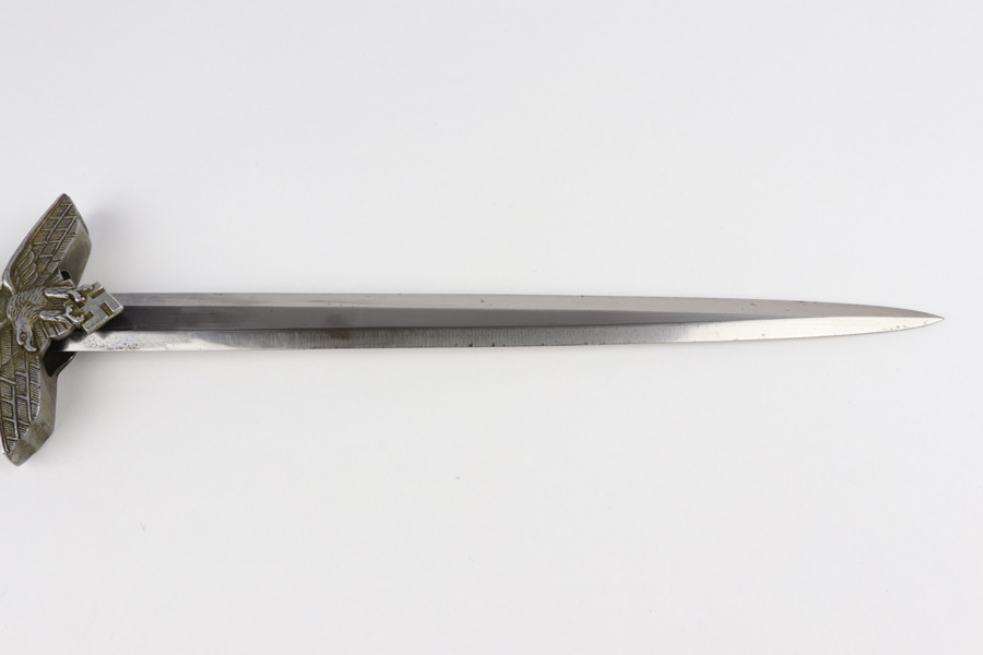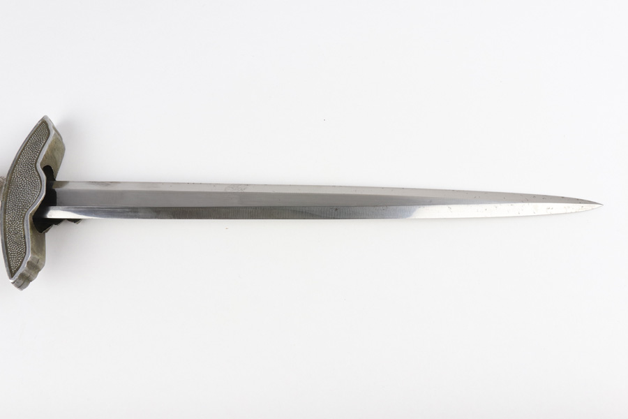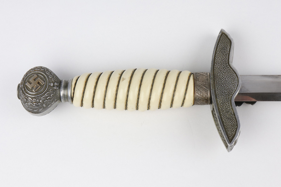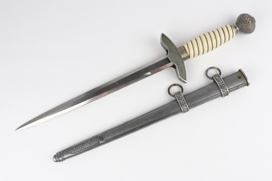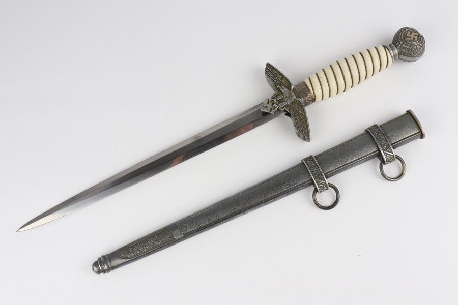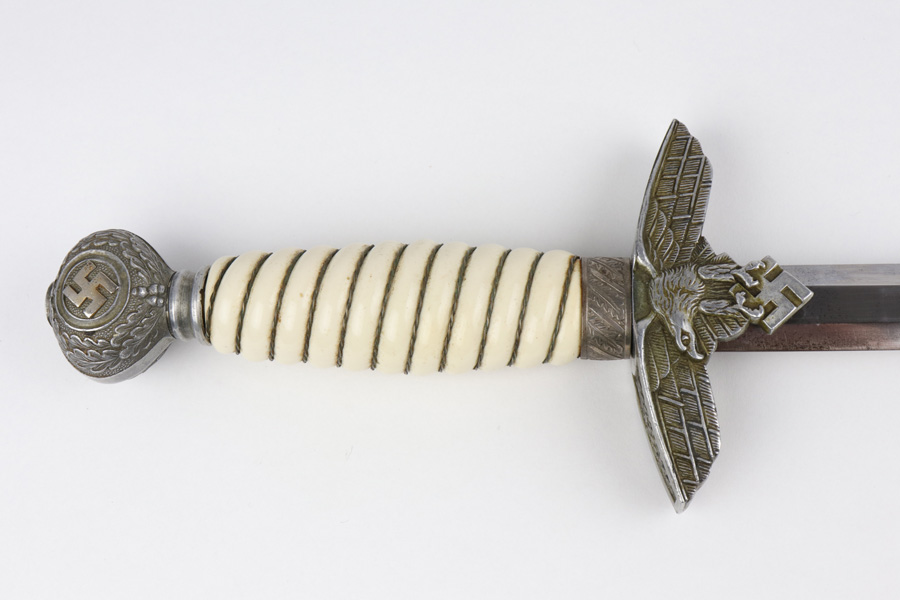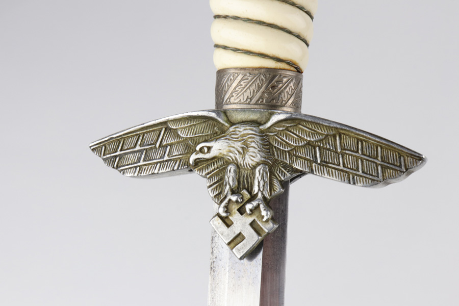 6/20/19 – This is an original WWII Luftwaffe dagger with an ivory colored bakelite handle. The blade is in excellent condition with very minimal wear. Excellent cross graining, proper signs of aging and appearance make us confident this is authentic despite having no maker stamp. No cracks or chips in the grip, and an excellent scabbard with no dents included.