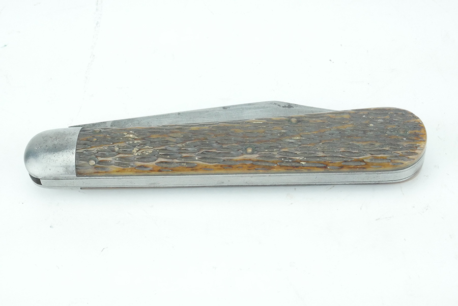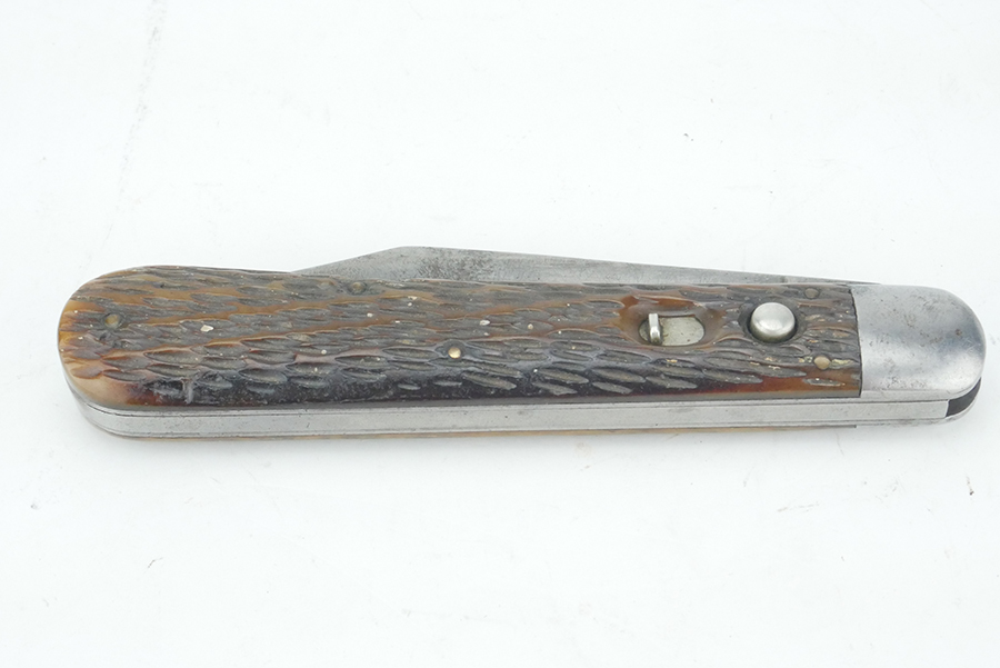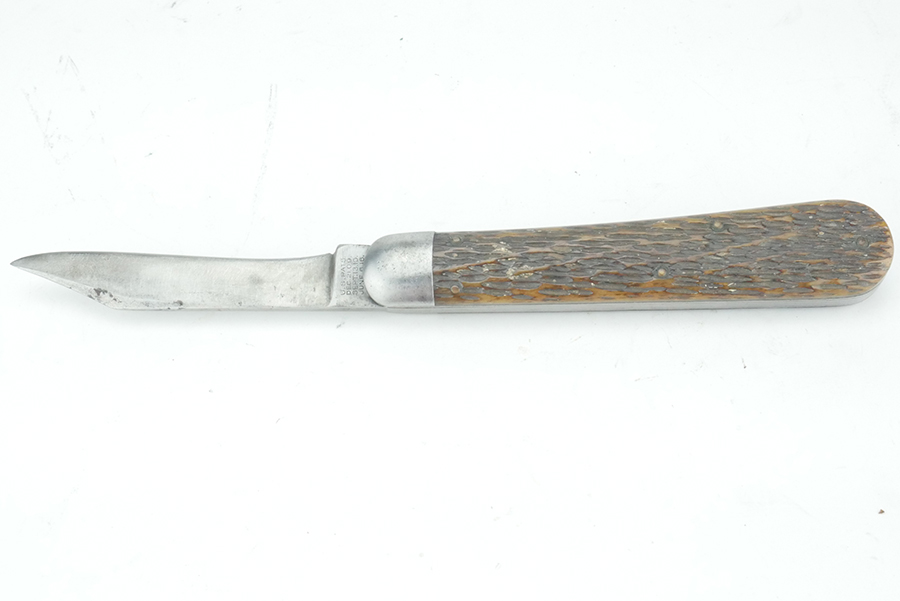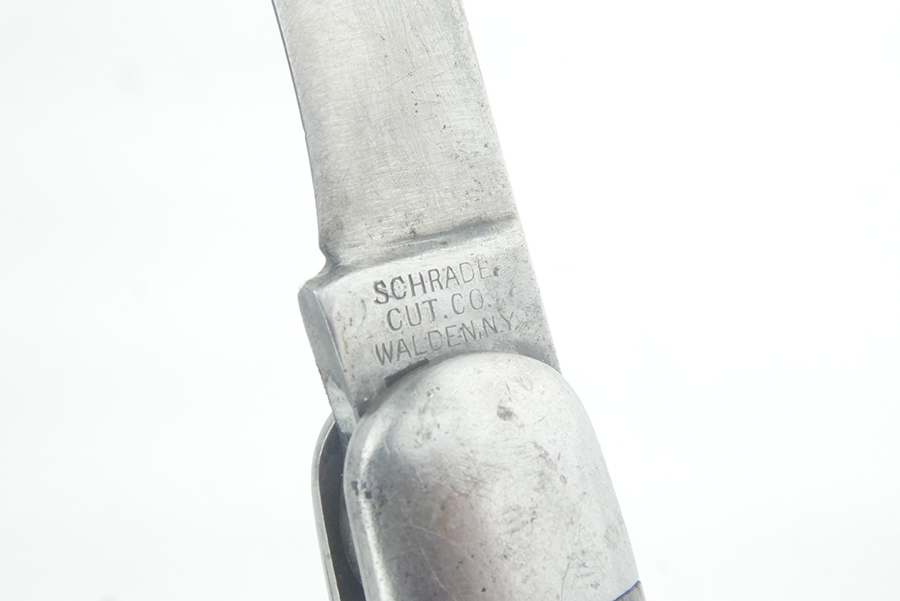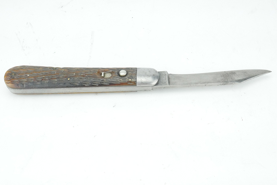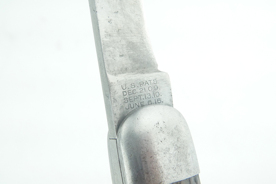 7/30/24 – This is an M2 Paratrooper Knife manufactured by Schrade and issued to the U.S. military during WWII. Clip point blade with ricasso marked, “Schrade CUT CO. Walden N.Y.” on one side and “US Pats Dec 29.09, Sept 13.10, June 6.16” on the other. Patented push button locking mechanism functions perfectly. Blade has been well maintained, but note it that has been sharpened lightly to retain a razor sharp edge. Bone grip panels have minimal wear, but no major issues. Blade’s length is approx. 3 1/4 inches, total length approx. 7 1/4 inches. These were placed in hidden compartments within paratrooper uniforms and were designed for easy access to cut the cord upon landing.