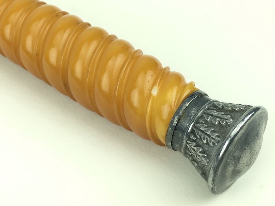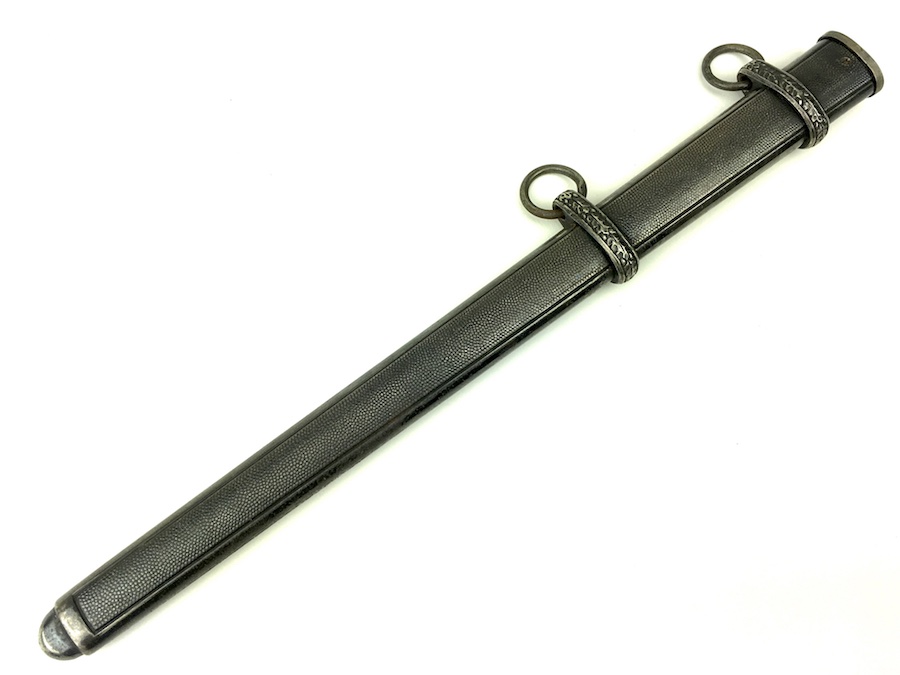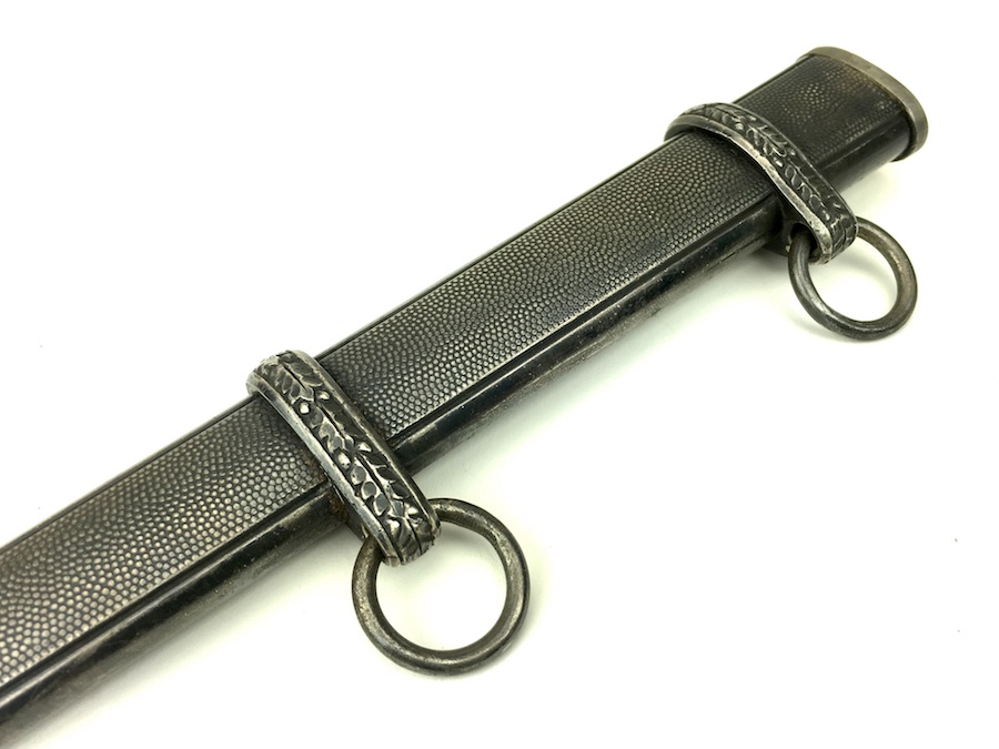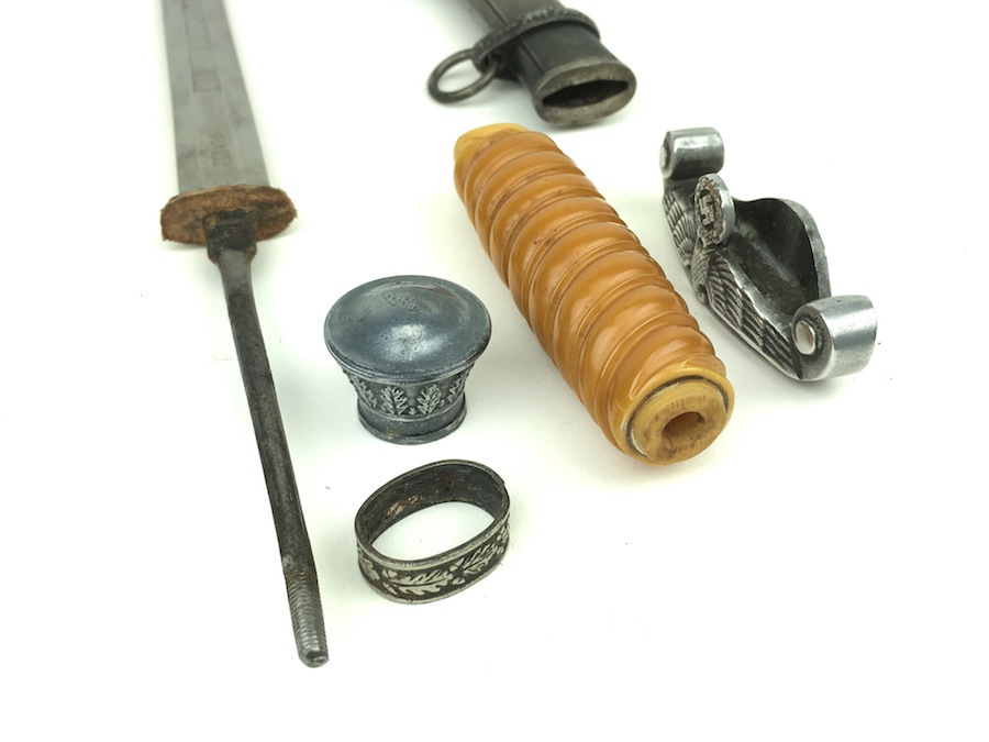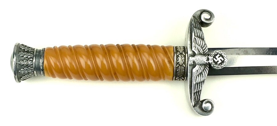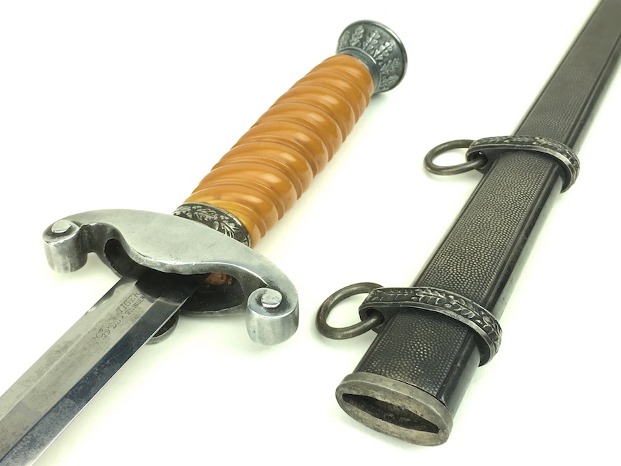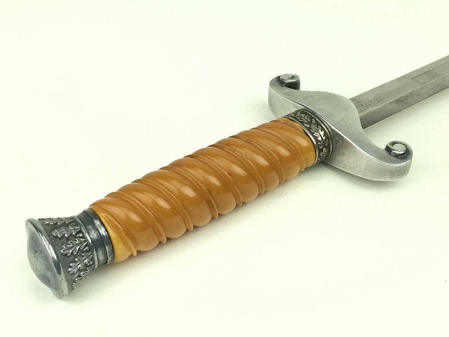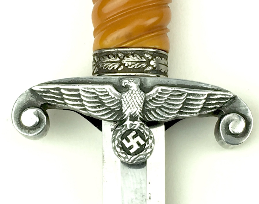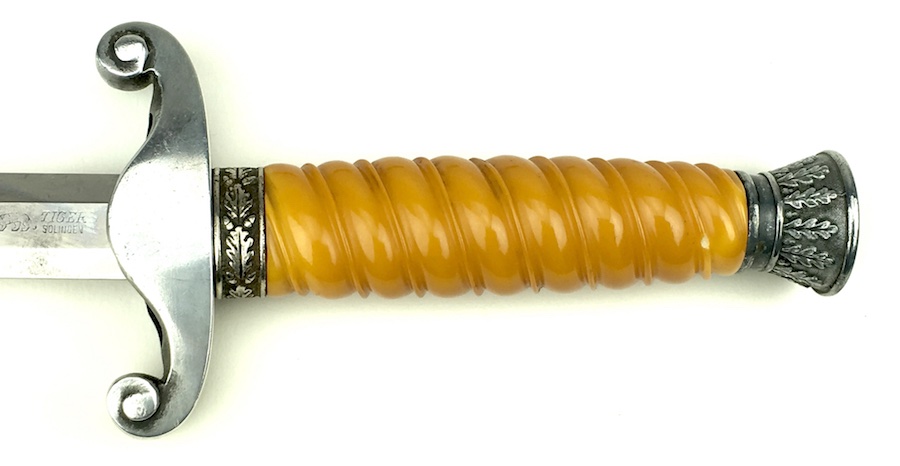 10/2/19 – Original and very good + condition Nazi Army dress dagger. Rare maker “Tiger” etched at the hilt of the 10-1/2″ blade. The blade is bright, but with some minor surface patina on each side. The cross-guard bird retains good detailing throughout. The grip is an elegant mid-tone orange and has a tiny chip near the pommel. The scabbard is in fine condition with no dents and a nice looking age patina. Guaranteed authentic.