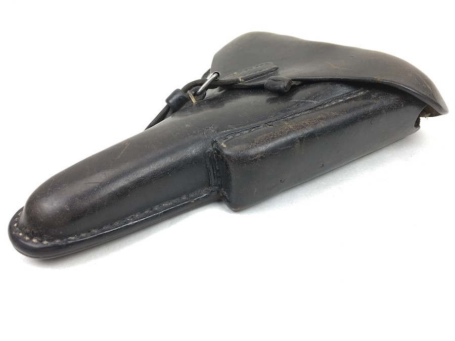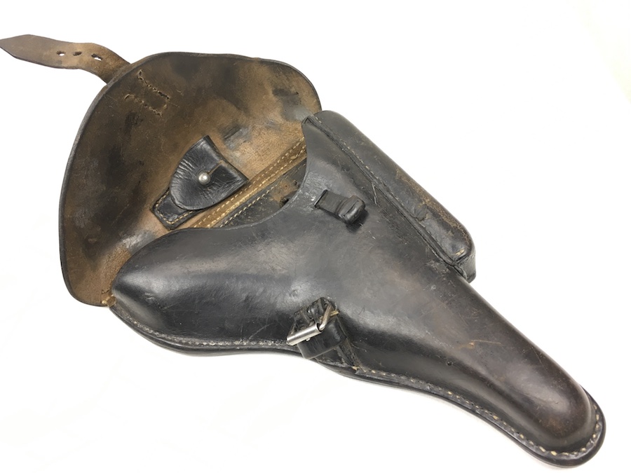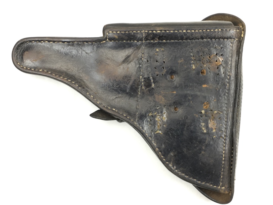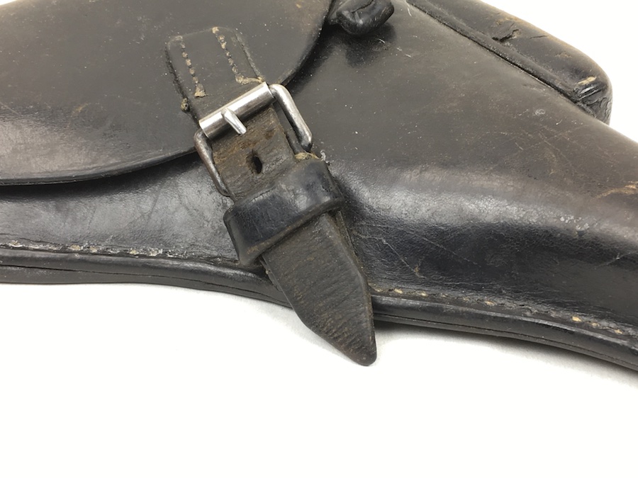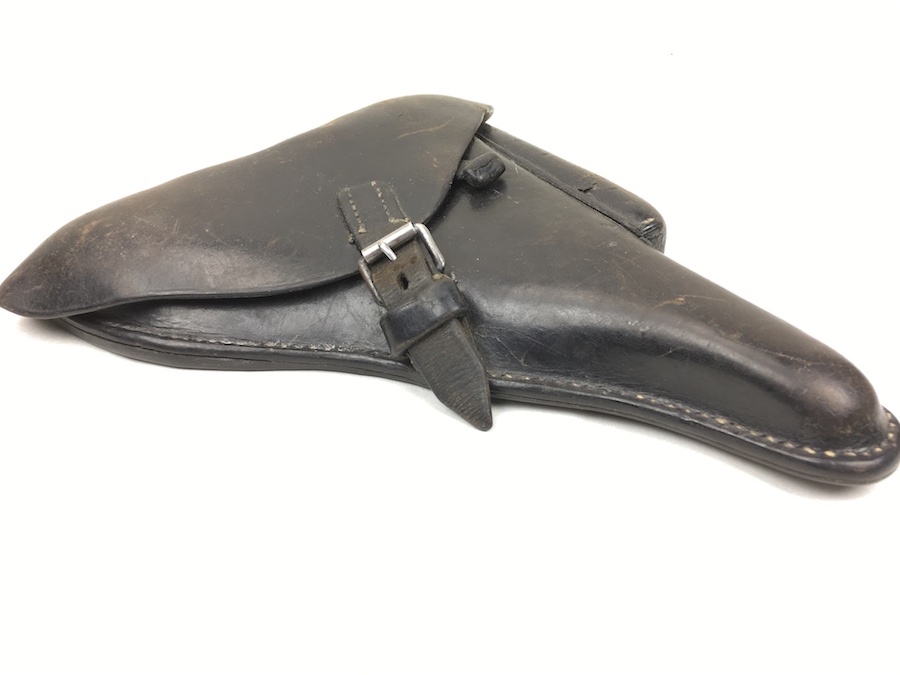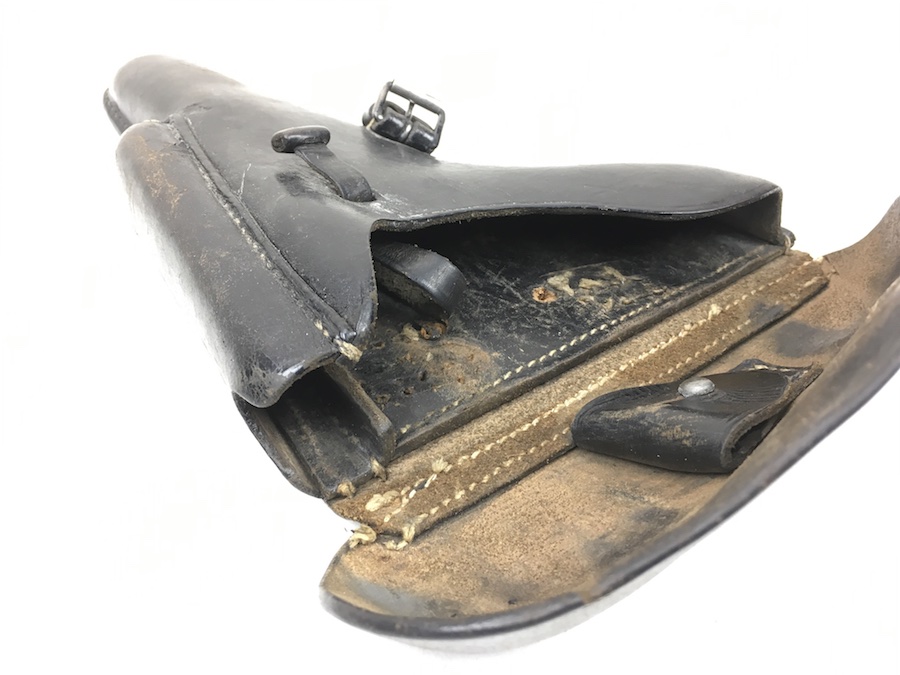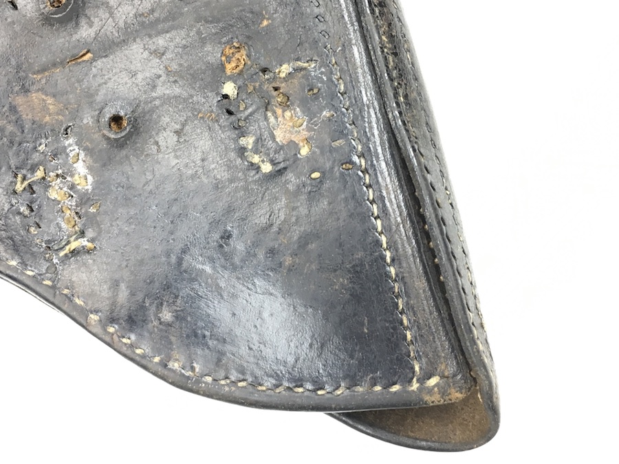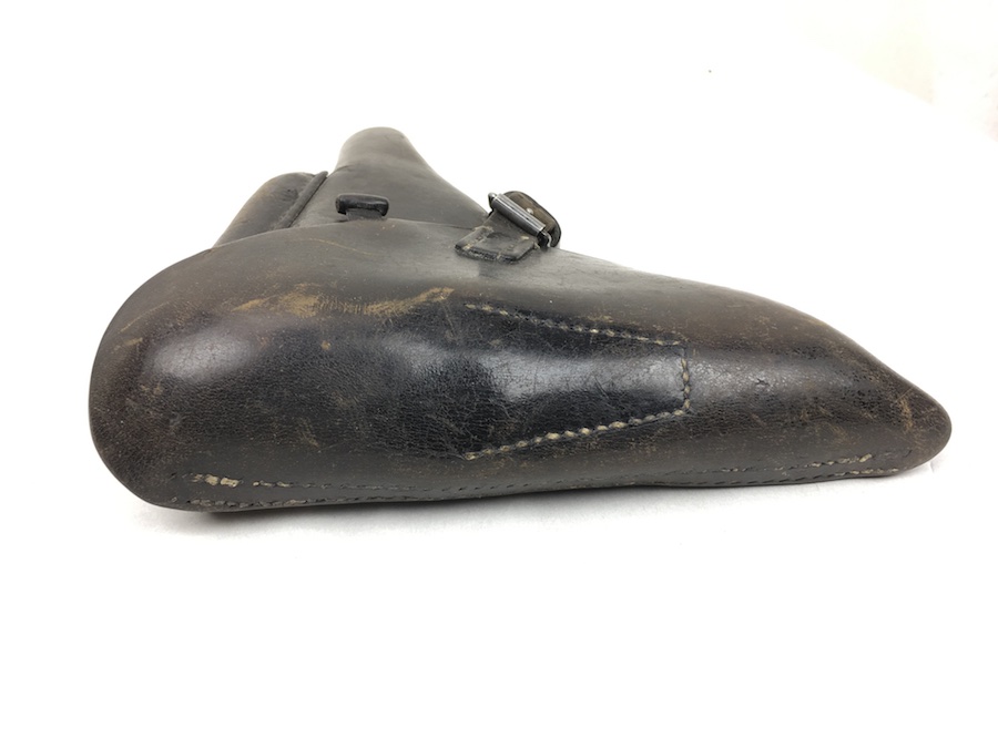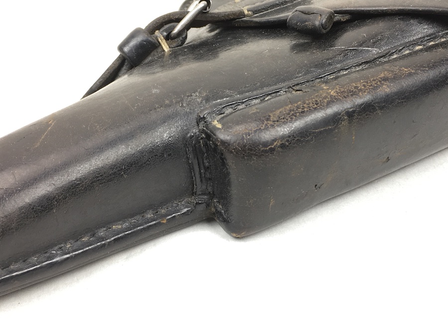 7/2/19 – Fair condition, WWII era holster for a Luger 9mm handgun. Closure strap is secure and functional. A few surface scuffs throughout. No maker stamp or date. Belt loops are missing. A few loose stitches on the lid. Lift strap is secure.