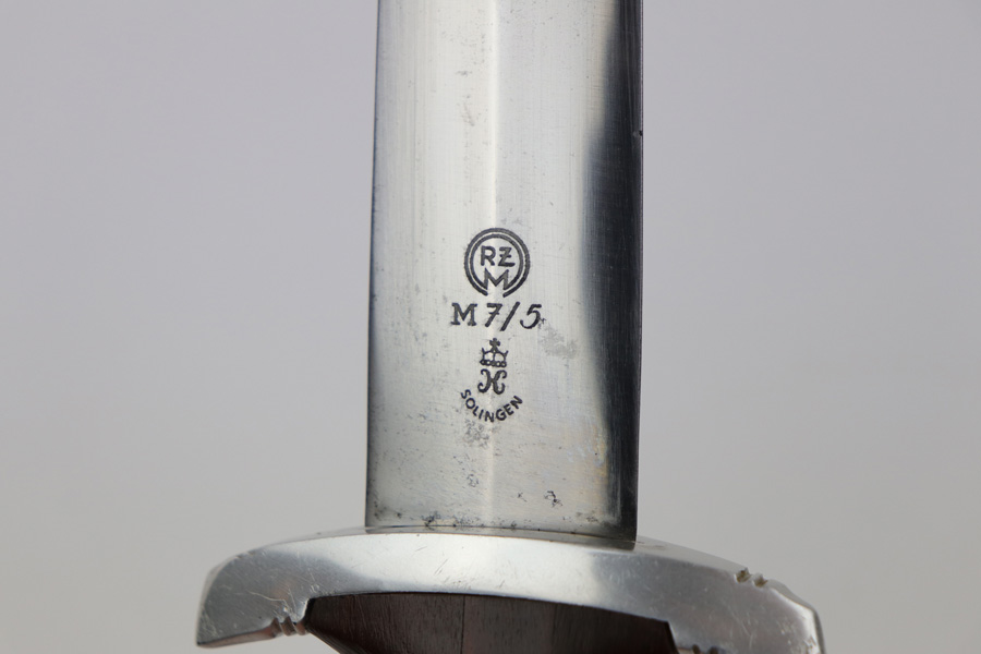 6/19/19 – This is an original WWII production SA Dagger with a fairly rare aluminum hilt. The aluminum hilt was used in the late 1930s as nickle was being rationed by the nazis. The scabbard upper and lower accents are nickle, but the hilt and pommel are aluminum. The blade is in excellent condition with the inscription on one side and a RZM stamp on the reverse. The M7/5 code is for Carl Julius Krebs. Excellent wood handle has no cracks or chips. Scabbard has a few minor spots of missing paint but overall is excellent. All original and authentic.