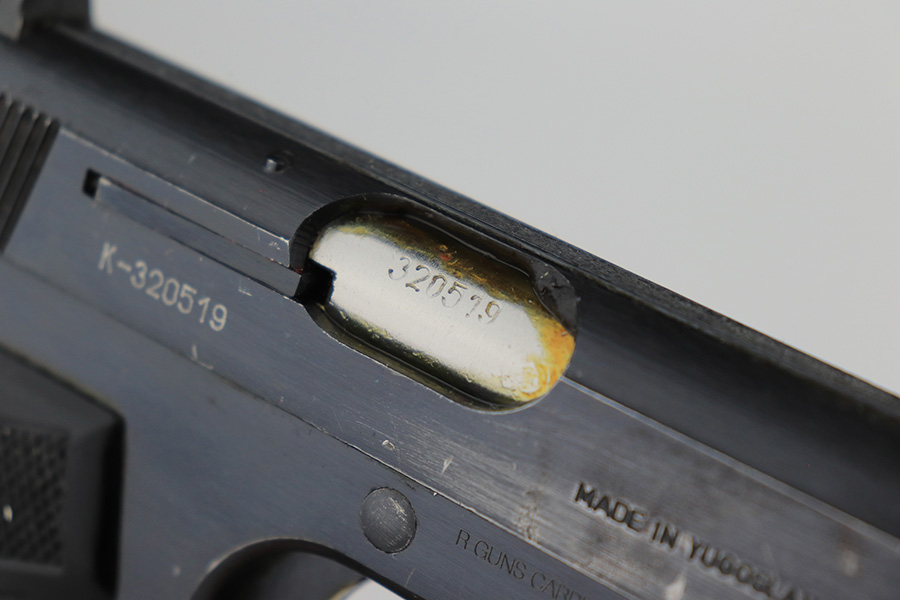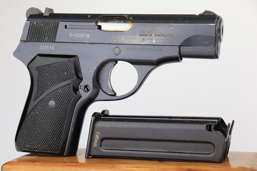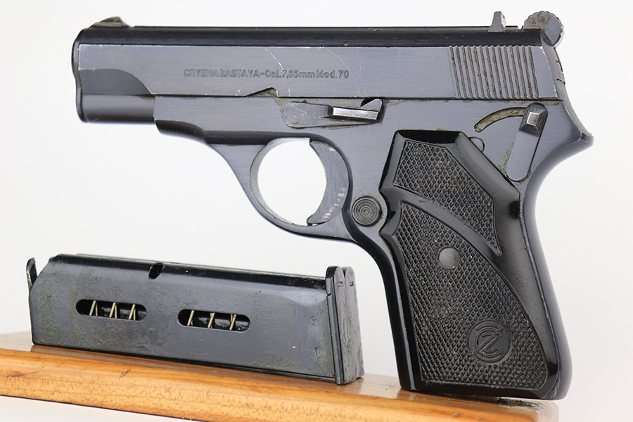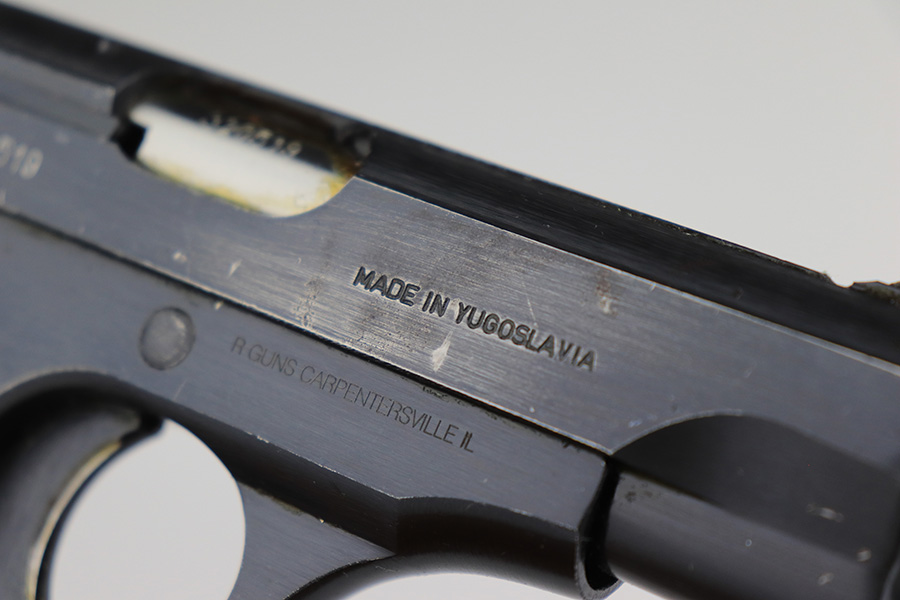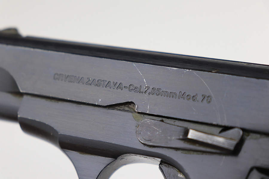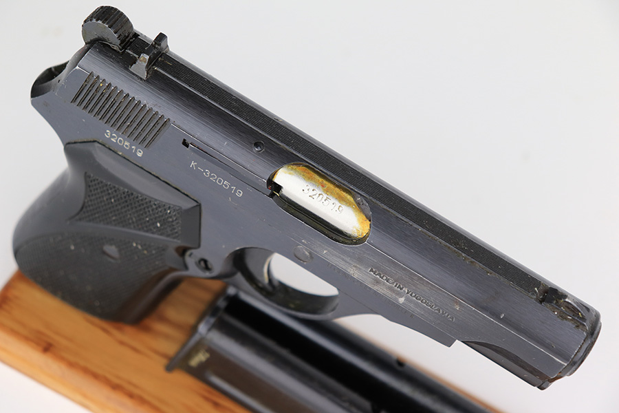 3/28/23 – This is an excellent example of a Yugo Zastava Model 70 chambered in 7.65mm. It comes with a cleaning rod and two magazines. The gun is matching but has an import mark on the right side of the frame. It has retained about 97% of its finish with an area of wear on the right side of the slide and some light scratches on the left side of the slide and on the front strap. Very nice black plastic grips. Mint bore. The internals are covered in cosmoline and need a gun cleaning.