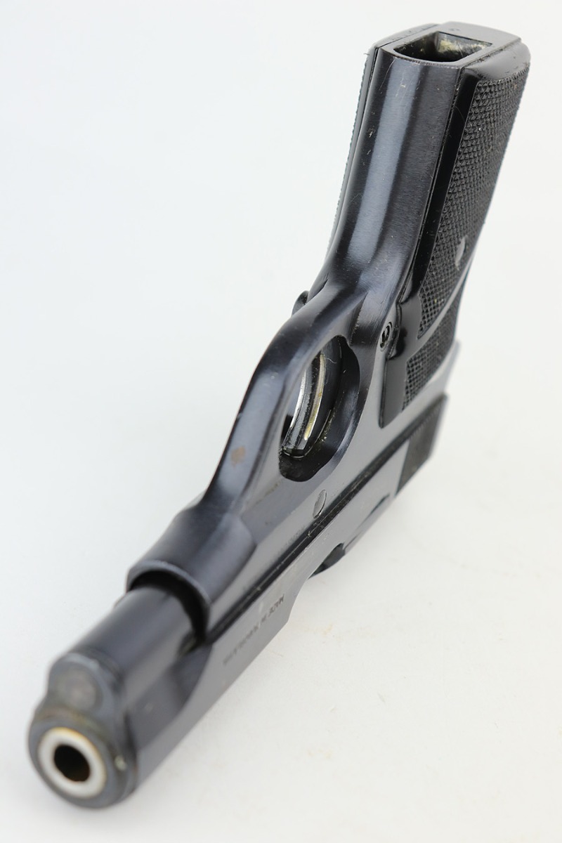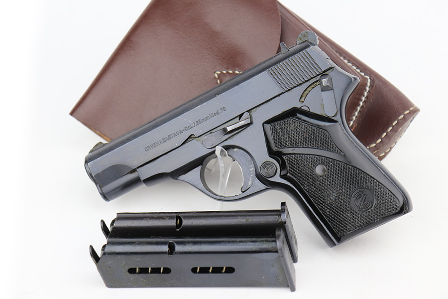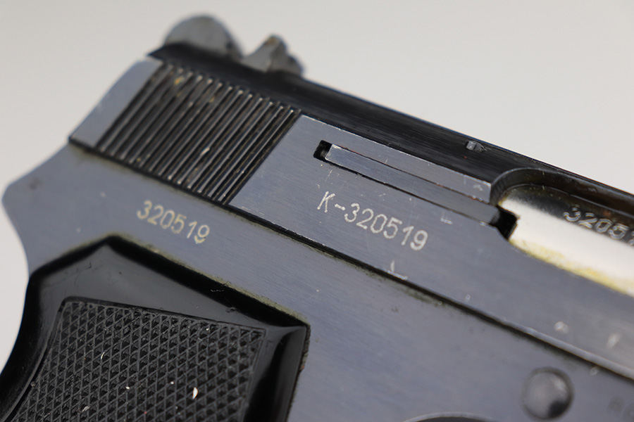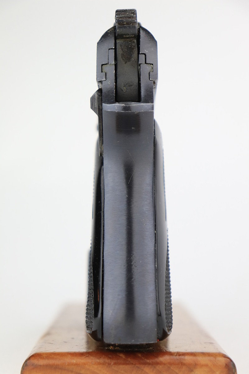 3/28/23 – This is an excellent example of a Yugo Zastava Model 70 chambered in 7.65mm. It comes with a cleaning rod and two magazines. The gun is matching but has an import mark on the right side of the frame. It has retained about 97% of its finish with an area of wear on the right side of the slide and some light scratches on the left side of the slide and on the front strap. Very nice black plastic grips. Mint bore. The internals are covered in cosmoline and need a gun cleaning.