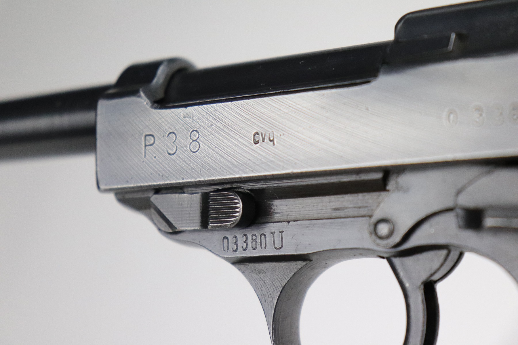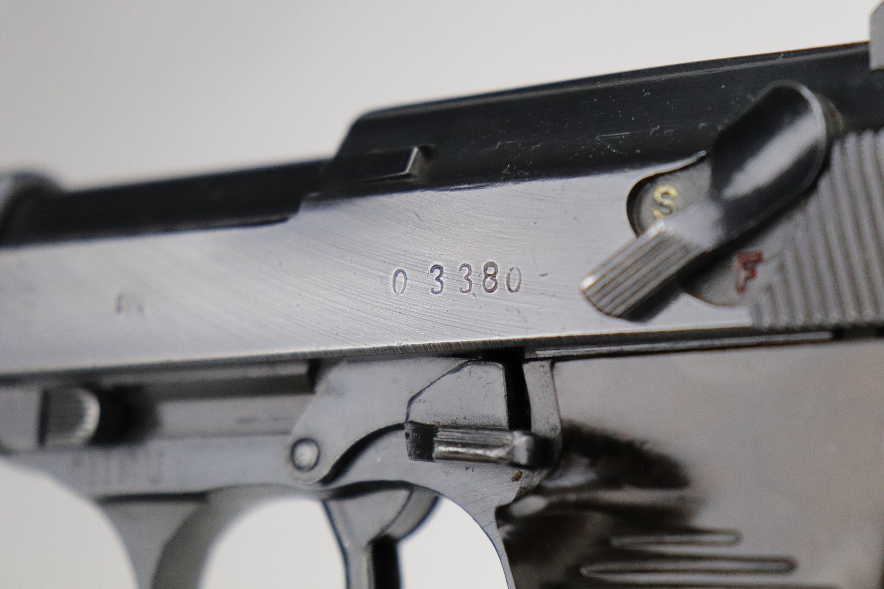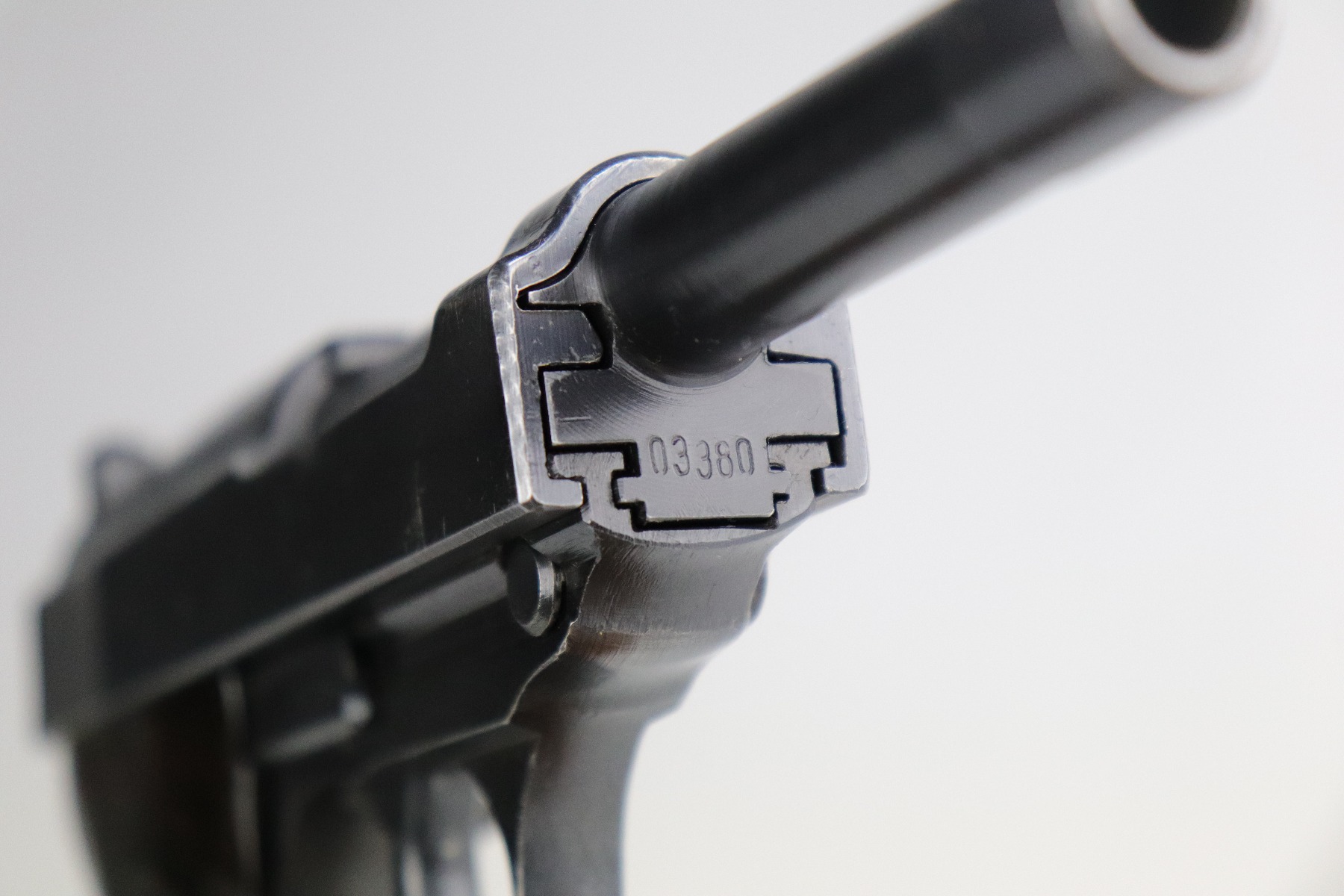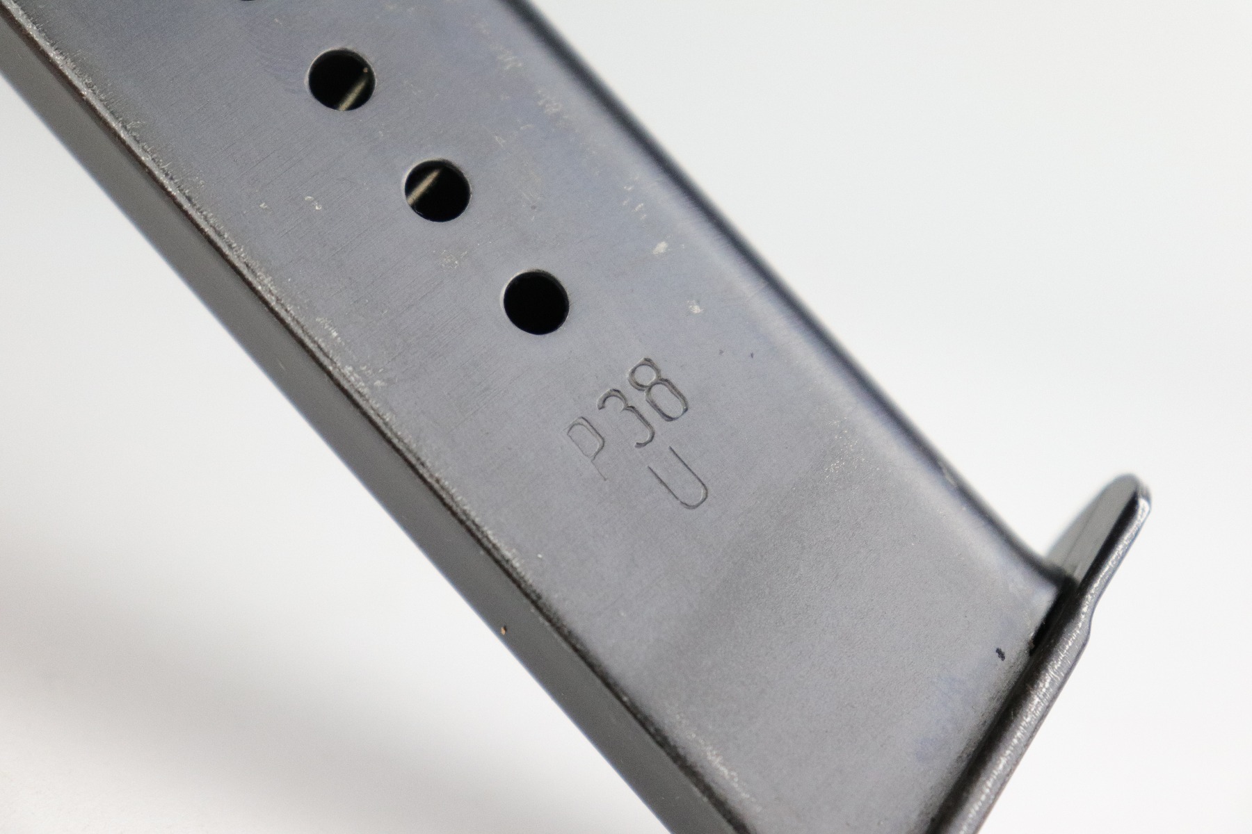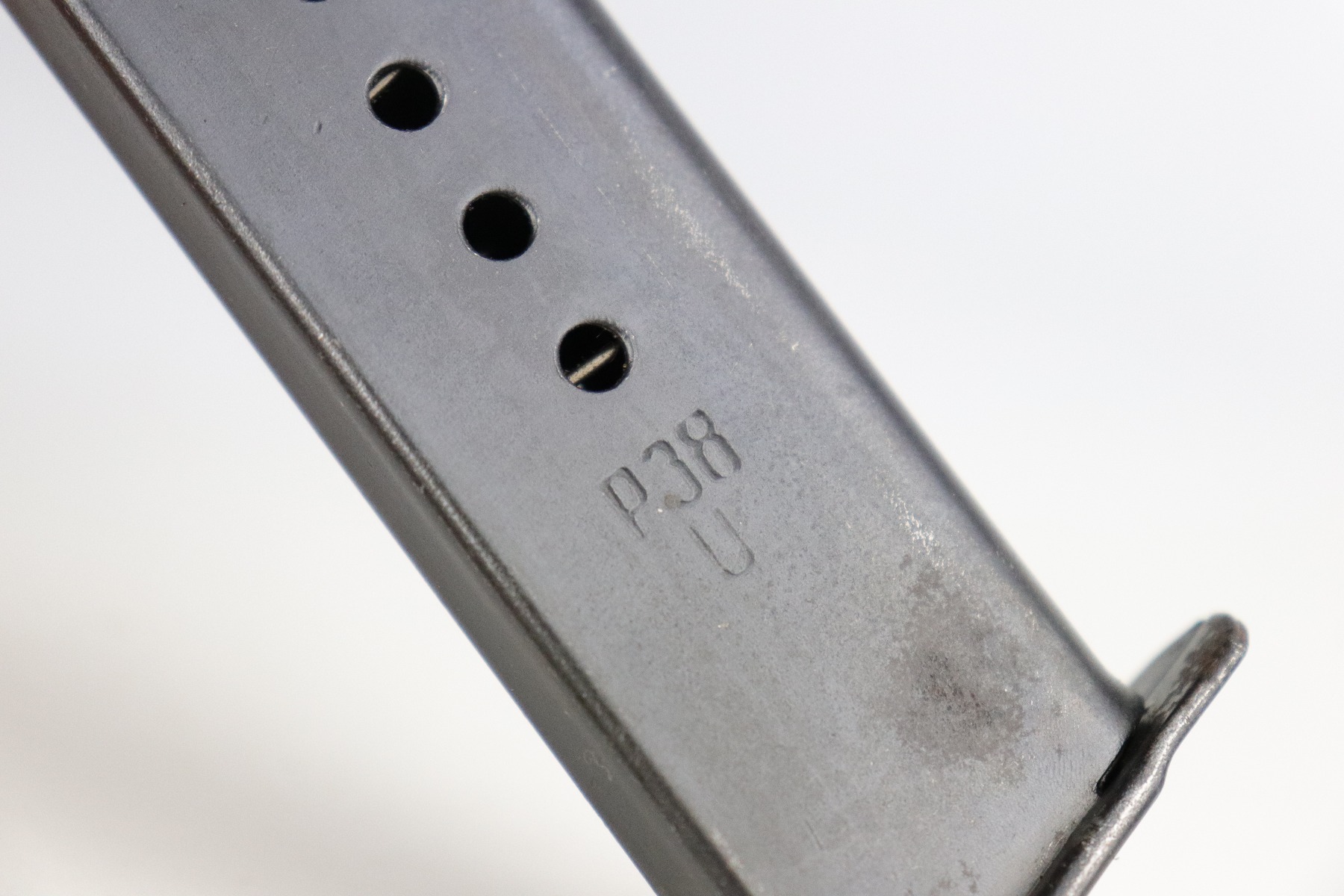 8/31/20 – This is a zero-prefix Spreewerk P.38 rig, issued to the Nazi military in 1945. The gun comes with a minty, 1944-dated pebble-grain holster and two “U”-marked magazines. The gun is all matching and has the proper “Eagle 88” Nazi military acceptance proofs. The right side of the slide is marked “U”. The nature of the rough machining on these Spreewerk guns makes the finish on this particular example difficult to rate, but our best approximation is about 90%. There is thinning in the finish, most noticeable on the left side of the slide and front strap. There are a few very light scratches on the right side of the slide. The de-cocker is broken, but the rest of the gun is functional. The holster is waffenamt and in minty condition – just a few scuffs on the belt loops. The bore has decent rifling but there is freckling throughout. Excellent period-correct grips.