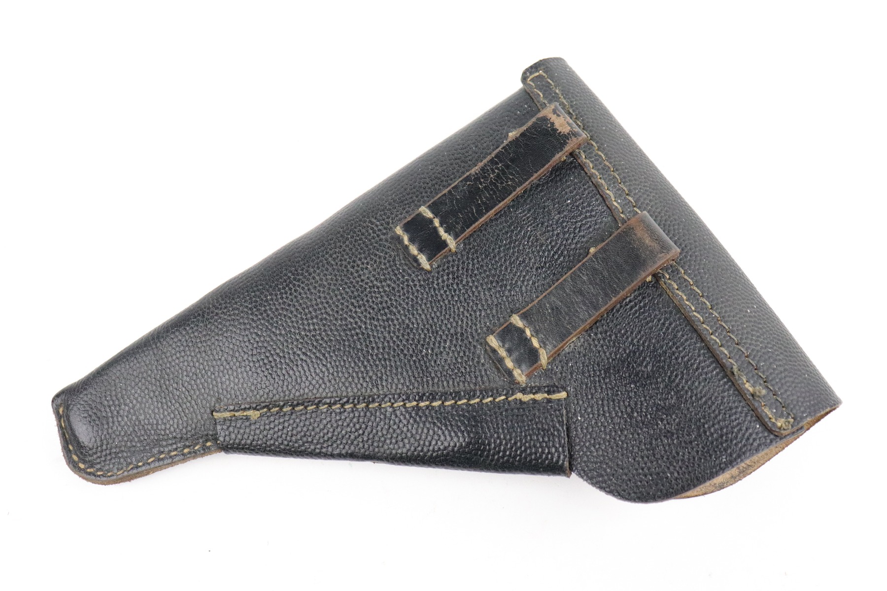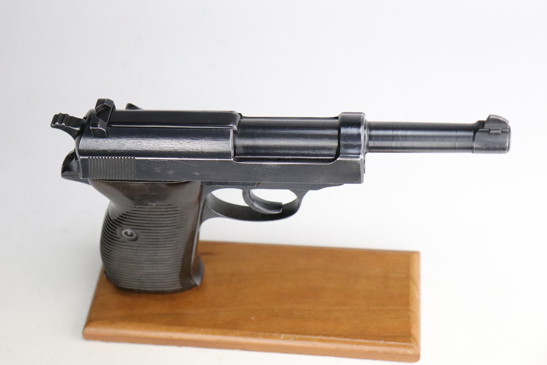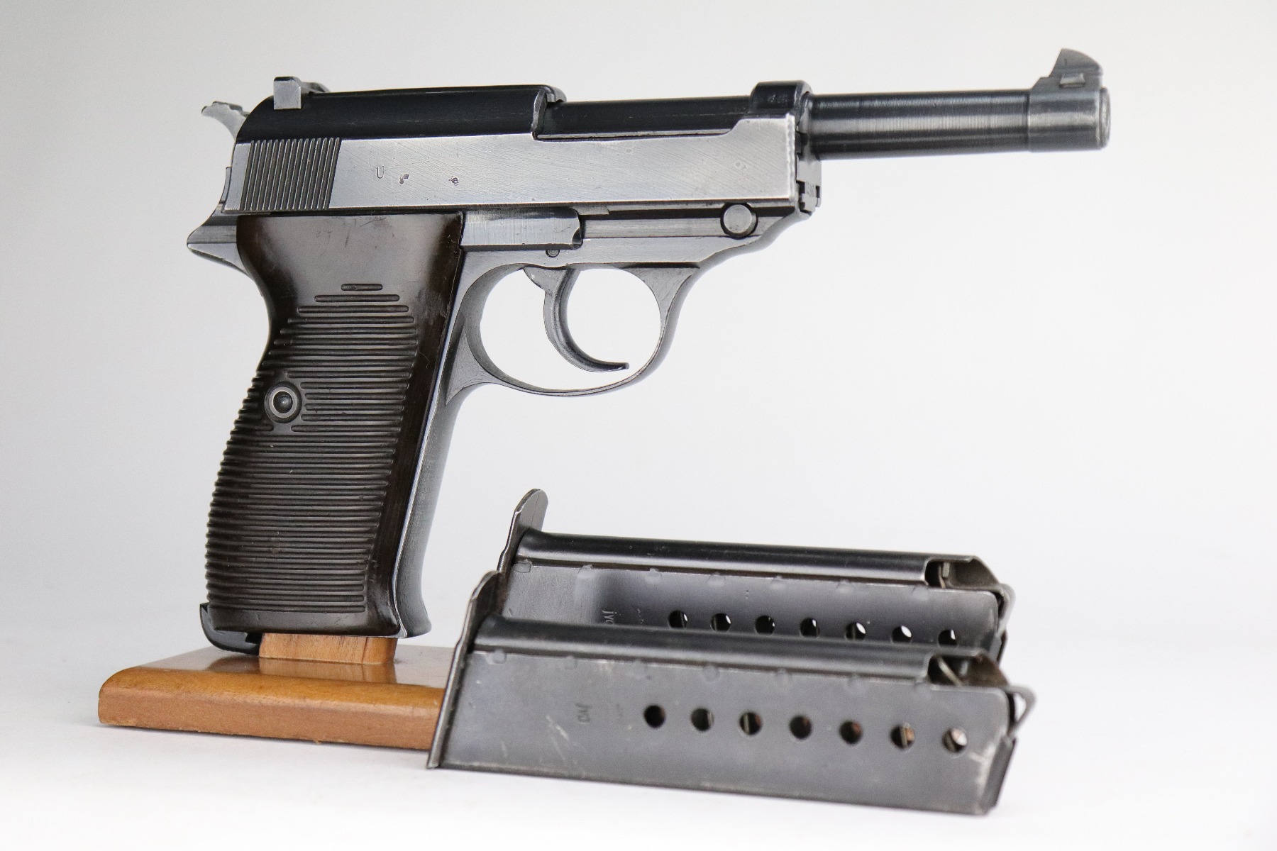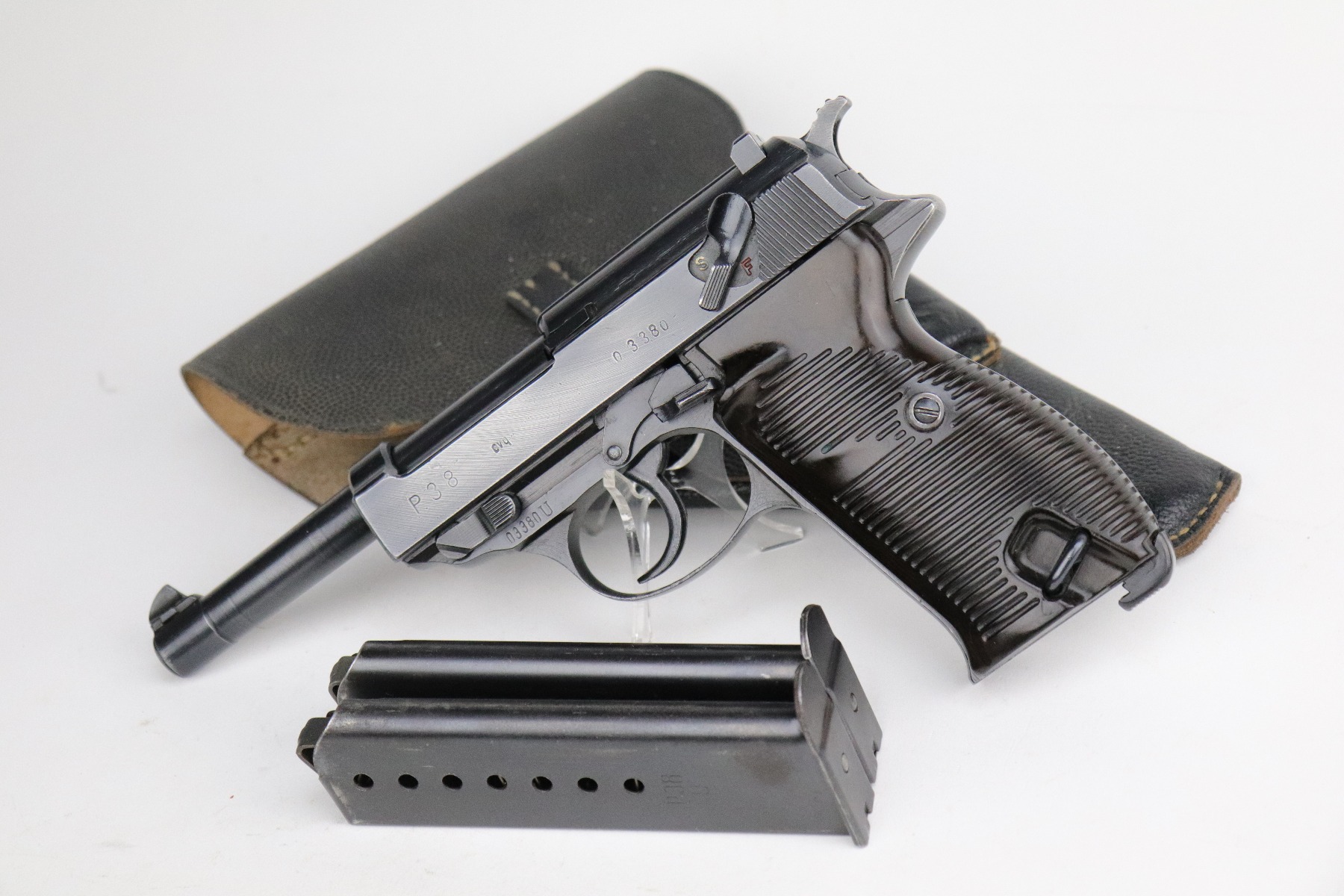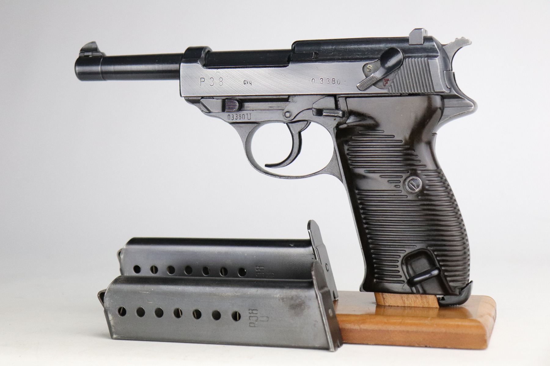 8/31/20 – This is a zero-prefix Spreewerk P.38 rig, issued to the Nazi military in 1945. The gun comes with a minty, 1944-dated pebble-grain holster and two “U”-marked magazines. The gun is all matching and has the proper “Eagle 88” Nazi military acceptance proofs. The right side of the slide is marked “U”. The nature of the rough machining on these Spreewerk guns makes the finish on this particular example difficult to rate, but our best approximation is about 90%. There is thinning in the finish, most noticeable on the left side of the slide and front strap. There are a few very light scratches on the right side of the slide. The de-cocker is broken, but the rest of the gun is functional. The holster is waffenamt and in minty condition – just a few scuffs on the belt loops. The bore has decent rifling but there is freckling throughout. Excellent period-correct grips.