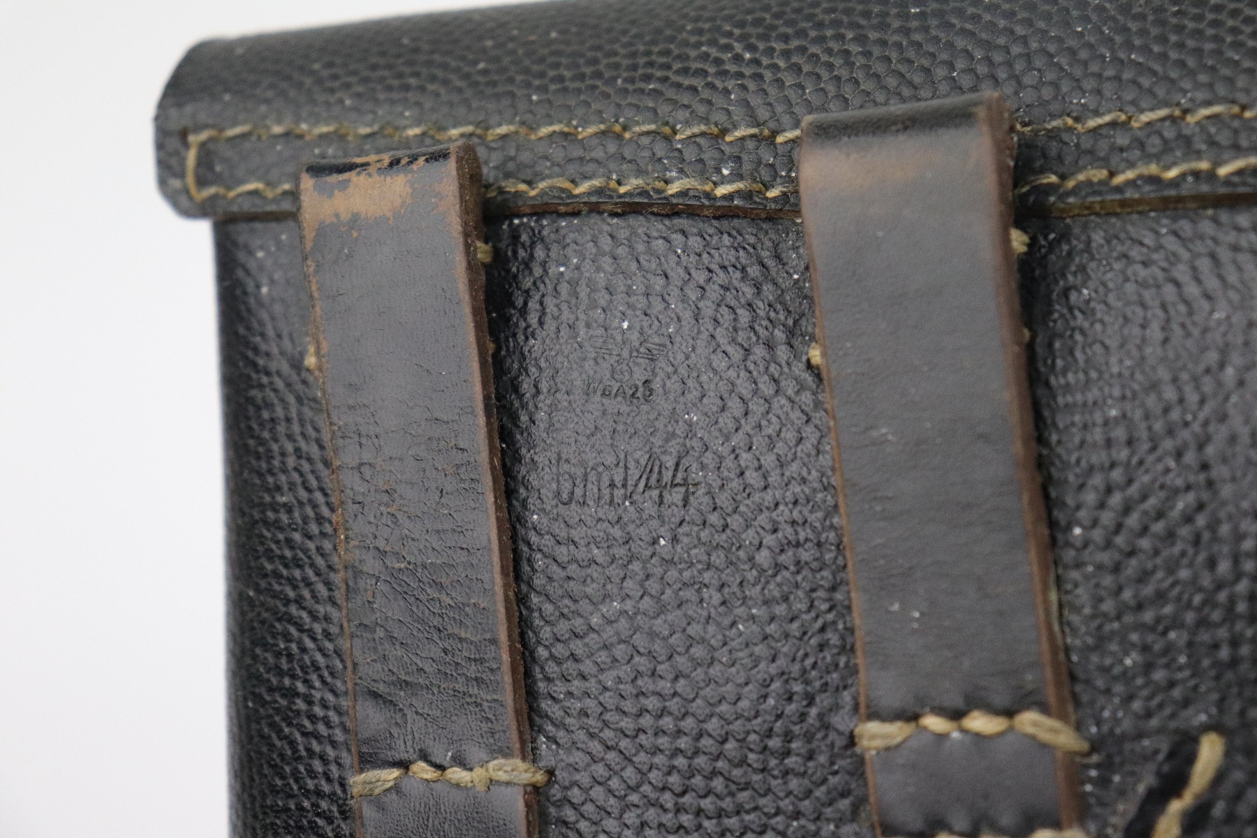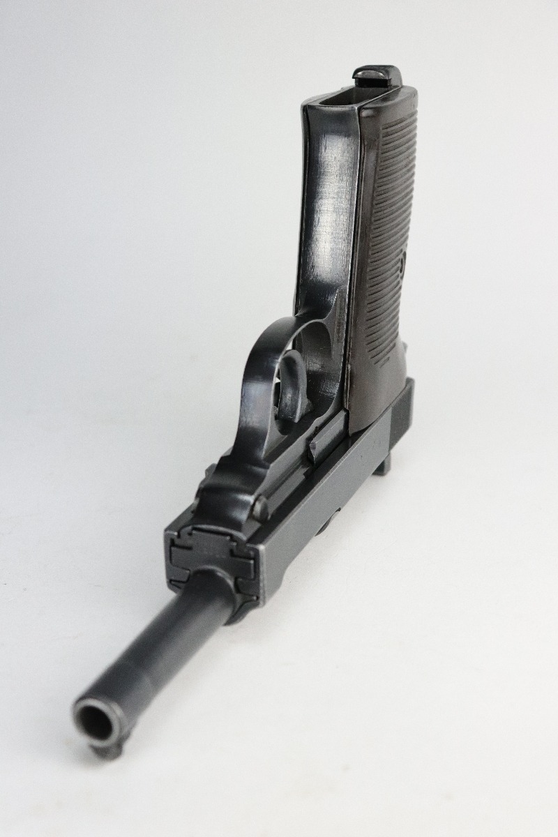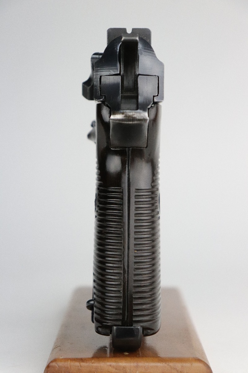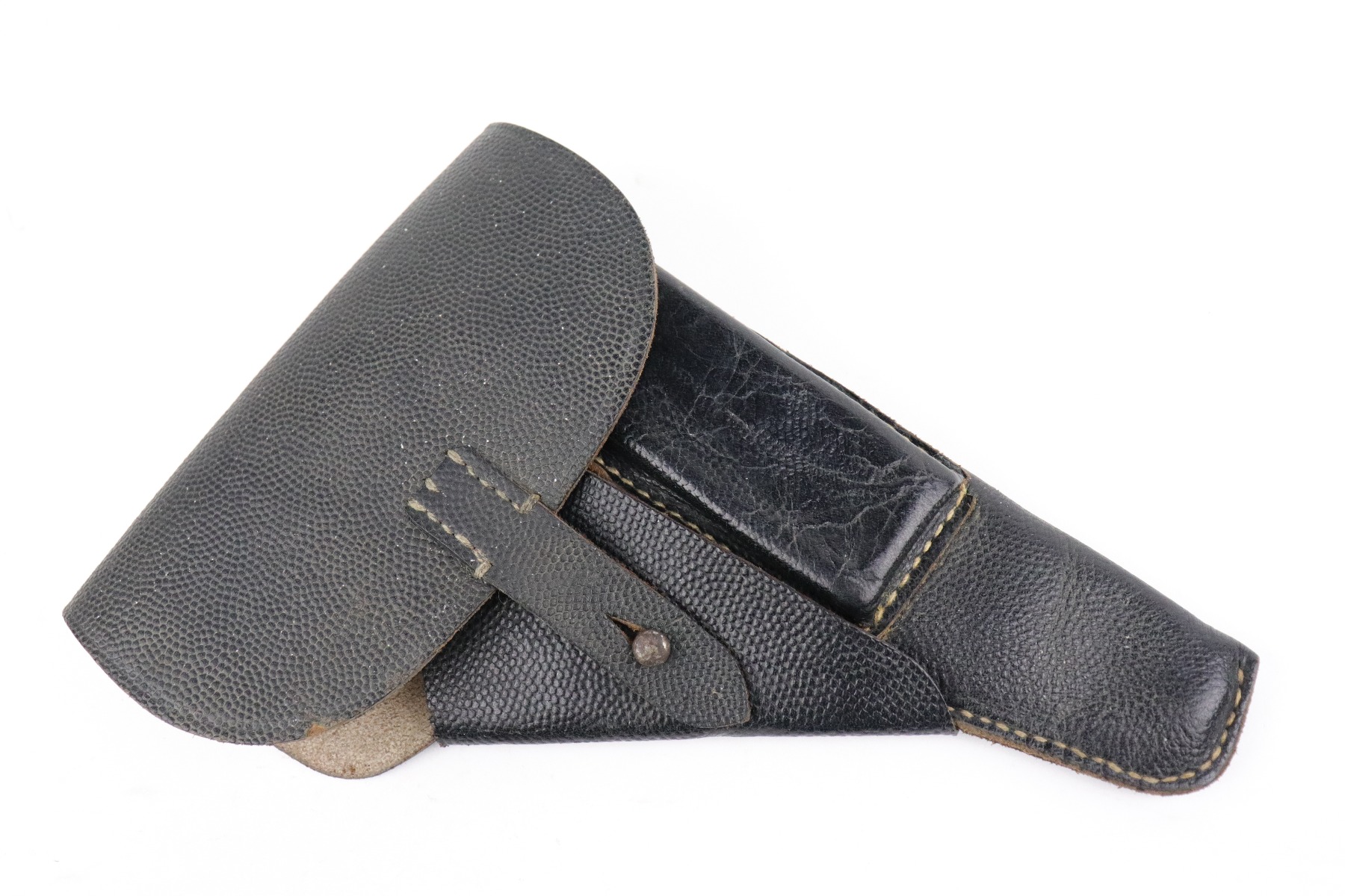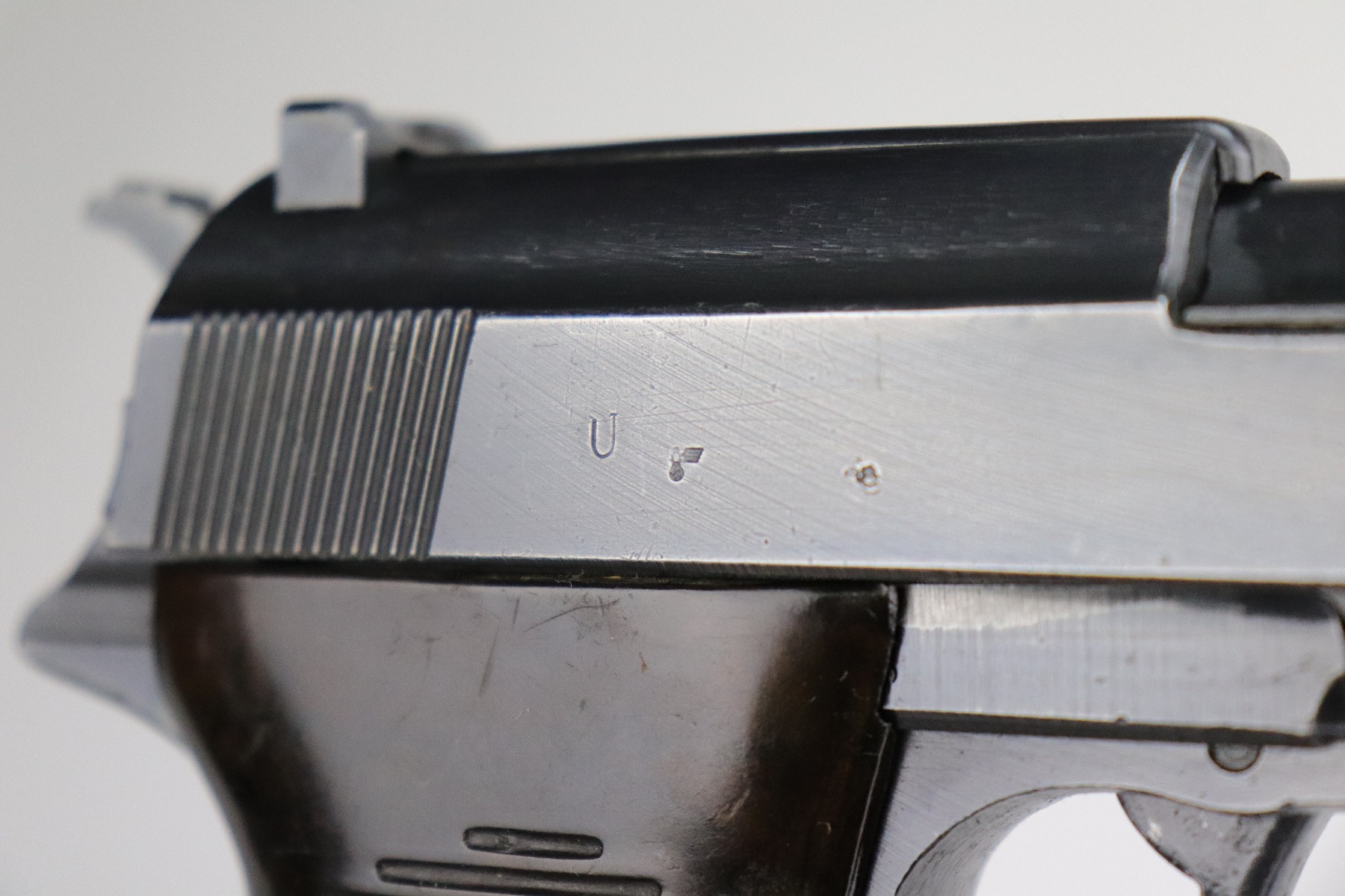 8/31/20 – This is a zero-prefix Spreewerk P.38 rig, issued to the Nazi military in 1945. The gun comes with a minty, 1944-dated pebble-grain holster and two “U”-marked magazines. The gun is all matching and has the proper “Eagle 88” Nazi military acceptance proofs. The right side of the slide is marked “U”. The nature of the rough machining on these Spreewerk guns makes the finish on this particular example difficult to rate, but our best approximation is about 90%. There is thinning in the finish, most noticeable on the left side of the slide and front strap. There are a few very light scratches on the right side of the slide. The de-cocker is broken, but the rest of the gun is functional. The holster is waffenamt and in minty condition – just a few scuffs on the belt loops. The bore has decent rifling but there is freckling throughout. Excellent period-correct grips.