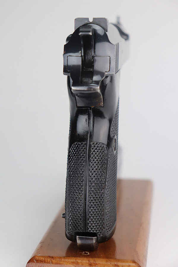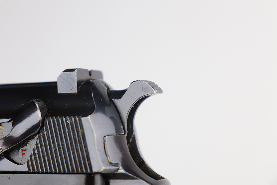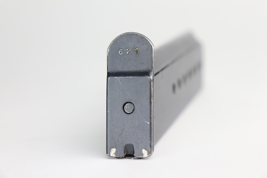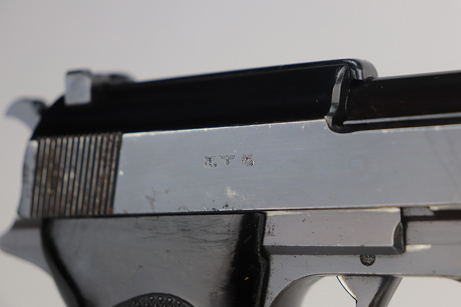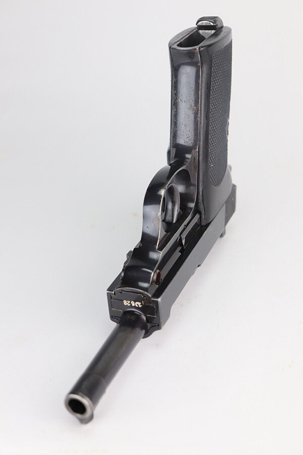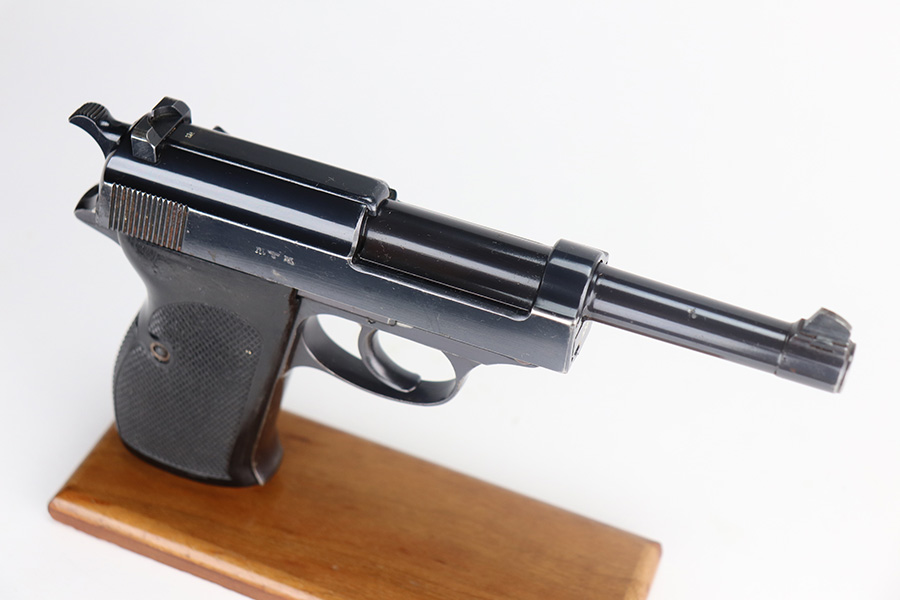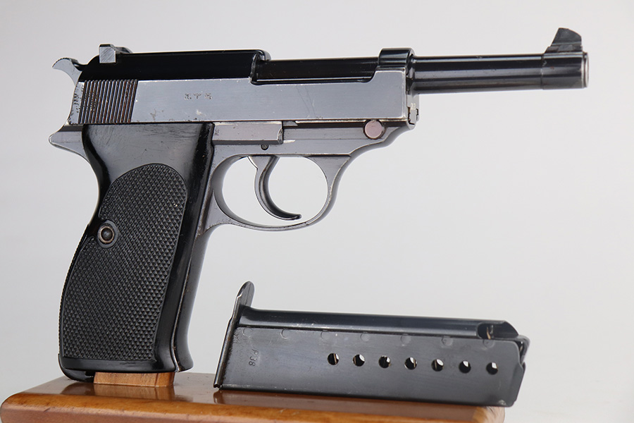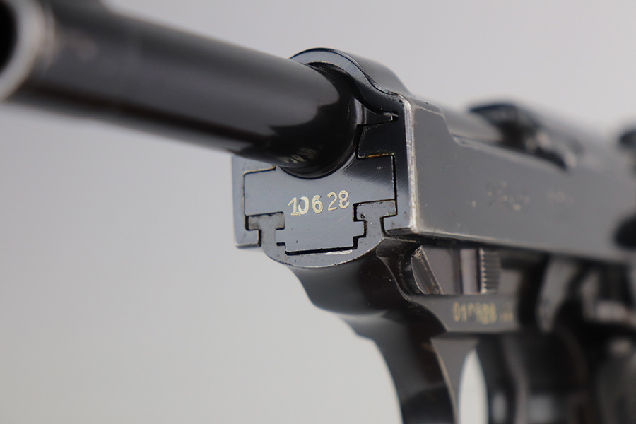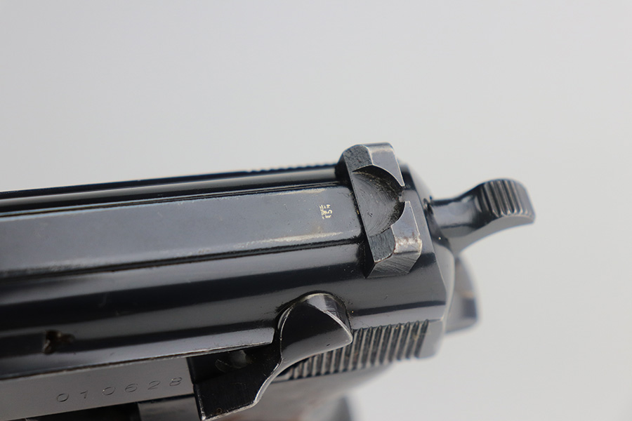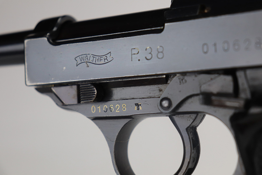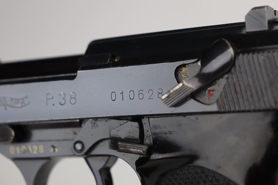 5/25/21 – This is an excellent example of an early, third variation Zero Series Walther P.38 issued to the Nazi military in 1940. The gun is all matching and has the proper “Eagle 359” military proofs throughout, even on the small parts. It has retained about 94-95% of its original high polish bluing. There is minor wear on the high edges of the slide and around the muzzle. There are some handling marks on both sides of the slide. There are areas of pitting on the right side of the slide and on the front strap. Comes with nice matching grips (some light scratches) and a matching magazine that we believe is not original to the gun. Very nice bore with strong rifling and minor freckling in the grooves. De-cocker is a little stiff but functional.